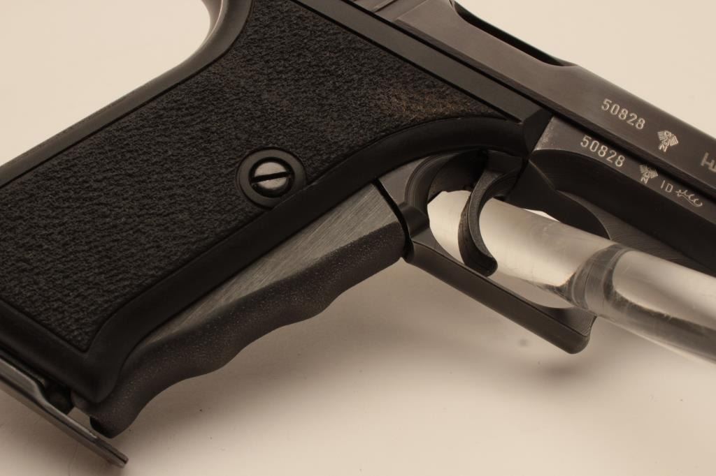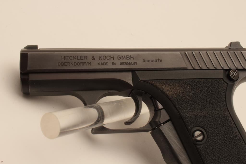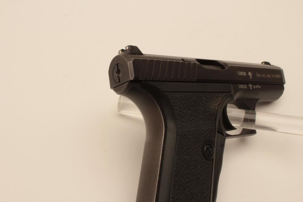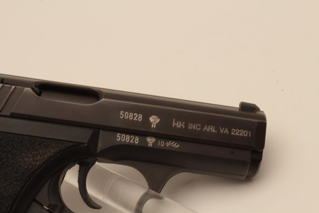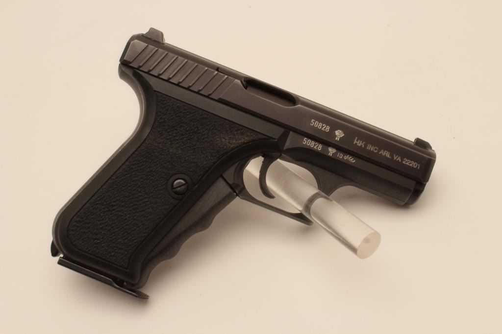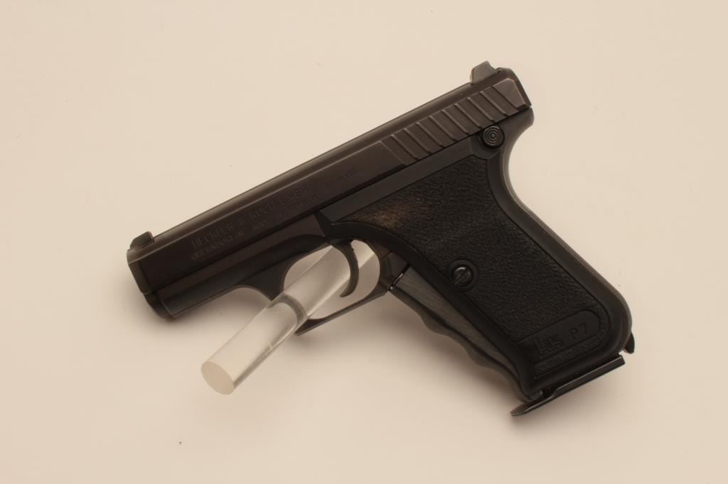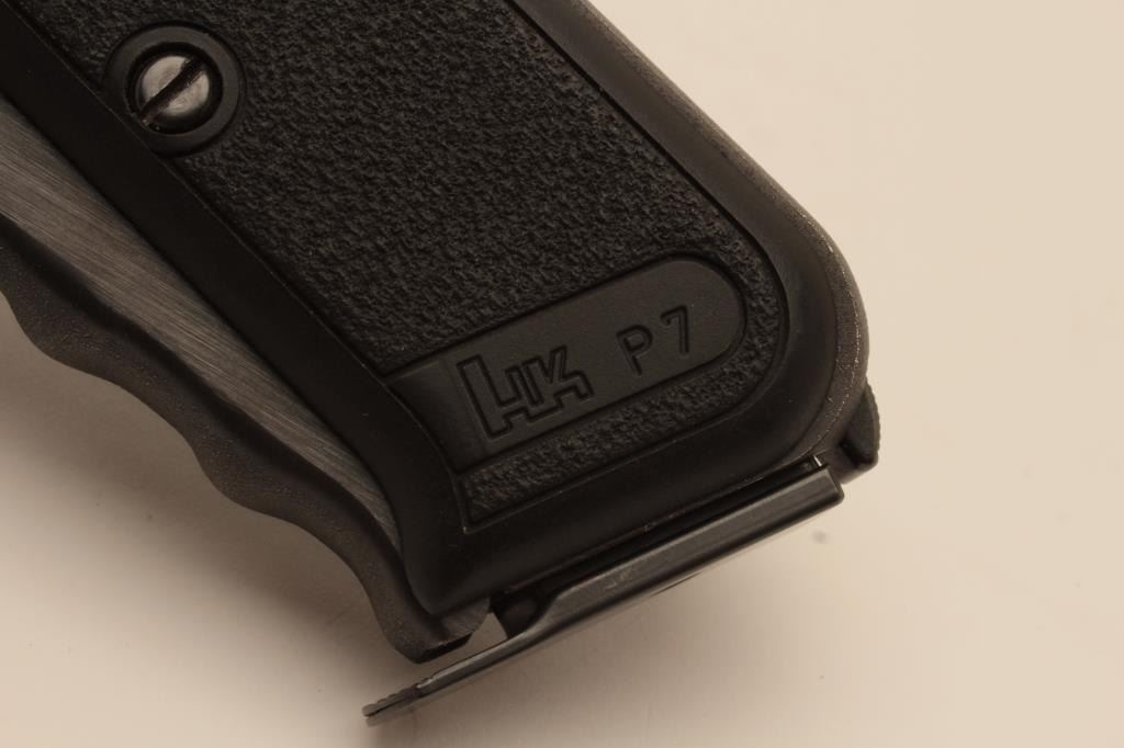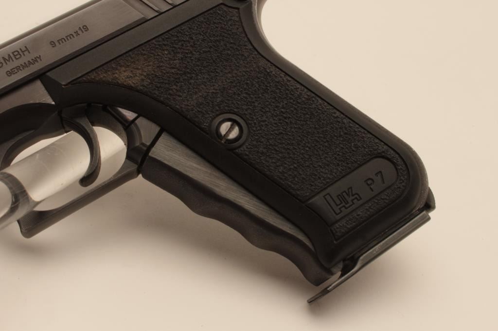 18BM-52 H&K P7Heckler Koch P7 squeeze cocking pistol, 9mm, #50828, 4" barrel, matte black finish with pebble textured logo grips. Pistol is in fine condition overall, showing 95% original finish, bore is excellent, action is good.No longer in production and highly sought after. Includes one mag and Milt Sparks left handed holster. (Modern / PPT) Est. $800-1600Heckler Koch P7 squeeze cocking pistol, 9mm, #50828, 4" barrel, matte black finish with pebble textured logo grips. Pistol is in fine condition overall, showing 95% original finish, bore is excellent, action is good.No longer in production and highly sought after. Includes one mag and Milt Sparks left handed holster. (Modern / PPT) Est. $800-1600