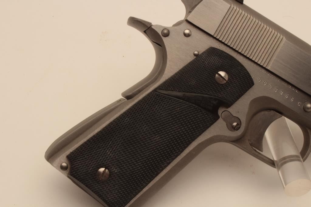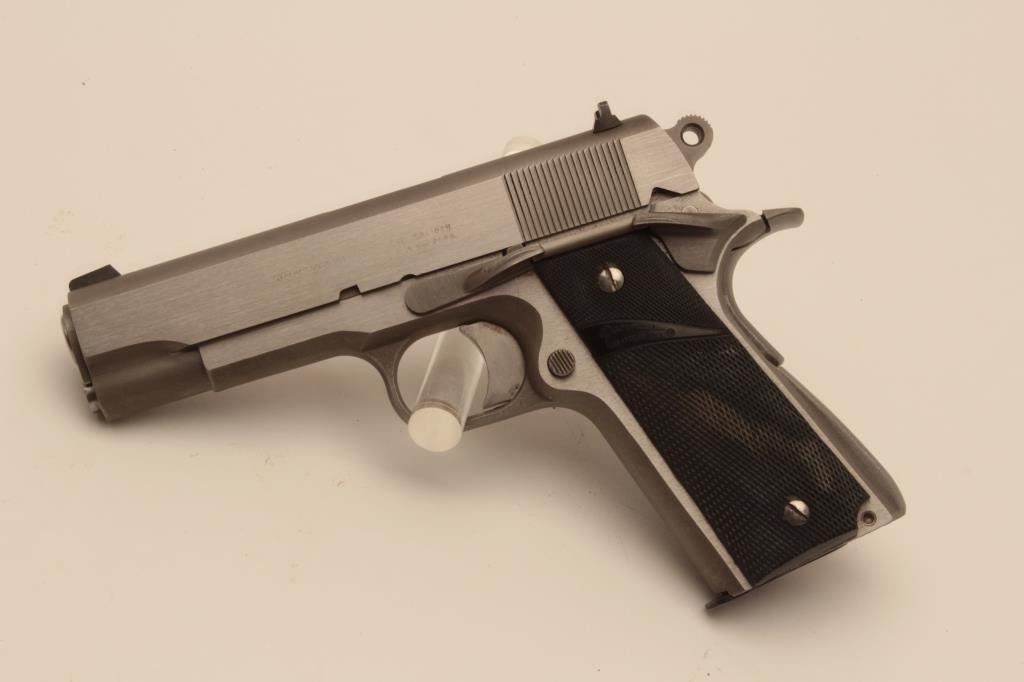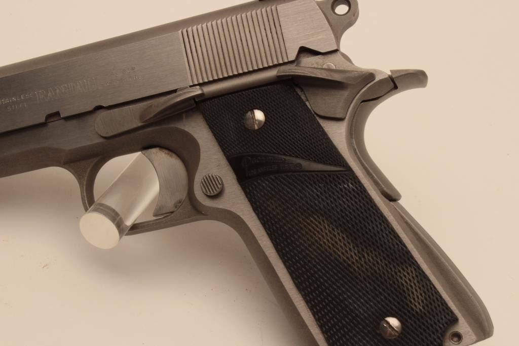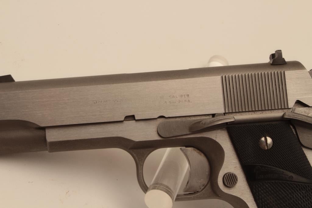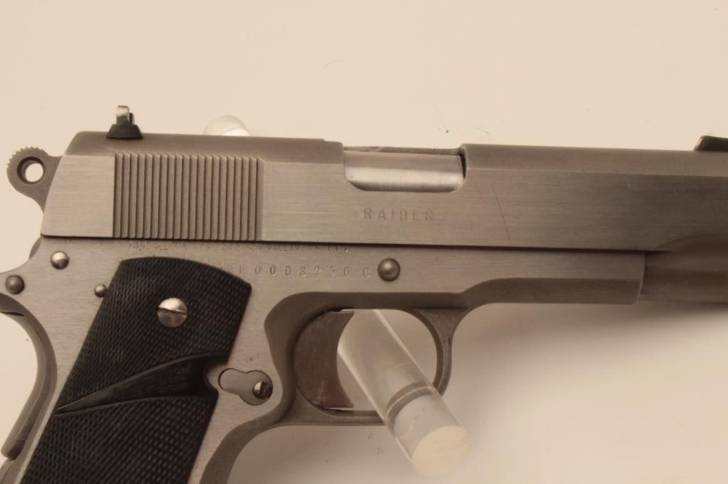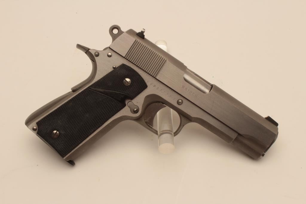 18BM-39 RANDALL RAIDEREarly Randall Raider stainless 9mm semi automatic pistol, #RF0003256C, 4 1/4" barrel, drift adjustable sights, Pachmayr grips. This out of production Randall pistol is in fine condition overall, excellent riflingwith a crisp action. Includes one mag. (Modern / PPT) Est. $600-1200Early Randall Raider stainless 9mm semi automatic pistol, #RF0003256C, 4 1/4" barrel, drift adjustable sights, Pachmayr grips. This out of production Randall pistol is in fine condition overall, excellent riflingwith a crisp action. Includes one mag. (Modern / PPT) Est. $600-1200
