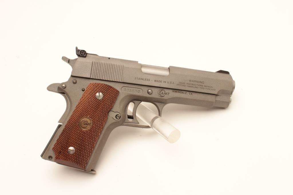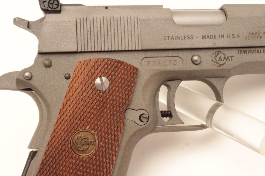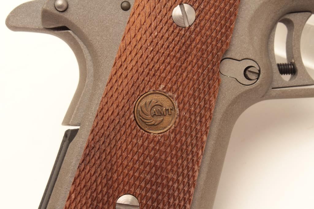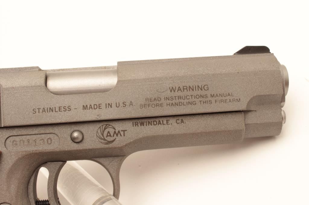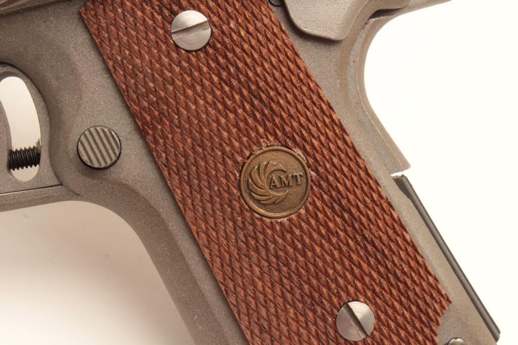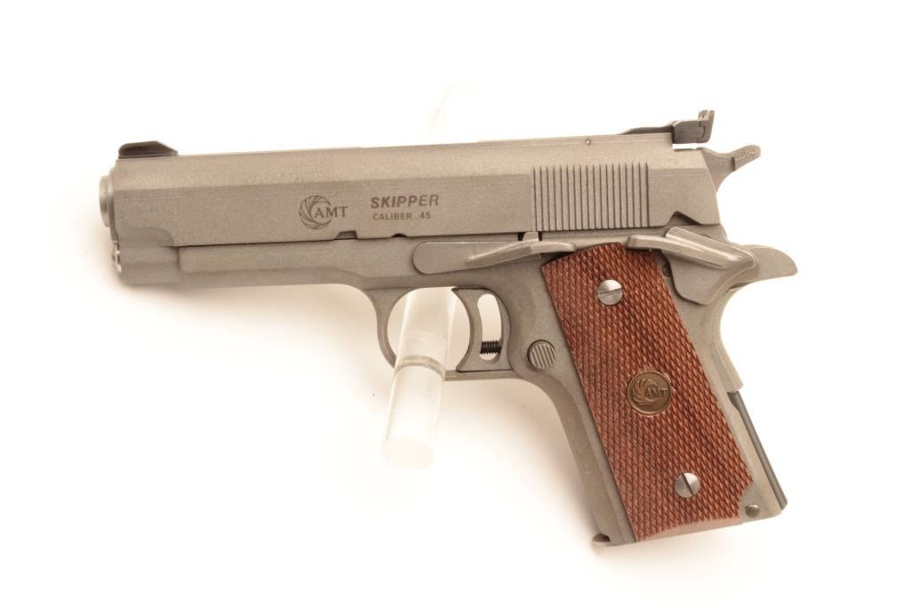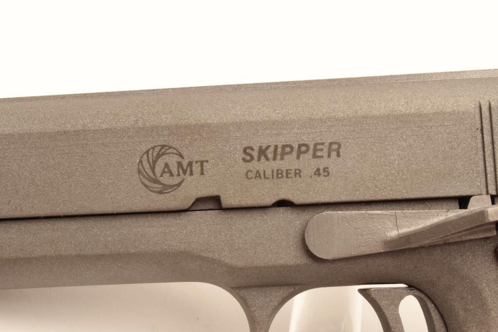 18BM-55 AMT "SKIPPER"AMT Skipper .45 ACP cal., compact stainless semi auto pistol, #G01130, 4 1/4" barrel, adjustable trigger, adjustable sights, checkered medallion grips. Pistol is in as new condition, excellent bore and action.Includes one mag and original box in in very good condition. (Modern / PPT) Est. $400-800AMT Skipper .45 ACP cal., compact stainless semi auto pistol, #G01130, 4 1/4" barrel, adjustable trigger, adjustable sights, checkered medallion grips. Pistol is in as new condition, excellent bore and action.Includes one mag and original box in in very good condition. (Modern / PPT) Est. $400-800