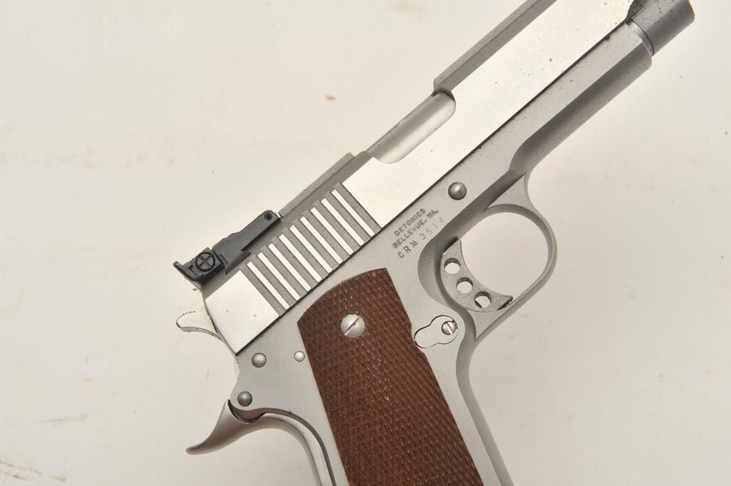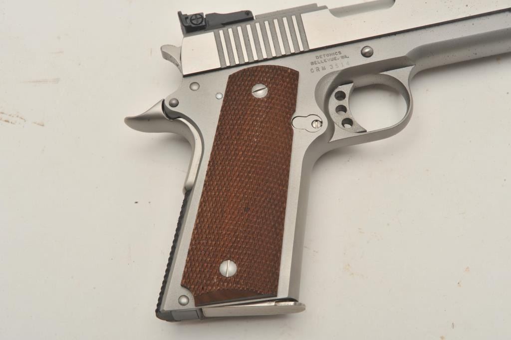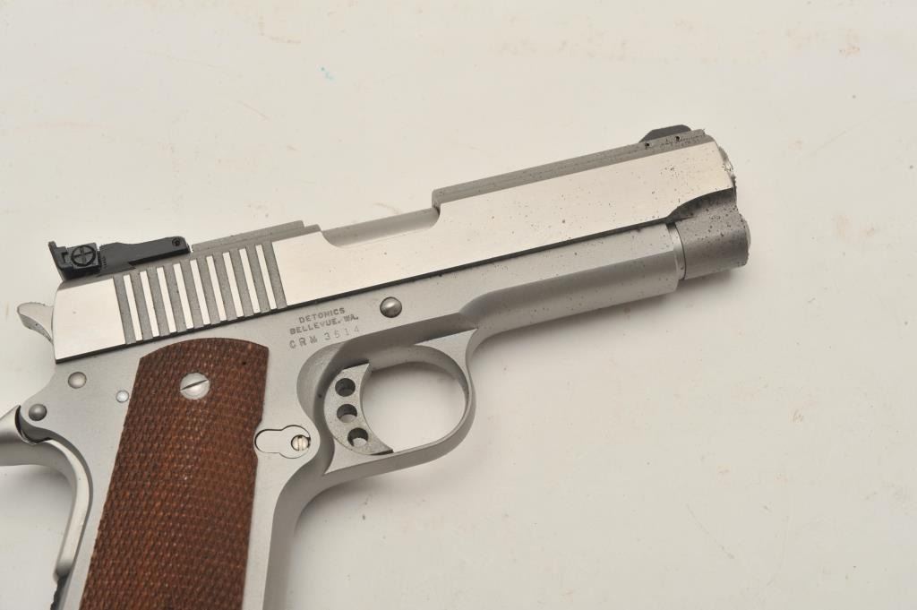 18BM-51 SERVICE MASTER DETONICSDetonics ServiceMaster II .45 ACP stainless semi automatic pistol, #CRM3514, 4 1/4" barrel, adjustable trigger, adjustable sights, checkered hardwood grips. Pistol is in fine condition, in need of cleaning fromthe foam interior of the factory box. Once cleaned, the pistol should be in excellent condition. Includes original box and one mag. (Modern / PPT) Est $300-600Detonics ServiceMaster II .45 ACP stainless semi automatic pistol, #CRM3514, 4 1/4" barrel, adjustable trigger, adjustable sights, checkered hardwood grips. Pistol is in fine condition, in need of cleaning fromthe foam interior of the factory box. Once cleaned, the pistol should be in excellent condition. Includes original box and one mag. (Modern / PPT) Est $300-600
