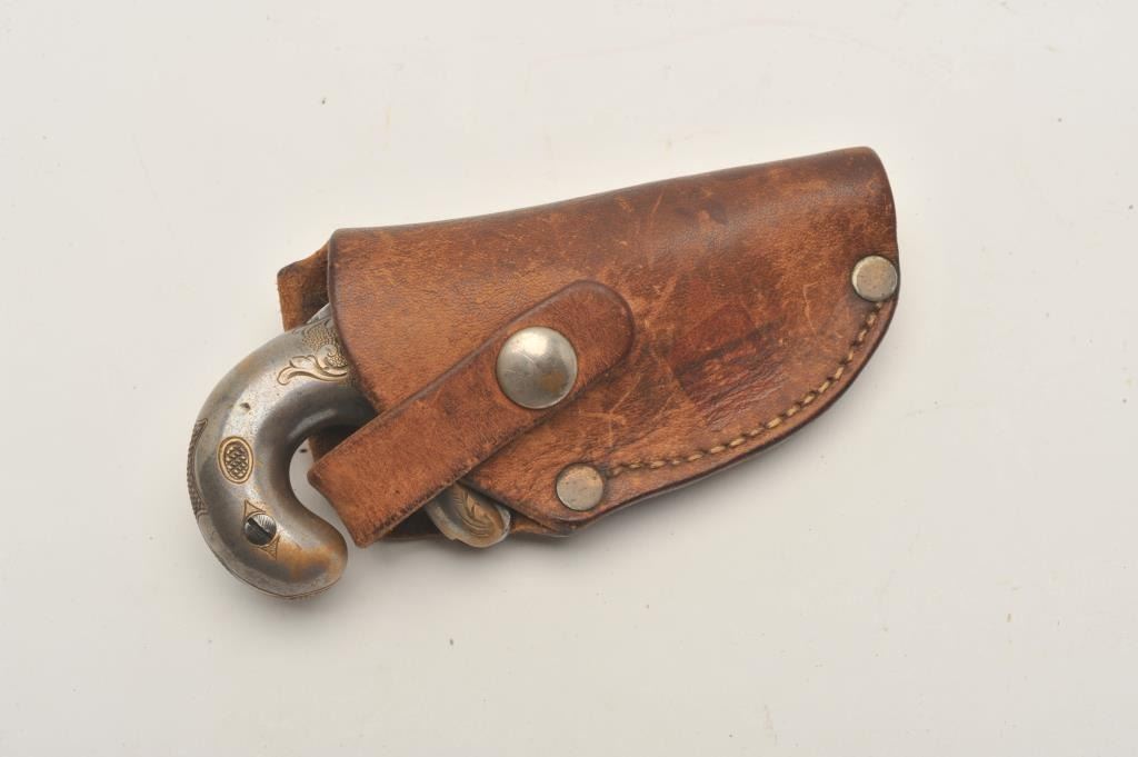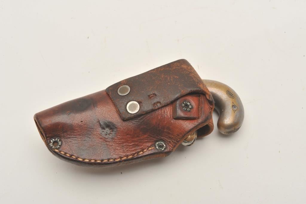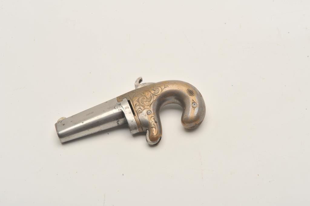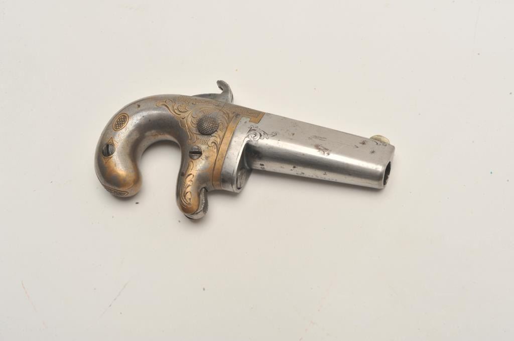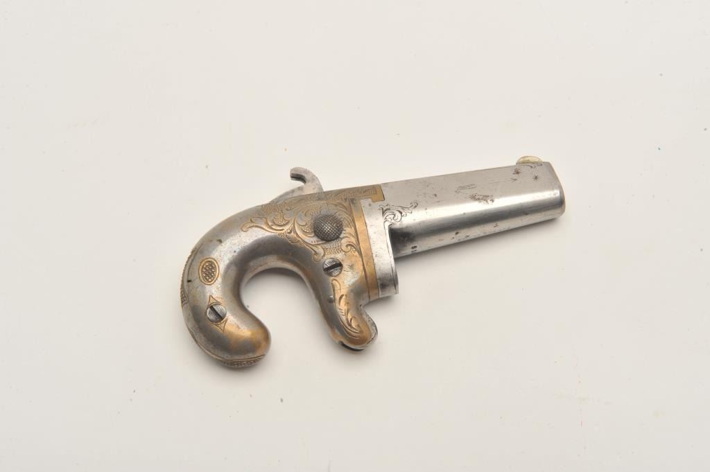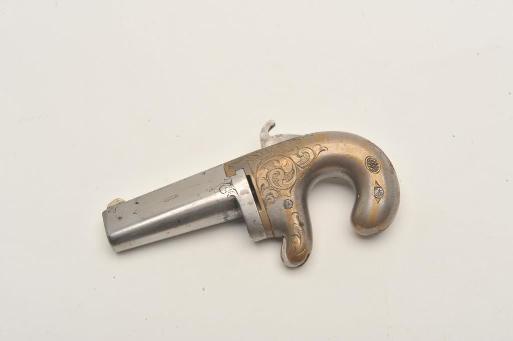 18AP-2 NATIONAL #1 DERRINGERNational Arms Co. engraved derringer, .38 caliber, 2” barrel, traces of silver wash to brass frame, very good condition overall with a crisp action, sharp markings and engraving; accompanied by a modern leatherholster. (Antique). Est.: $400-$800.National Arms Co. engraved derringer, .38 caliber, 2” barrel, traces of silver wash to brass frame, very good condition overall with a crisp action, sharp markings and engraving; accompanied by a modern leatherholster. (Antique). Est.: $400-$800.