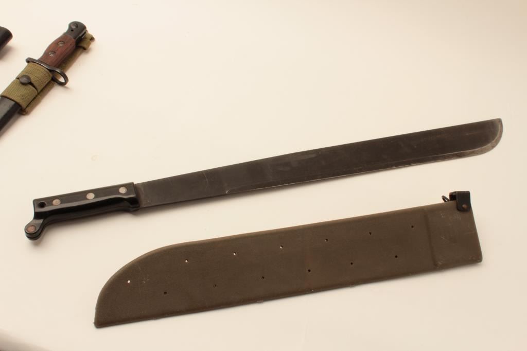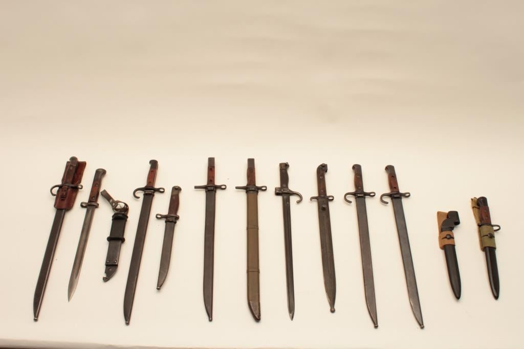 17MH-82 BAYONET LOTLot of 13 misc. military bayonets, most with sheaths, including Japanese, British, European and a U.S. Machete. Est.: $500-$750.Lot of 13 misc. military bayonets, most with sheaths, including Japanese, British, European and a U.S. Machete. Est.: $500-$750.