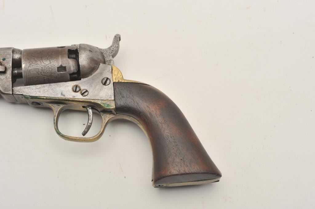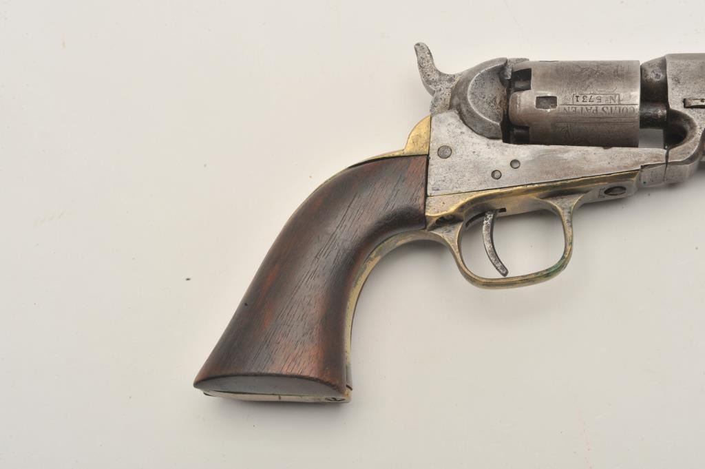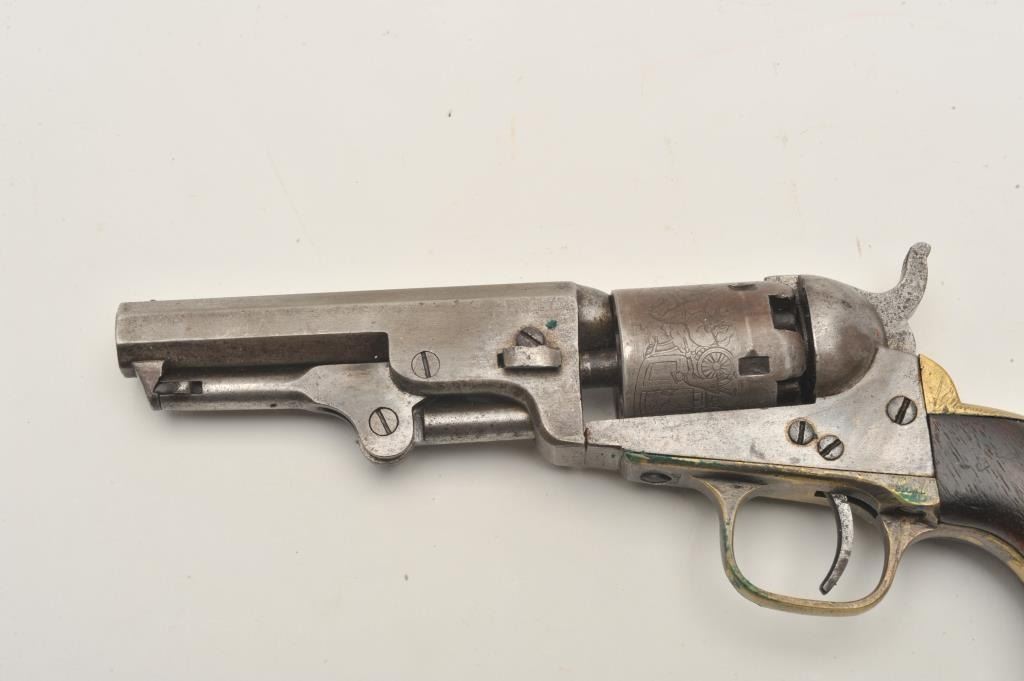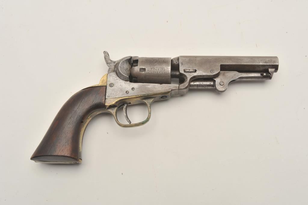 18AP-24 COLT POCKETColt Pocket Model 1849 percussion revolver, .31 caliber, 4” octagon barrel, brass straps, wood grips, S/N 235731, in overall good condition with a good cylinder scene, grey patina to metal surfaces, crisp action, goodgrips. (Antique). Est.: $300-$600.Colt Pocket Model 1849 percussion revolver, .31 caliber, 4” octagon barrel, brass straps, wood grips, S/N 235731, in overall good condition with a good cylinder scene, grey patina to metal surfaces, crisp action, goodgrips. (Antique). Est.: $300-$600.