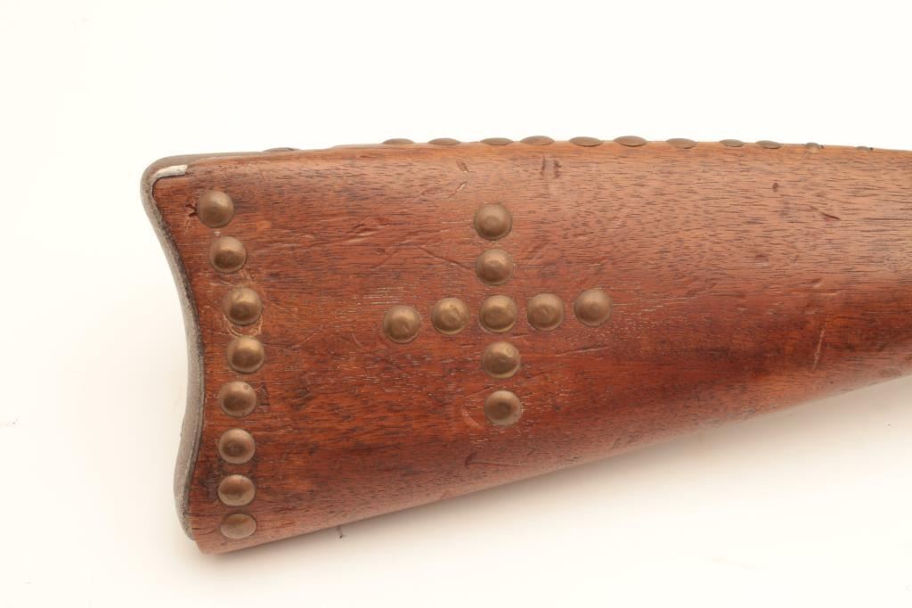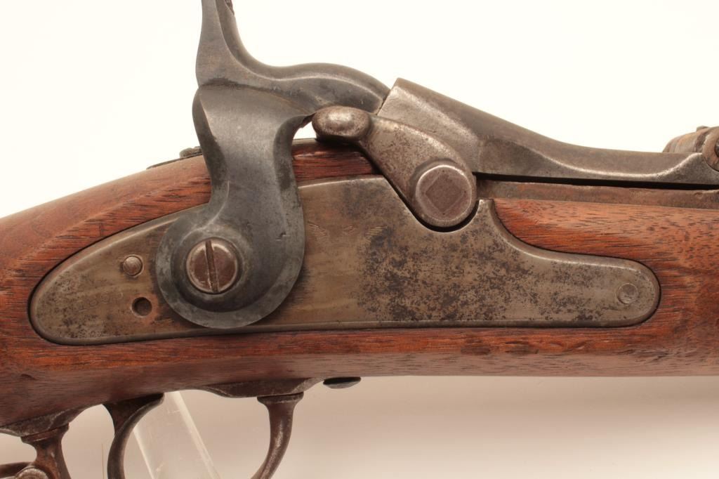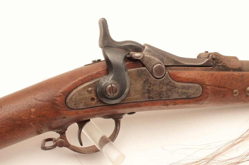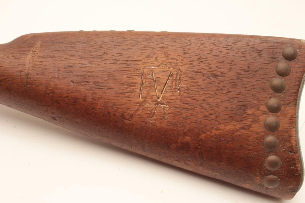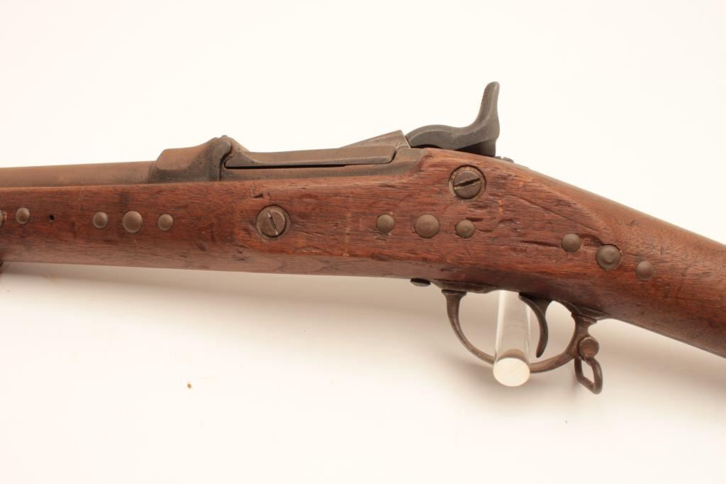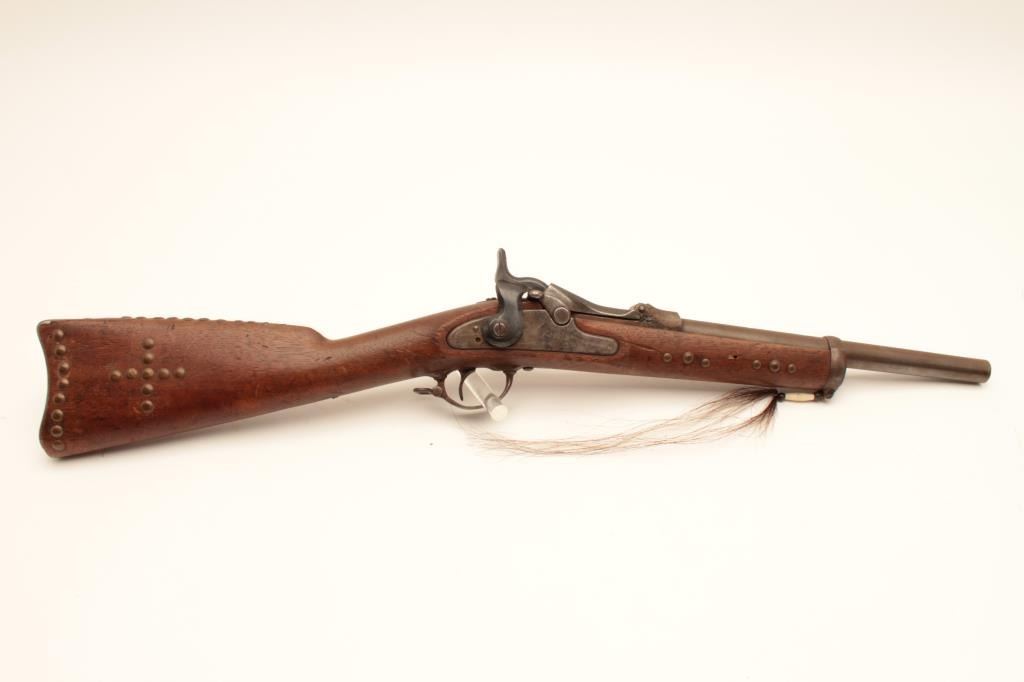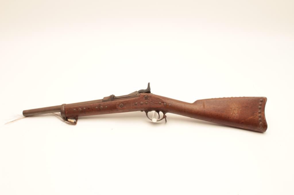 18AP-31 SPRINGFIELD TRAPDOORSpringfield Trapdoor saddle gun, .45 caliber, Serial #NSNV. The rifle is in fair overall condition with a cut down 13” in length. The metal surfaces are a brown patina with areas of light surface rust and the rear sightshave been removed. The hammer is an old replacement. The smooth wood stock has had brass tacks applied and a bone ornament with horse hair hangs from the front sling swivel. The stock has seen heavy use with numerousdents and compressions and ends with a smooth steel crescent butt. The bore is rough and the action appears to function. Est.: $300-$600. (Antique).Springfield Trapdoor saddle gun, .45 caliber, Serial #NSNV. The rifle is in fair overall condition with a cut down 13” in length. The metal surfaces are a brown patina with areas of light surface rust and the rear sightshave been removed. The hammer is an old replacement. The smooth wood stock has had brass tacks applied and a bone ornament with horse hair hangs from the front sling swivel. The stock has seen heavy use with numerousdents and compressions and ends with a smooth steel crescent butt. The bore is rough and the action appears to function. Est.: $300-$600. (Antique).