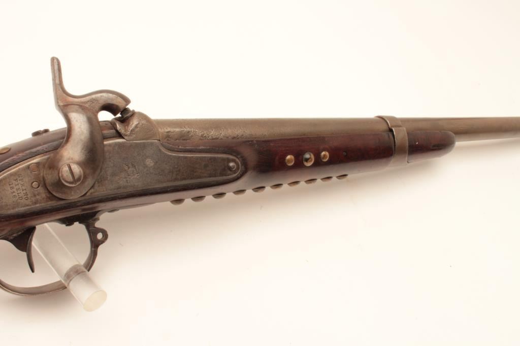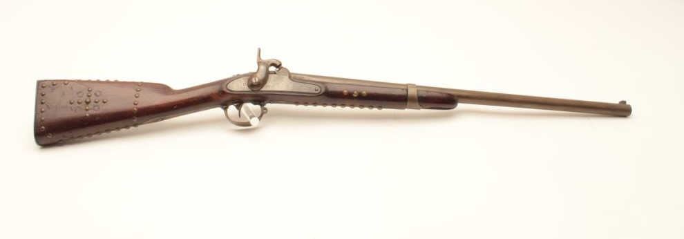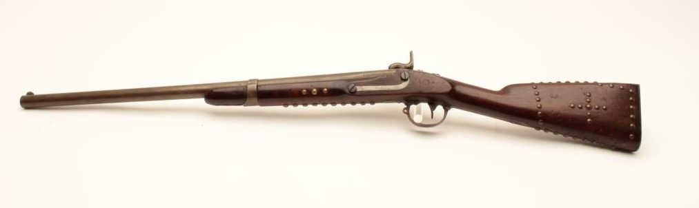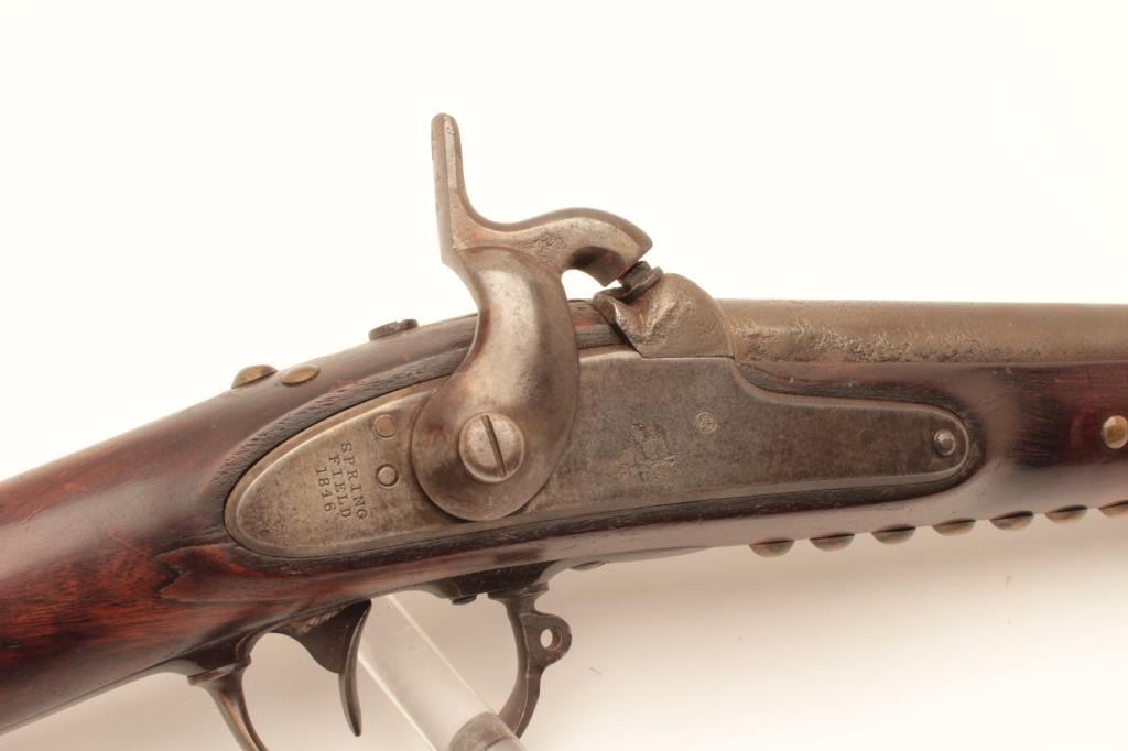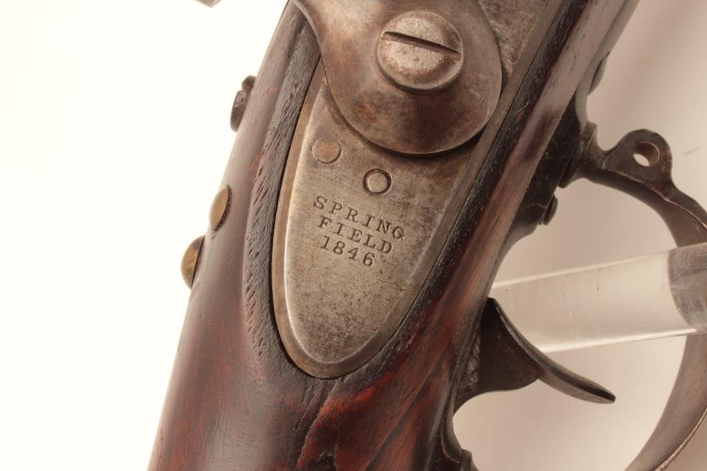 18AP-33 TACKED MUSKETTacked Springfield percussion musket, approximately .75 caliber. The musket is in fair overall condition with a cut down 24 ½” barrel. The barrel and side plate have gone to a grey patina with some light to moderatepitting at the breech. The side plate shows old toning case hardening and marked, “SPRINGFIELD 1846”. The smooth wood stocks are decorated with brass tacks which have turned a darker patina. Est.: $250-$500.(Antique).Tacked Springfield percussion musket, approximately .75 caliber. The musket is in fair overall condition with a cut down 24 ½” barrel. The barrel and side plate have gone to a grey patina with some light to moderatepitting at the breech. The side plate shows old toning case hardening and marked, “SPRINGFIELD 1846”. The smooth wood stocks are decorated with brass tacks which have turned a darker patina. Est.: $250-$500.(Antique).