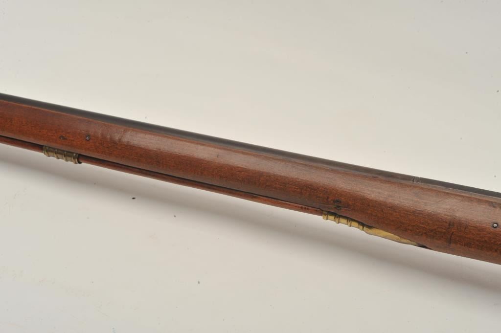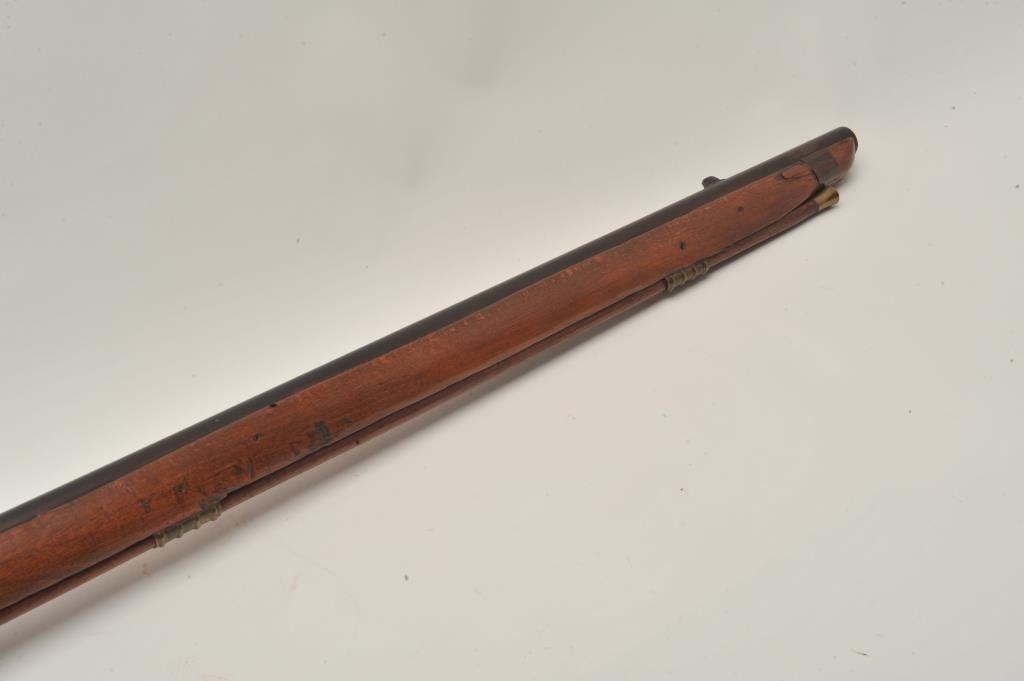 18AP-39 TRADE MUSKETReproduction 20th Century flintlock Trade musket, .60 caliber. The rifle is in good overall condition with a 52” round to octagon barrel. The barrel is brown and the side plate is brass. The smooth wood stock is ingood overall condition with small mars and a full-length wooden ramrod. The rifle has a brass trigger guard and smooth brass butt plate. Est.: $200-$400.Reproduction 20th Century flintlock Trade musket, .60 caliber. The rifle is in good overall condition with a 52” round to octagon barrel. The barrel is brown and the side plate is brass. The smooth wood stock is ingood overall condition with small mars and a full-length wooden ramrod. The rifle has a brass trigger guard and smooth brass butt plate. Est.: $200-$400.