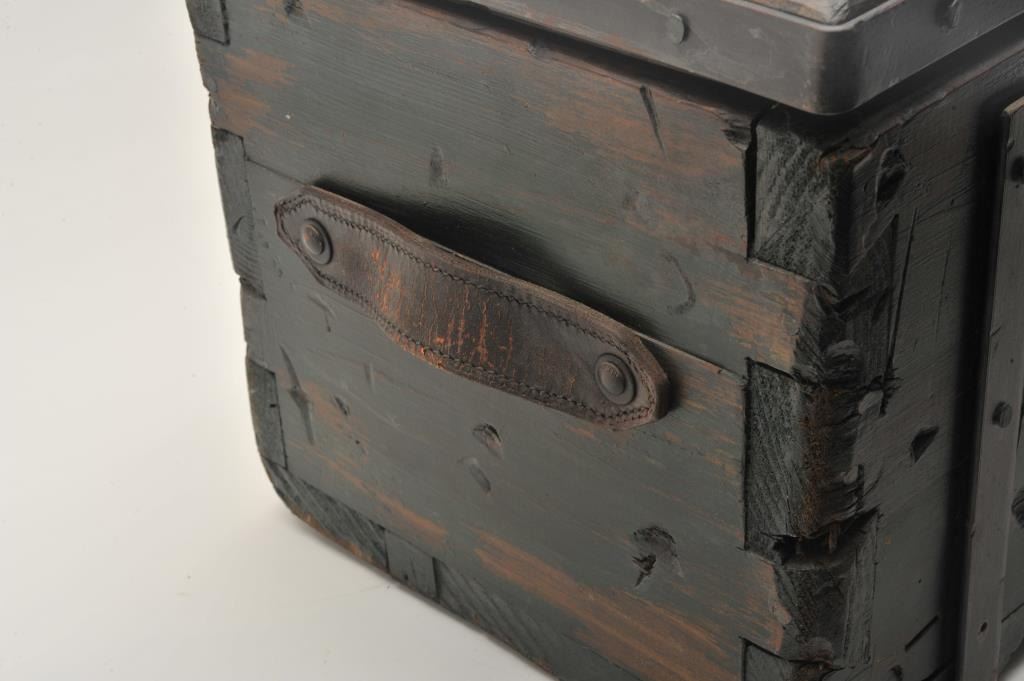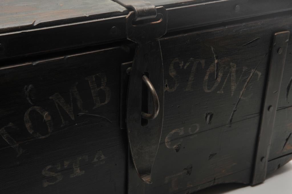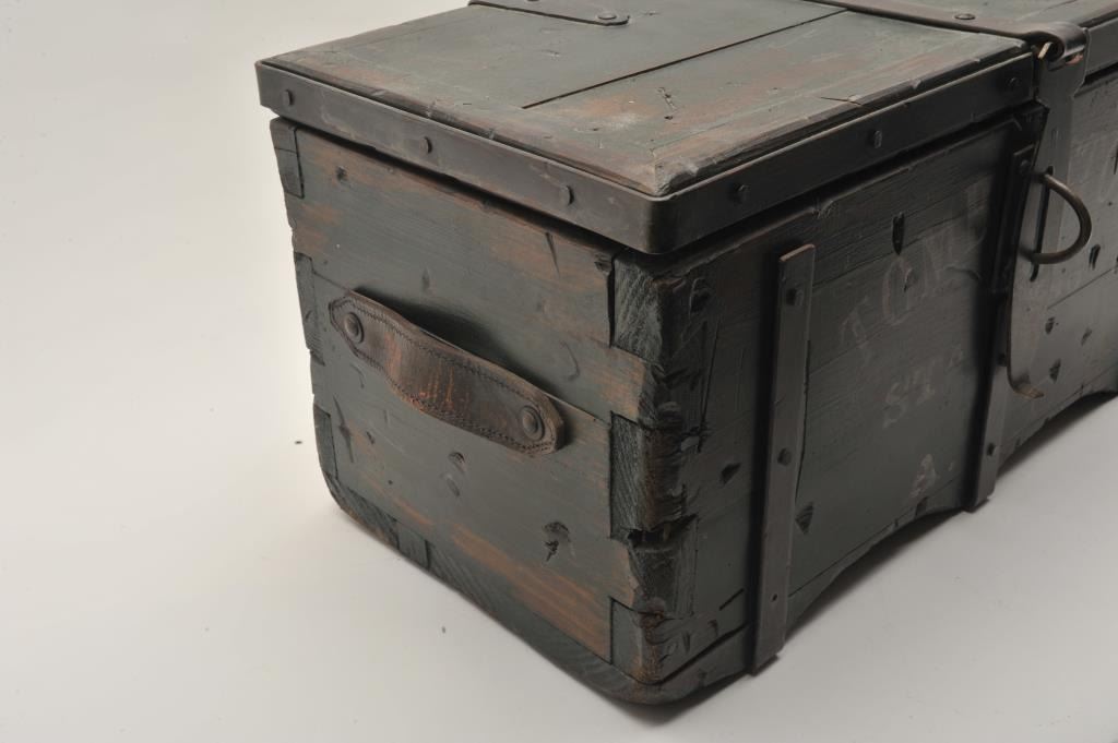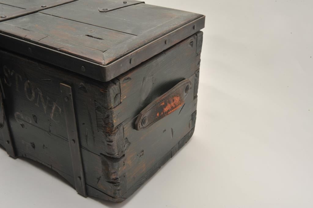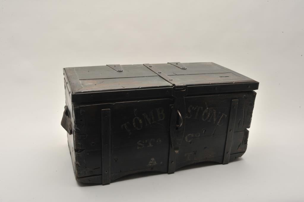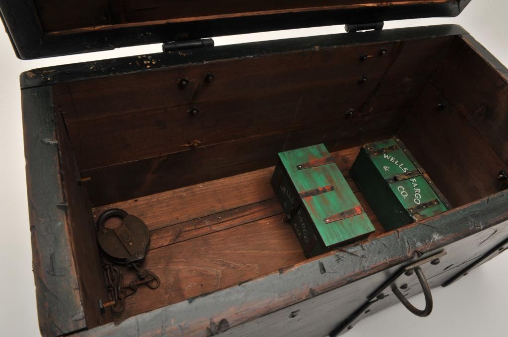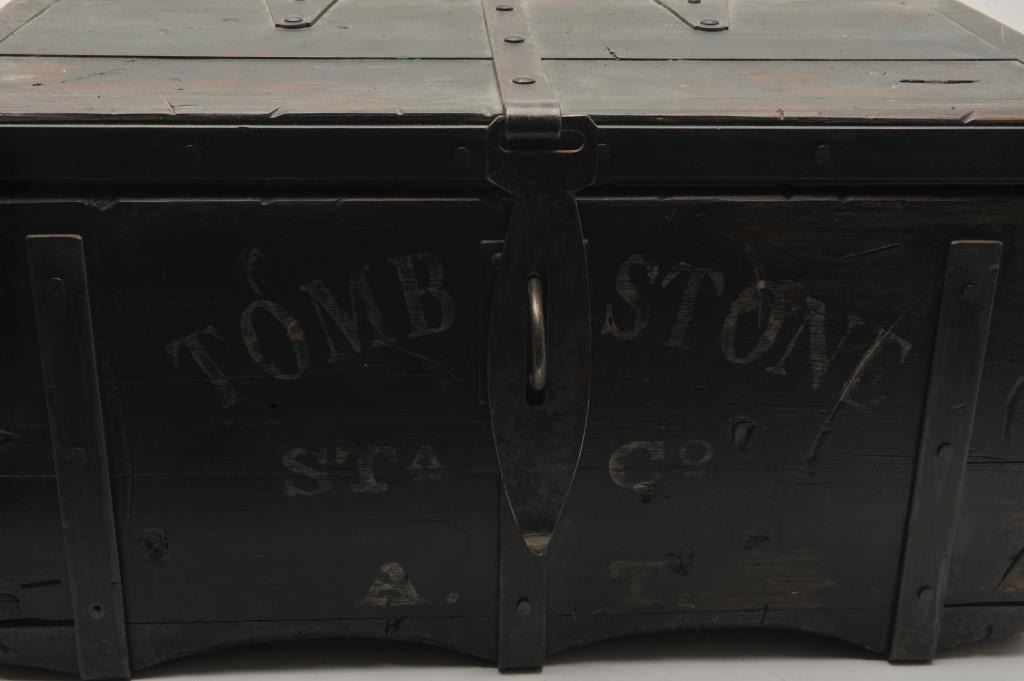18AP-74 REPRO MONEY BOXWell-made 20-30 year old reproduction wood and iron money box, approximately 12” in height x 24” in width x 12” in depth; antiqued finish with “TOMBSTONE/STa Co/A.T.” painted on front of box; inside are twominiature reproduction Wells Fargo & Co. strongboxes and a brass old style lock. Est.: $250-$500.Well-made 20-30 year old reproduction wood and iron money box, approximately 12” in height x 24” in width x 12” in depth; antiqued finish with “TOMBSTONE/STa Co/A.T.” painted on front of box; inside are twominiature reproduction Wells Fargo & Co. strongboxes and a brass old style lock. Est.: $250-$500.