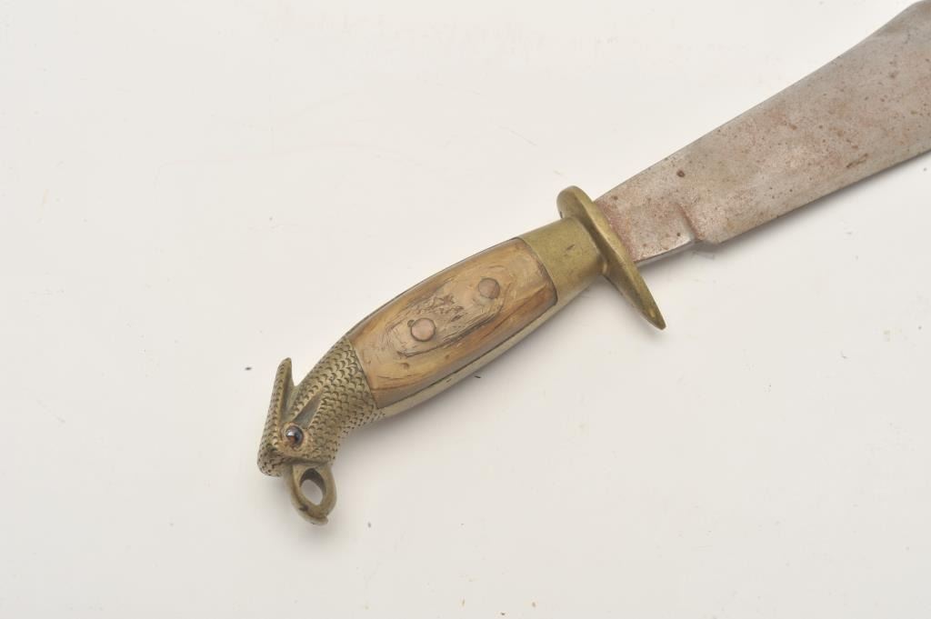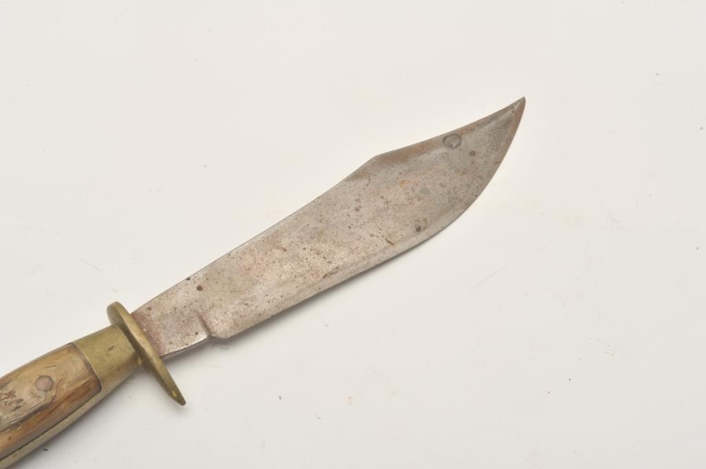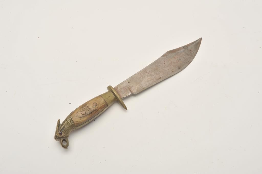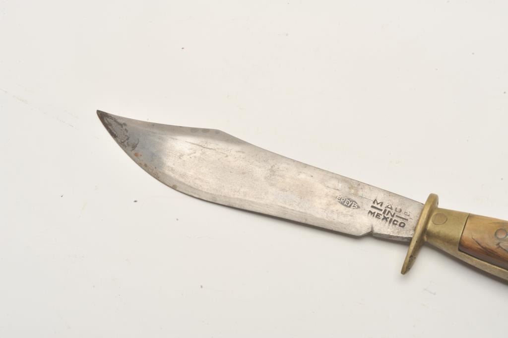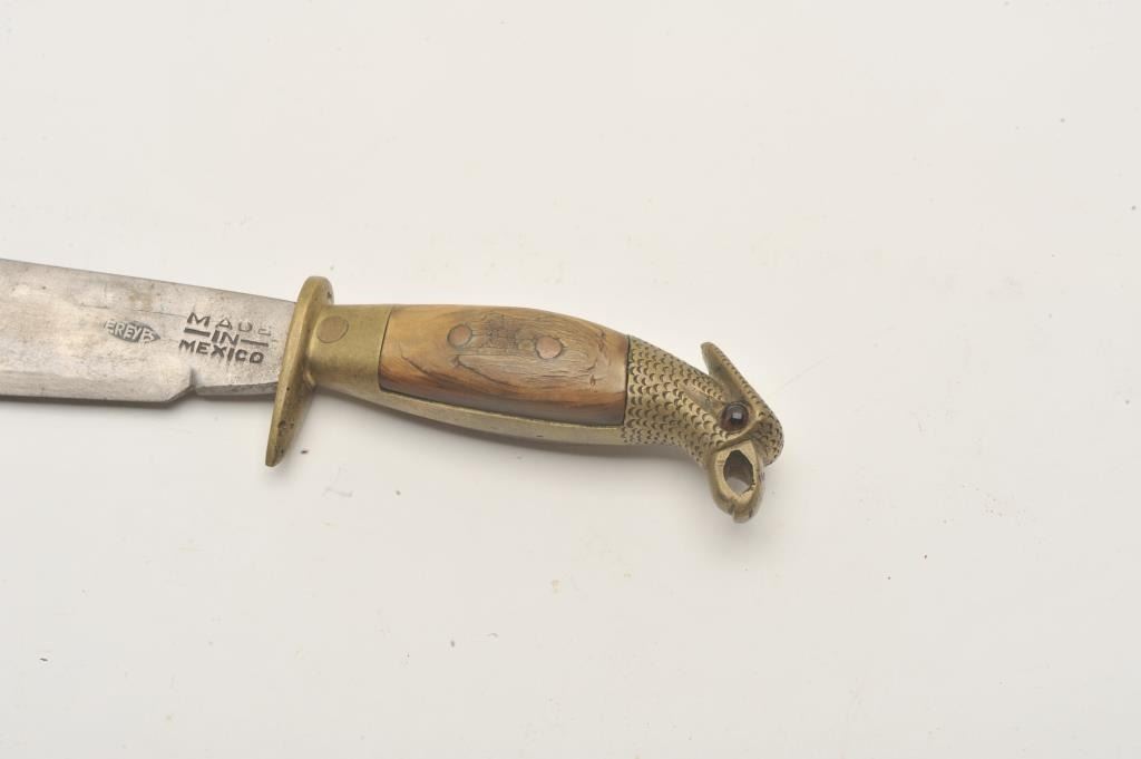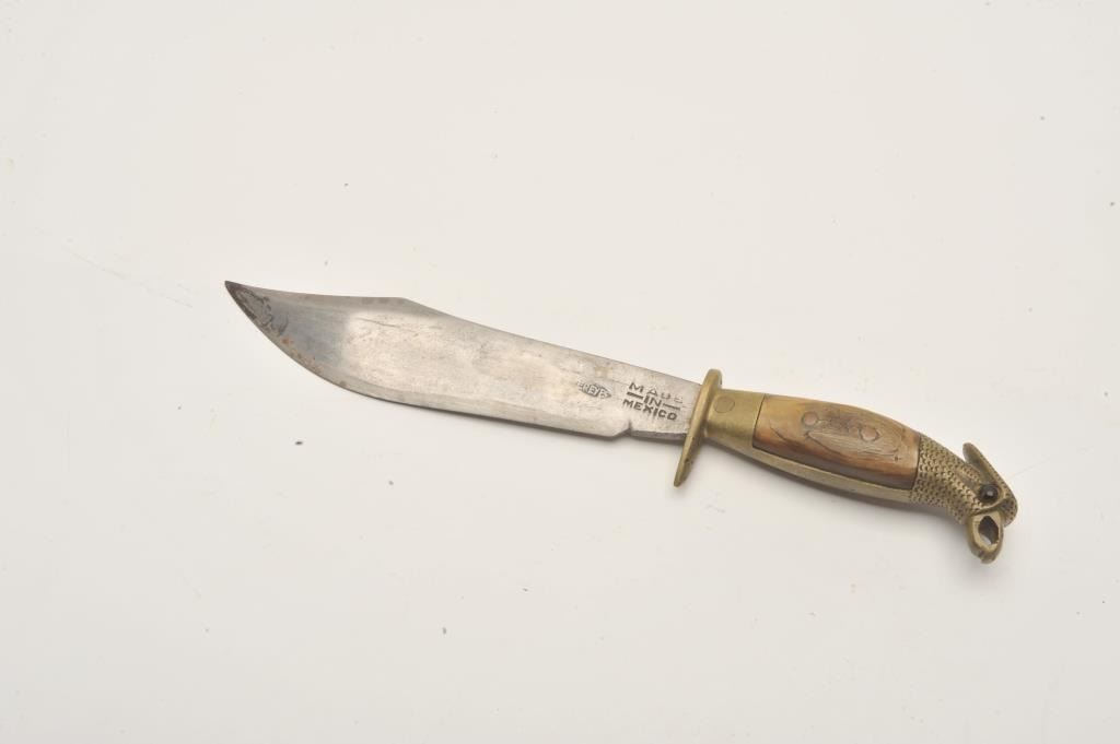 18AP-65 MEXICAN BOWIEMexican Bowie knife (no sheath) marked “E. REYES” on blade; eagle head pommel, bone grips; approximately 12” overall with a 7.5” blade. Est.: $75-$150.Mexican Bowie knife (no sheath) marked “E. REYES” on blade; eagle head pommel, bone grips; approximately 12” overall with a 7.5” blade. Est.: $75-$150.