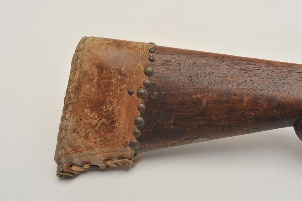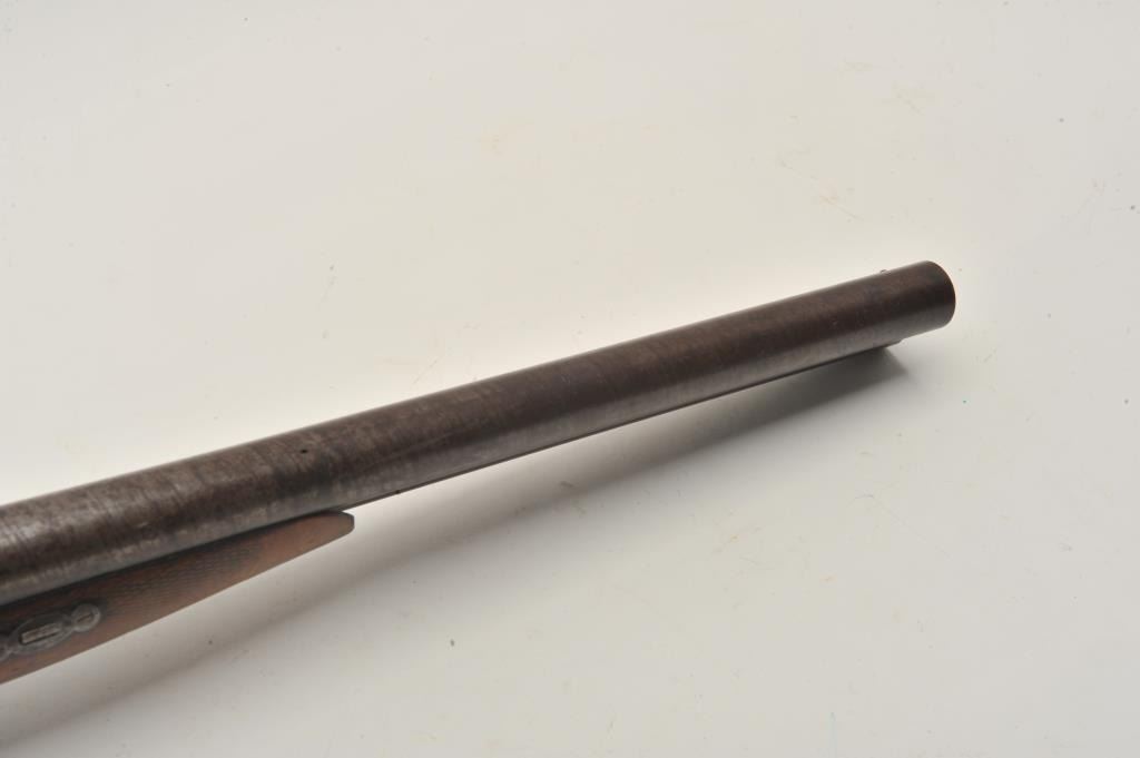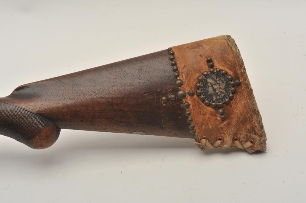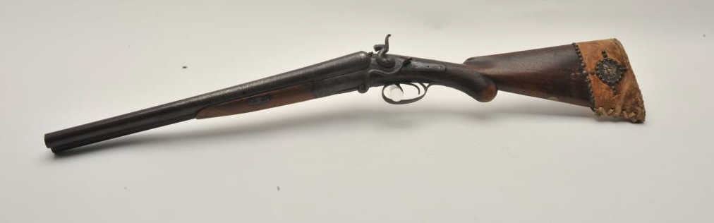 18AP-45 E. JAMES & CO SHOTGUNE. James and Co. side by side double barrel hammer shotgun, 10 gauge, Serial #NSNV. The shotgun is in fair overall condition with Damascus barrels shortened to 18 ¼”. The barrels are a uniform brown with lightsurface erosion noted. The full-length rib contains the barrel address, “E. JAMES and Co., LOVEDAY ST., BIRMm”. The receiver shows modest scroll engraving and a side lever action. The checkered wood stock is in faircondition with a round knob pistol grip with flattening of the checkering and moderate to heavy wear noted. The butt has been leather wrapped and decorated with brass tacks and a Liberty Head silver dollar. This is a neatold English working gun that saw service on the American frontier. Est.: $200-$400. (Antique).E. James and Co. side by side double barrel hammer shotgun, 10 gauge, Serial #NSNV. The shotgun is in fair overall condition with Damascus barrels shortened to 18 ¼”. The barrels are a uniform brown with lightsurface erosion noted. The full-length rib contains the barrel address, “E. JAMES and Co., LOVEDAY ST., BIRMm”. The receiver shows modest scroll engraving and a side lever action. The checkered wood stock is in faircondition with a round knob pistol grip with flattening of the checkering and moderate to heavy wear noted. The butt has been leather wrapped and decorated with brass tacks and a Liberty Head silver dollar. This is a neatold English working gun that saw service on the American frontier. Est.: $200-$400. (Antique).
