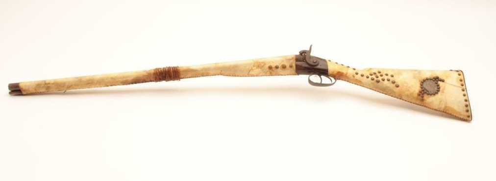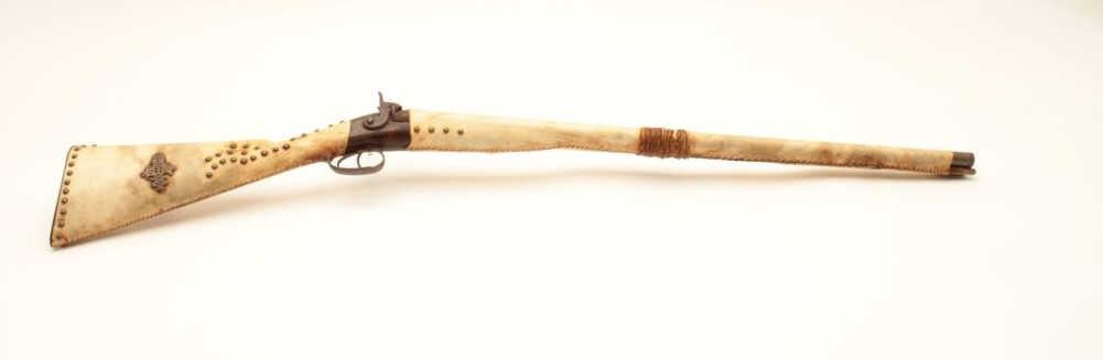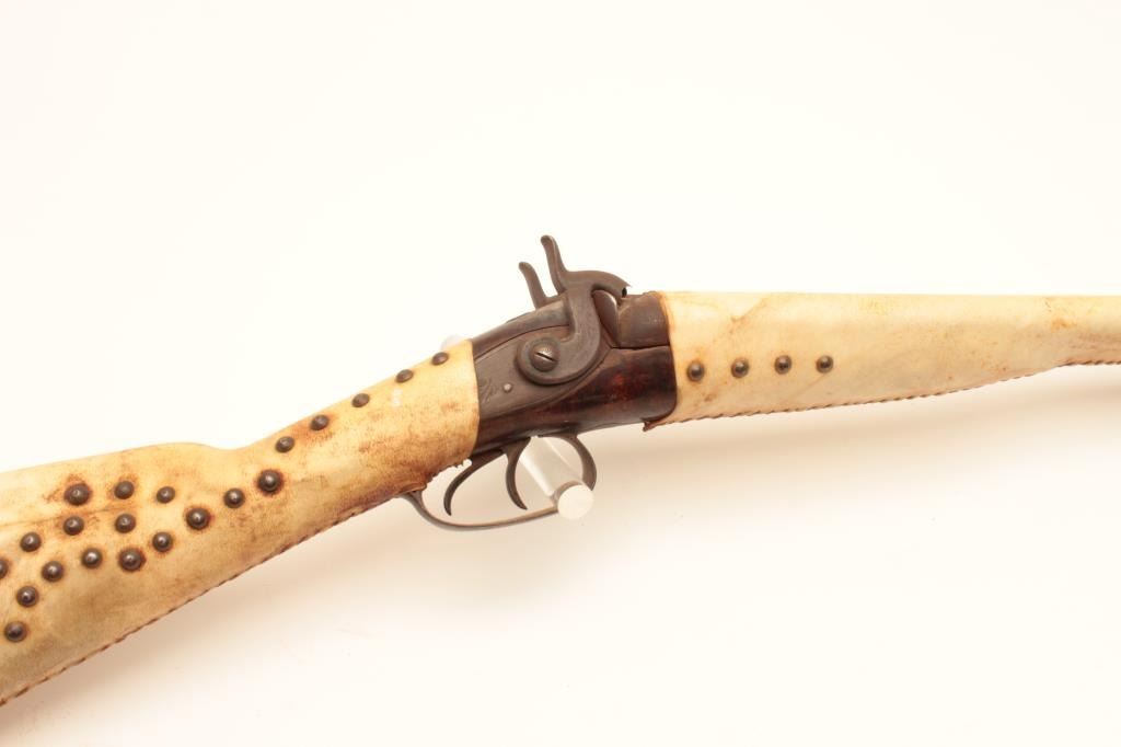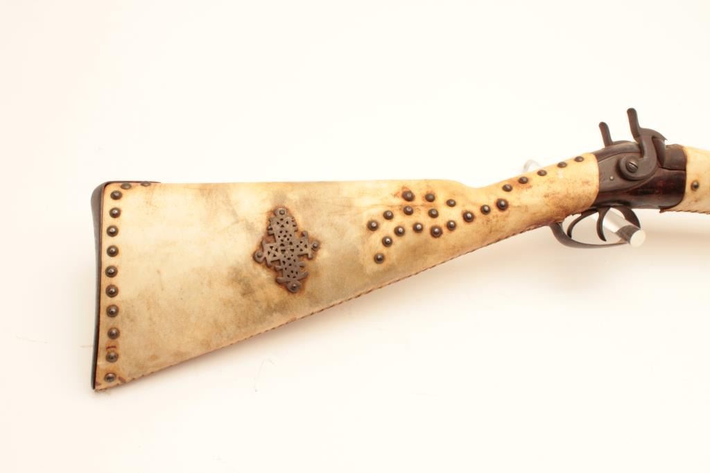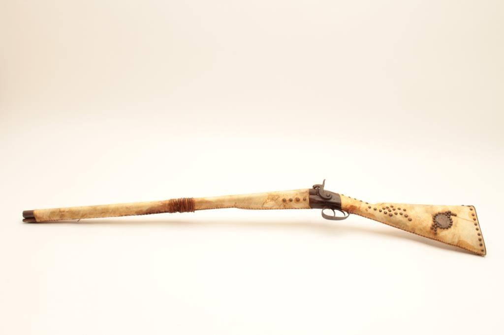 18AP-38 TACKED SHOTGUNIndian-style tacked and wrapped percussion SxS exposed hammers shotgun. (Antique). Est.: $200-$400.Indian-style tacked and wrapped percussion SxS exposed hammers shotgun. (Antique). Est.: $200-$400.