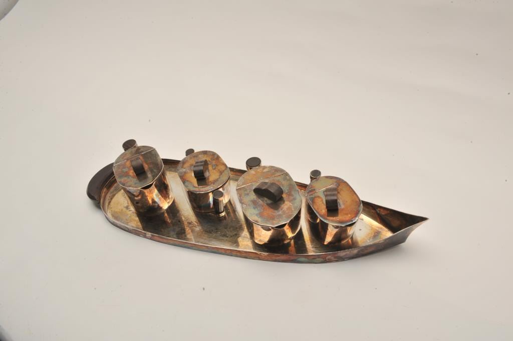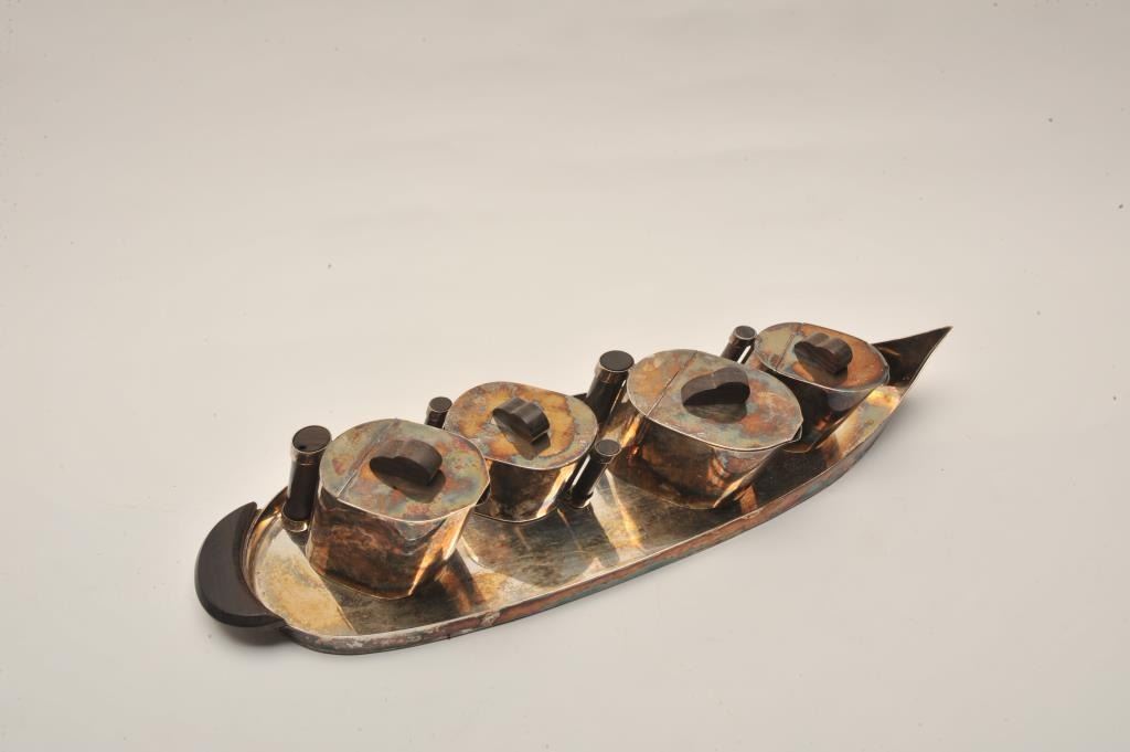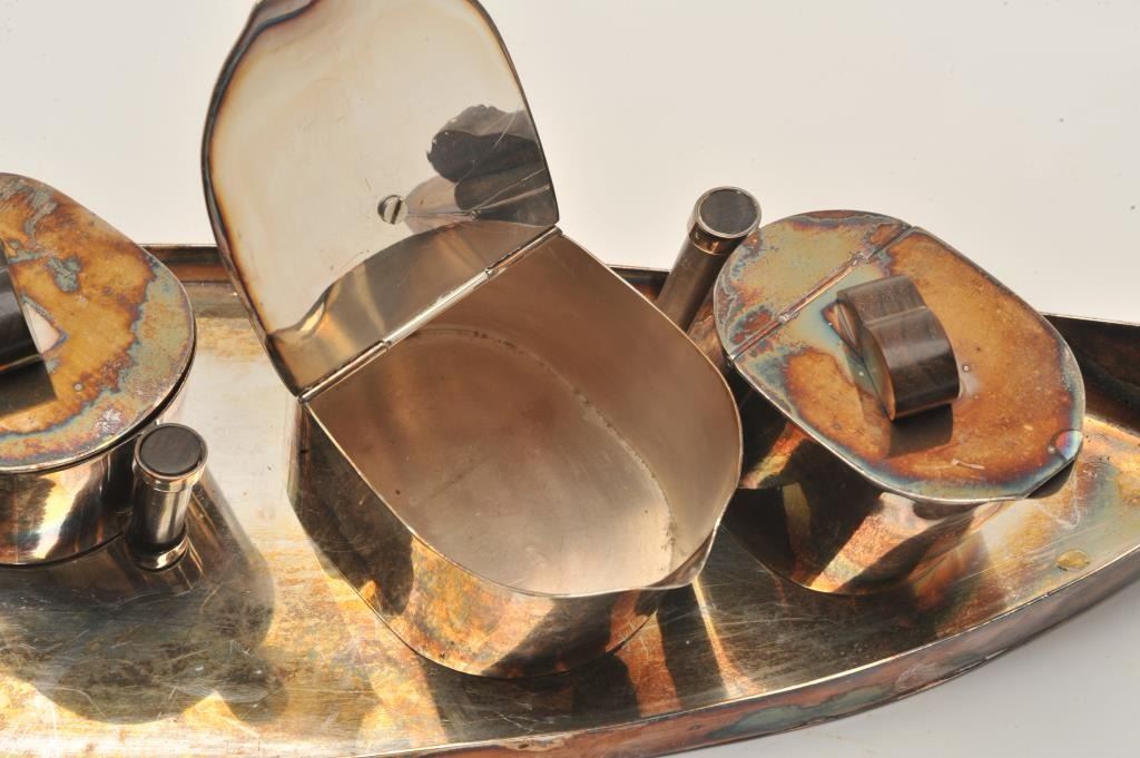 Lot 426 EVE-15 ART DECO COFFEE & TEA SETArt deco coffee and tea set (5 pieces) silver plate with exotic woo