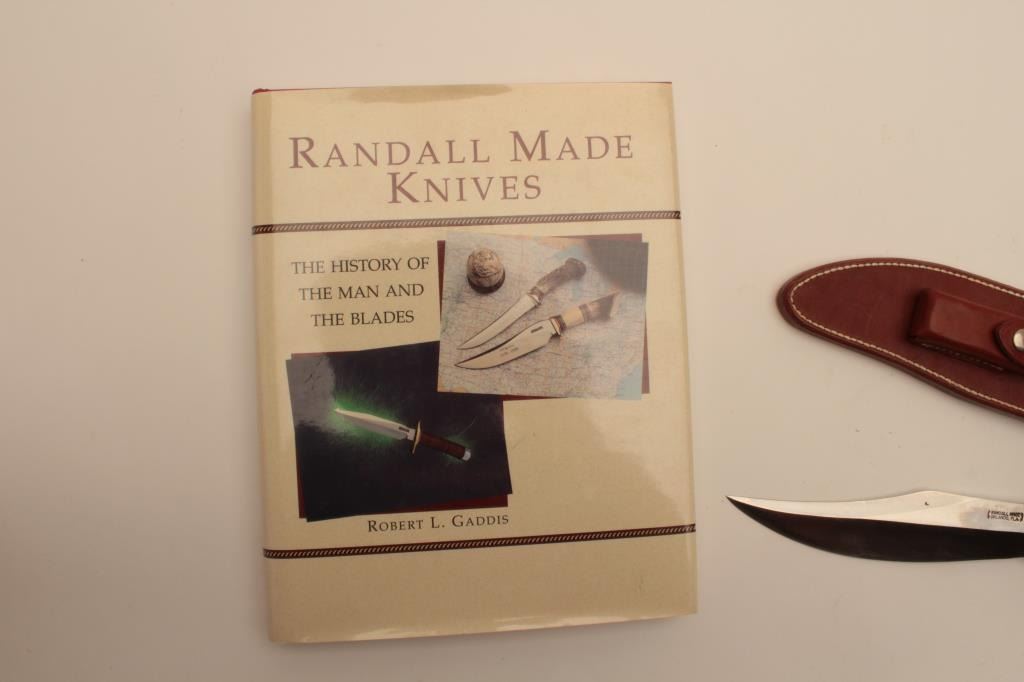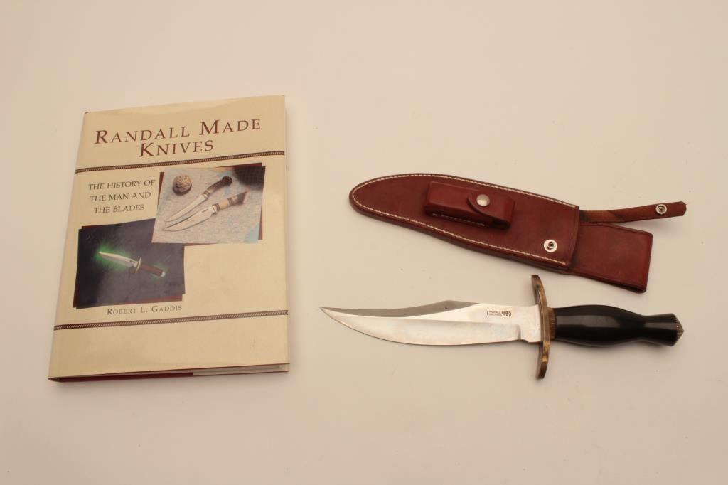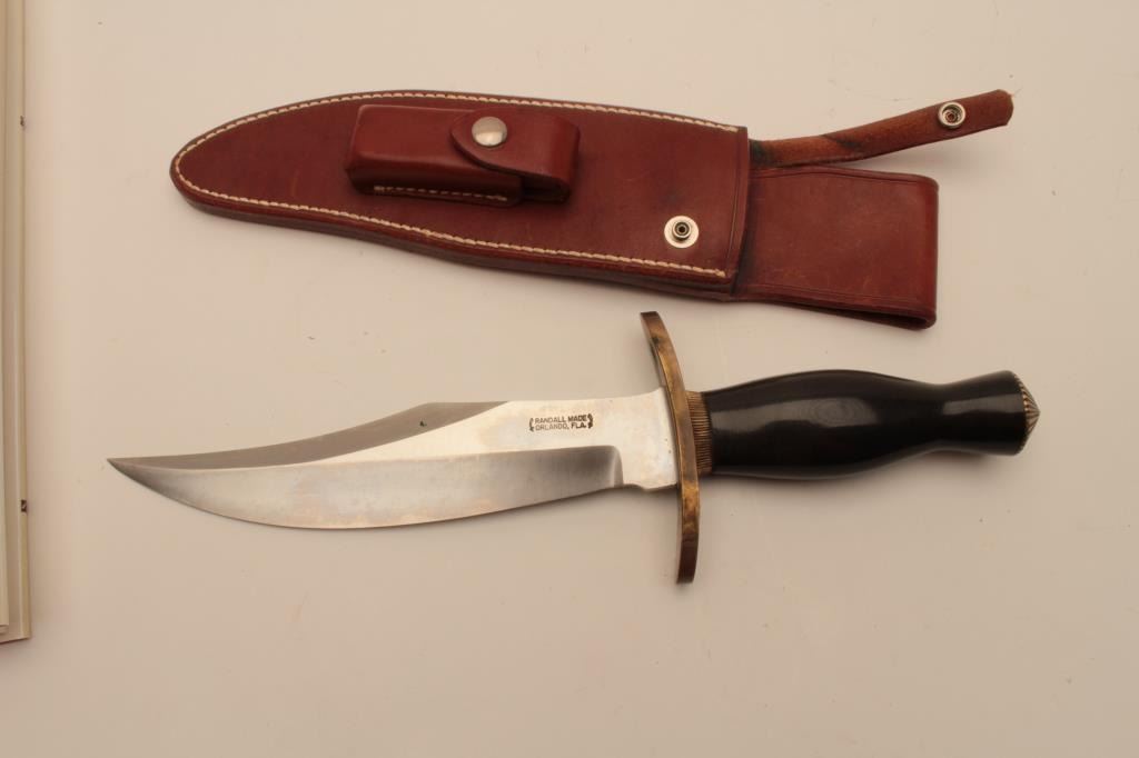 18CD-2 RANDALL BOWIEUnusual Randal Bowie with clip point and radical shaping. Numbered 128 on the reverse of scabbard. Not shown in brochure or book. Possible custom or display. Measures 13 ½” overall with a 8 ¼” blade. Black grip withfancy ferrules and brass guard. Book by Gaddis and brochures included. Est.: $400-$800Unusual Randal Bowie with clip point and radical shaping. Numbered 128 on the reverse of scabbard. Not shown in brochure or book. Possible custom or display. Measures 13 ½” overall with a 8 ¼” blade. Black grip withfancy ferrules and brass guard. Book by Gaddis and brochures included. Est.: $400-$800