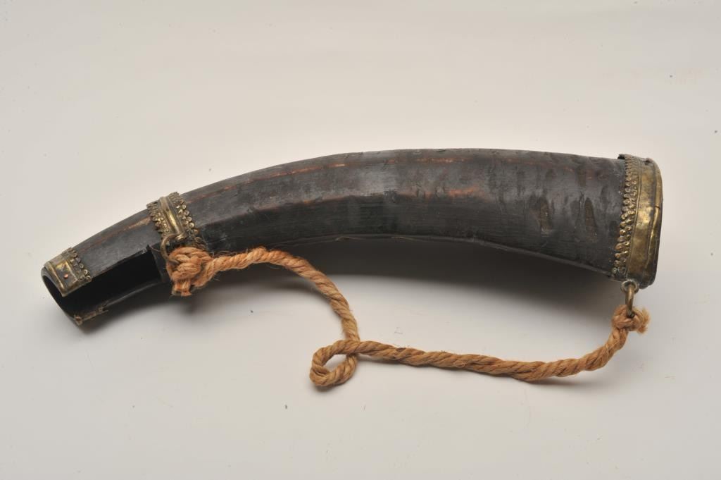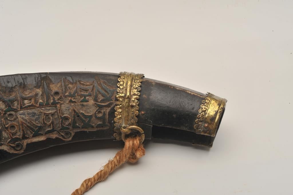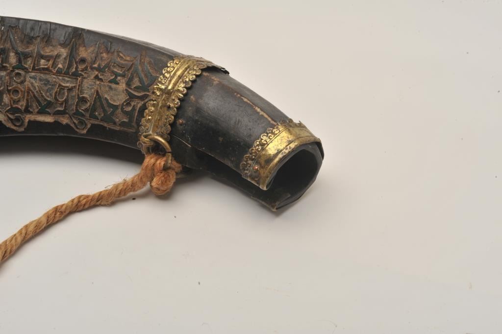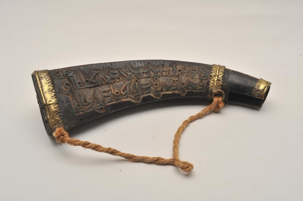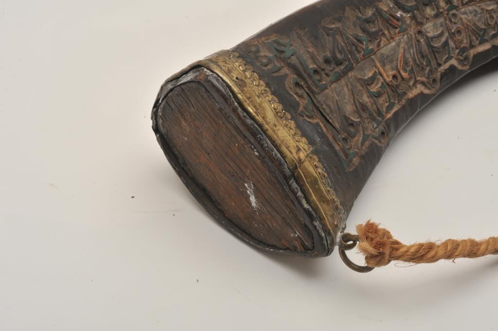 18BW-10 POWDER FLASKHuge Middle Eastern powder flask with brass mounts carved with Islamic calligraphy. Missing spout. Largest of these we have encountered. 200-400Huge Middle Eastern powder flask with brass mounts carved with Islamic calligraphy. Missing spout. Largest of these we have encountered. 200-400