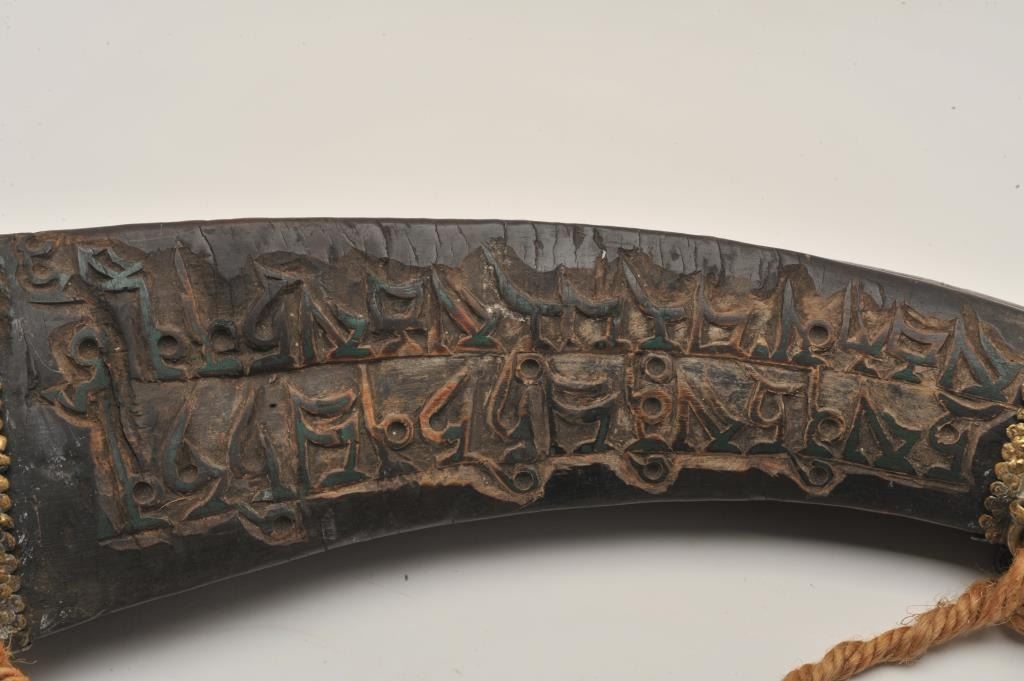 Lot 439 18BW-10 POWDER FLASKHuge Middle Eastern powder flask with brass mounts carved with Islamic calligra