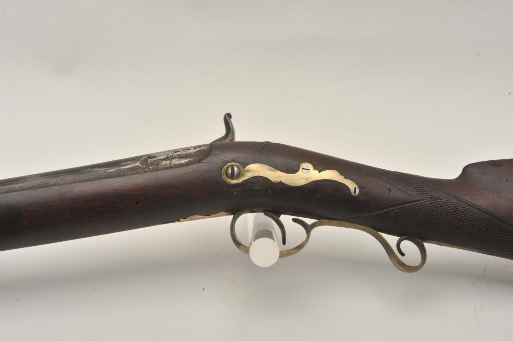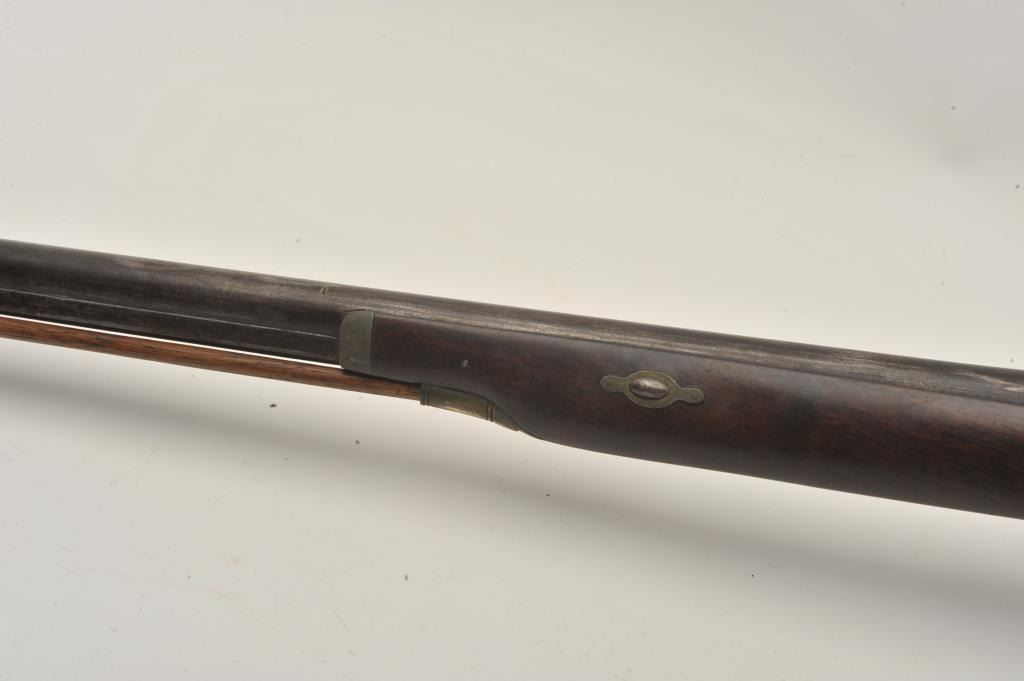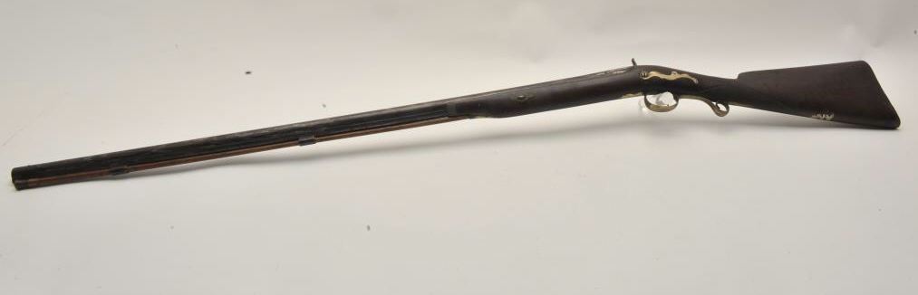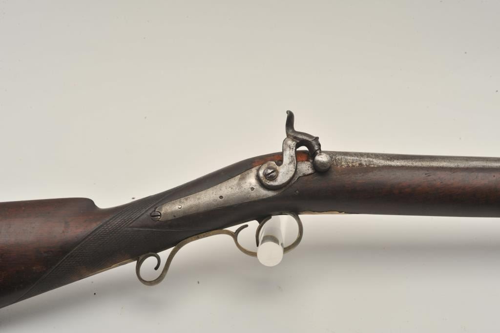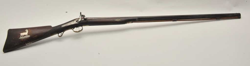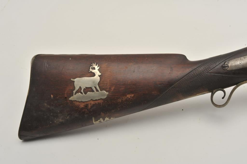18BS-4 PERC S.B.Percussion single barrel shotgun, 12 gauge, 39” barrel, back action locks, wood half stock with brass mounts and an inlay on the right side of the butt stock of a standing stag; wood ramrod retained; in overall fair + condition with dark patina to barrel, working action, wood stock is checkered at wrist and shows old losses behind hammer, otherwise un-cleaned good overall. (Antique). Est.: $190-$280.Percussion single barrel shotgun, 12 gauge, 39” barrel, back action locks, wood half stock with brass mounts and an inlay on the right side of the butt stock of a standing stag; wood ramrod retained; in overall fair + condition with dark patina to barrel, working action, wood stock is checkered at wrist and shows old losses behind hammer, otherwise un-cleaned good overall. (Antique). Est.: $190-$280.