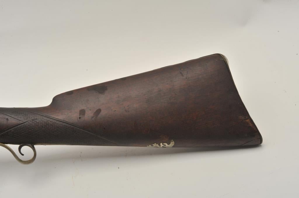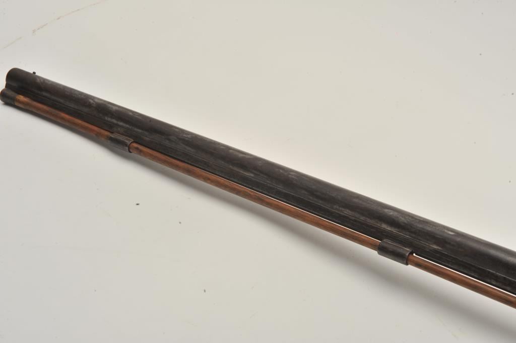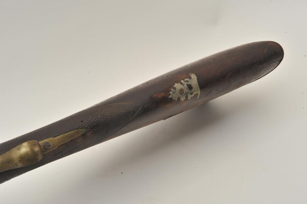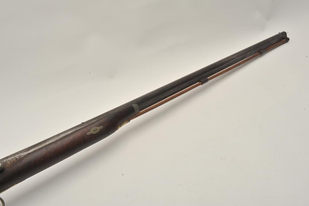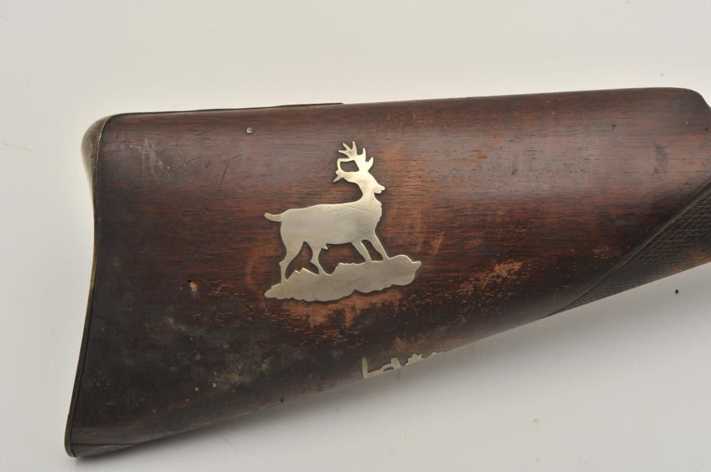 18BS-4 PERC S.B.Percussion single barrel shotgun, 12 gauge, 39” barrel, back action locks, wood half stock with brass mounts and an inlay on the right side of the butt stock of a standing stag; wood ramrod retained; in overall fair + condition with dark patina to barrel, working action, wood stock is checkered at wrist and shows old losses behind hammer, otherwise un-cleaned good overall. (Antique). Est.: $190-$280.Percussion single barrel shotgun, 12 gauge, 39” barrel, back action locks, wood half stock with brass mounts and an inlay on the right side of the butt stock of a standing stag; wood ramrod retained; in overall fair + condition with dark patina to barrel, working action, wood stock is checkered at wrist and shows old losses behind hammer, otherwise un-cleaned good overall. (Antique). Est.: $190-$280.