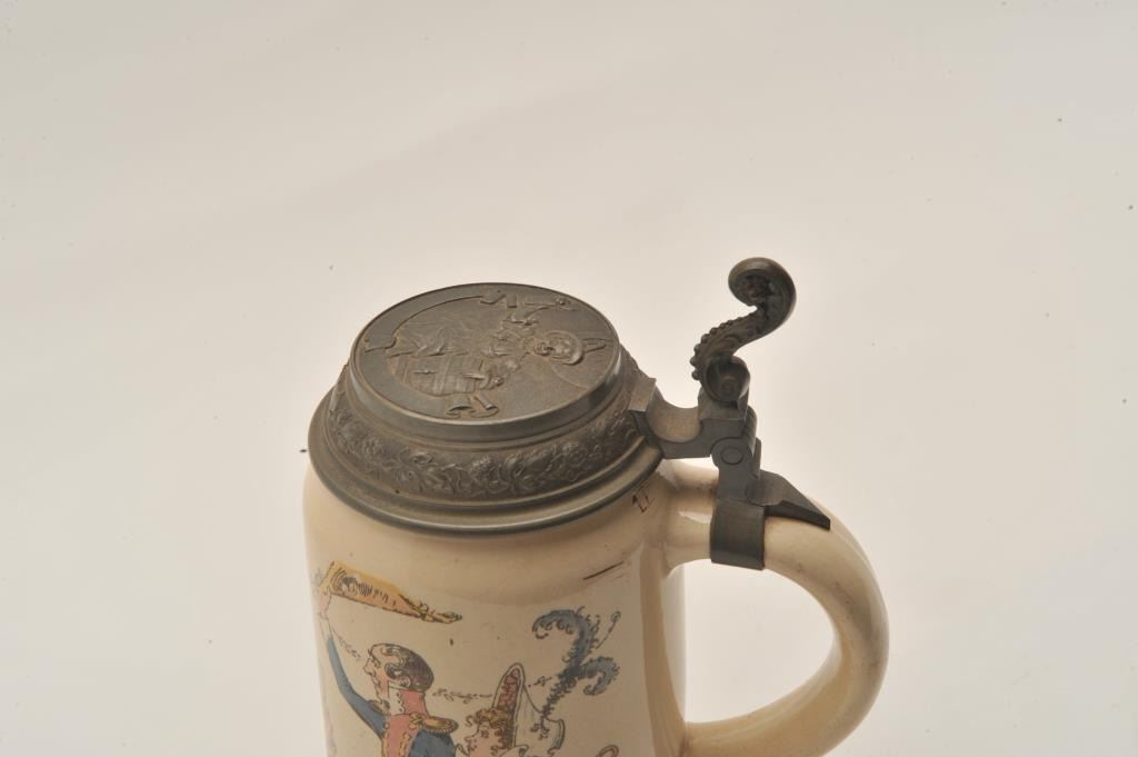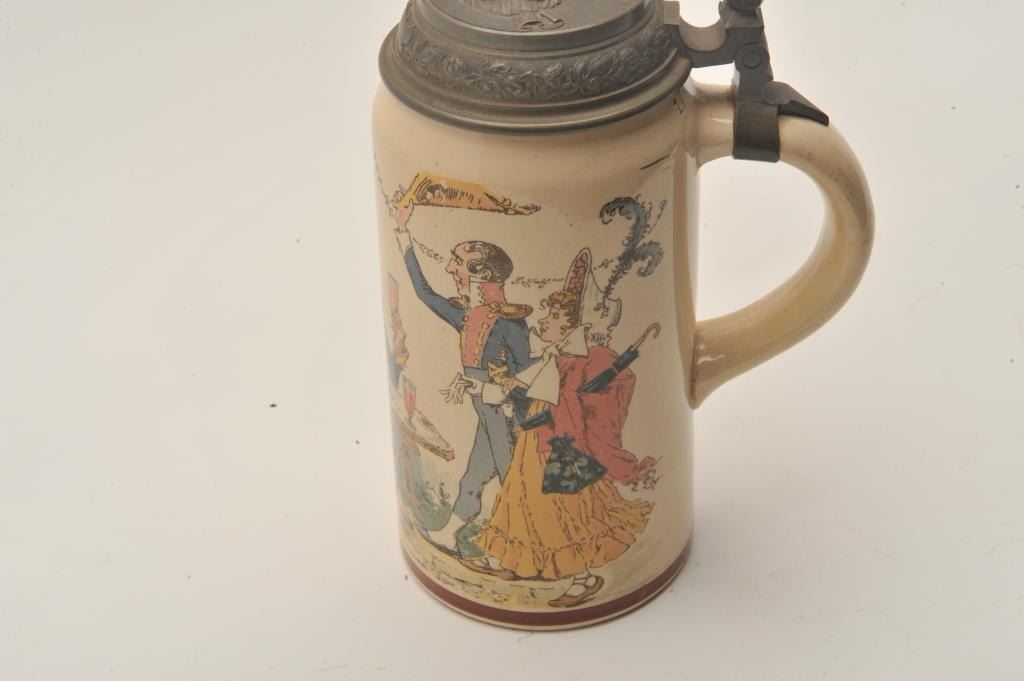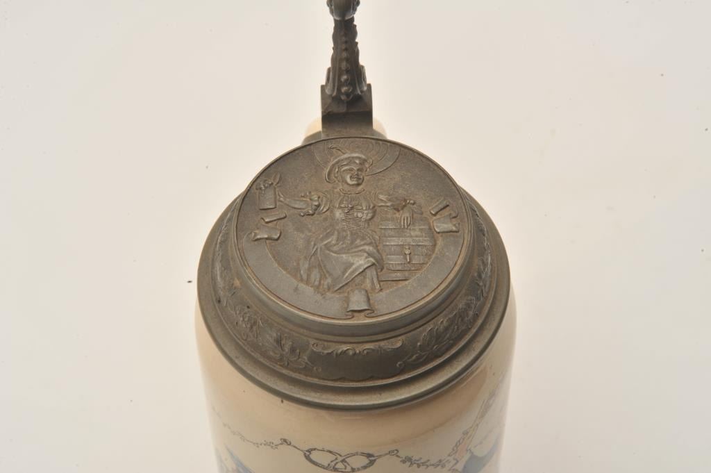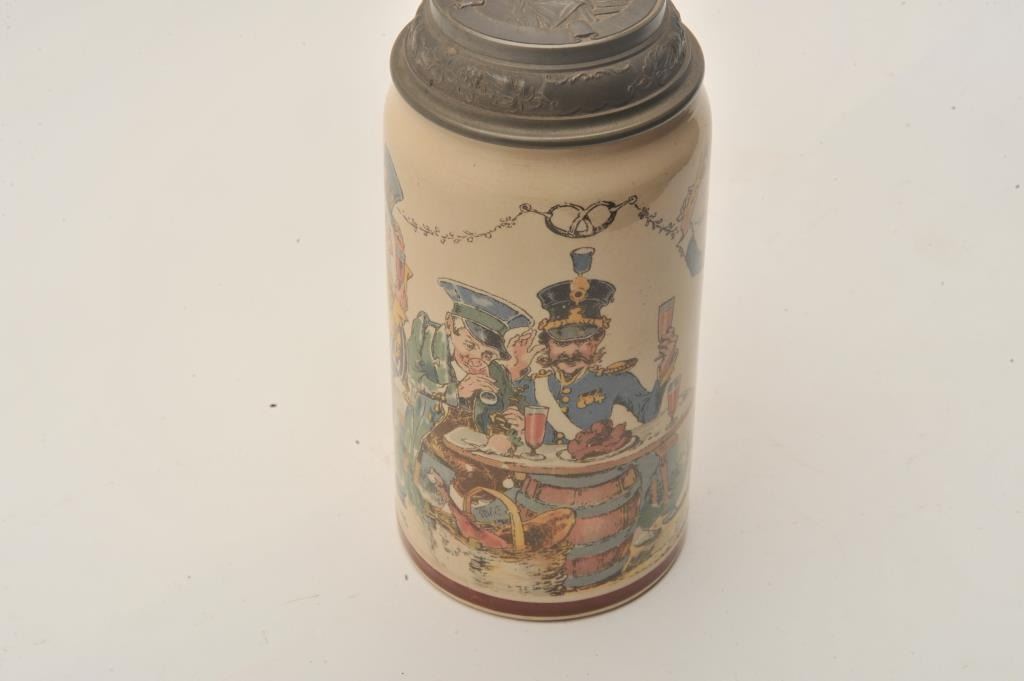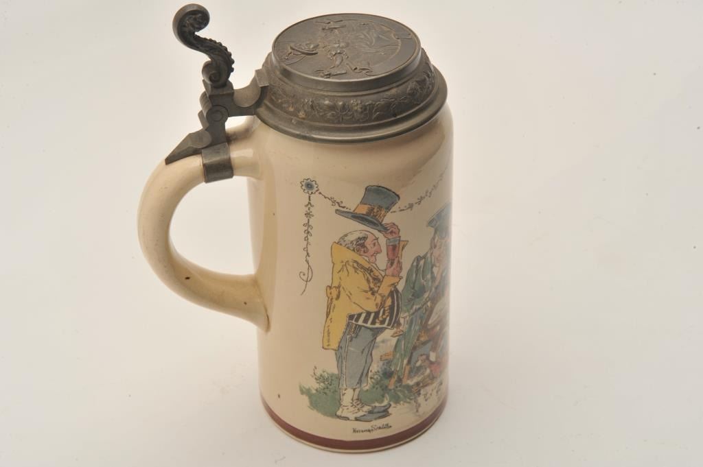 EVE-11 GERMAN STEINFine German stein signed artwork “Henry Schlitt” of men drinking and tavern with soldier and naval officer. Marked “Geshutz #1110” on the bottom with makers marks. Pewter lid with lady drinking and stein/keg.Fine condition. The estate of Eric Vaule. Est.: $150-$300Fine German stein signed artwork “Henry Schlitt” of men drinking and tavern with soldier and naval officer. Marked “Geshutz #1110” on the bottom with makers marks. Pewter lid with lady drinking and stein/keg.Fine condition. The estate of Eric Vaule. Est.: $150-$300
