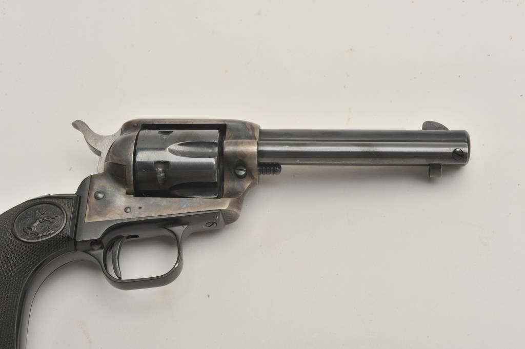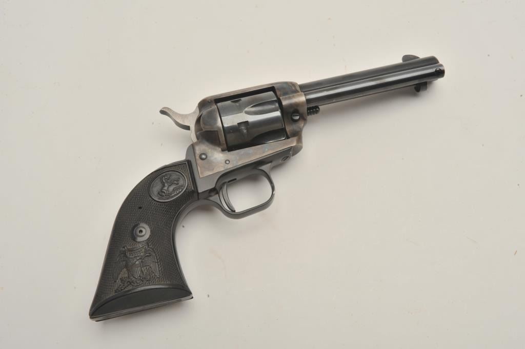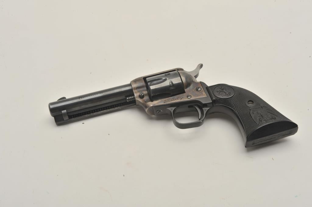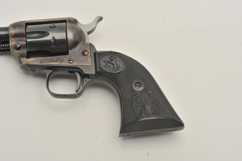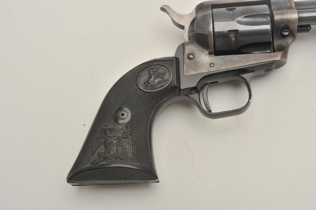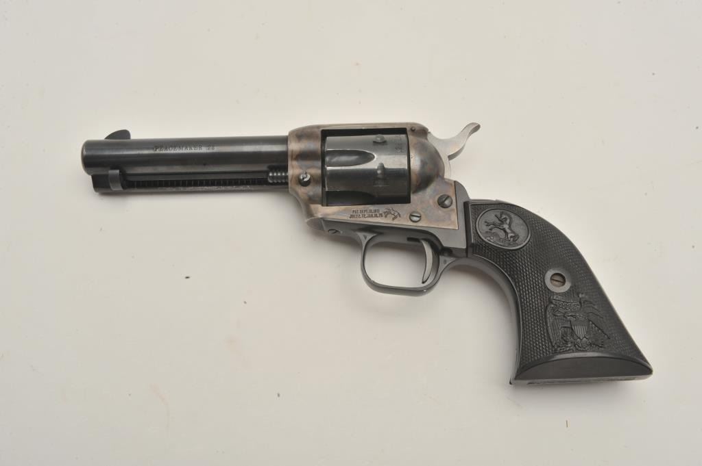 18BG-7 PEACEMAKER #G116688Colt Peacemaker Model SAA revolver, .22LR caliber, 4.5” barrel, blued and case hardened finish, checkered hard rubber eagle grips, S/N G116688, in overall fine condition with majority of original finish, fine bore,action, markings and grips. (Modern/PPT). Est.: $300-$600.Colt Peacemaker Model SAA revolver, .22LR caliber, 4.5” barrel, blued and case hardened finish, checkered hard rubber eagle grips, S/N G116688, in overall fine condition with majority of original finish, fine bore,action, markings and grips. (Modern/PPT). Est.: $300-$600.
