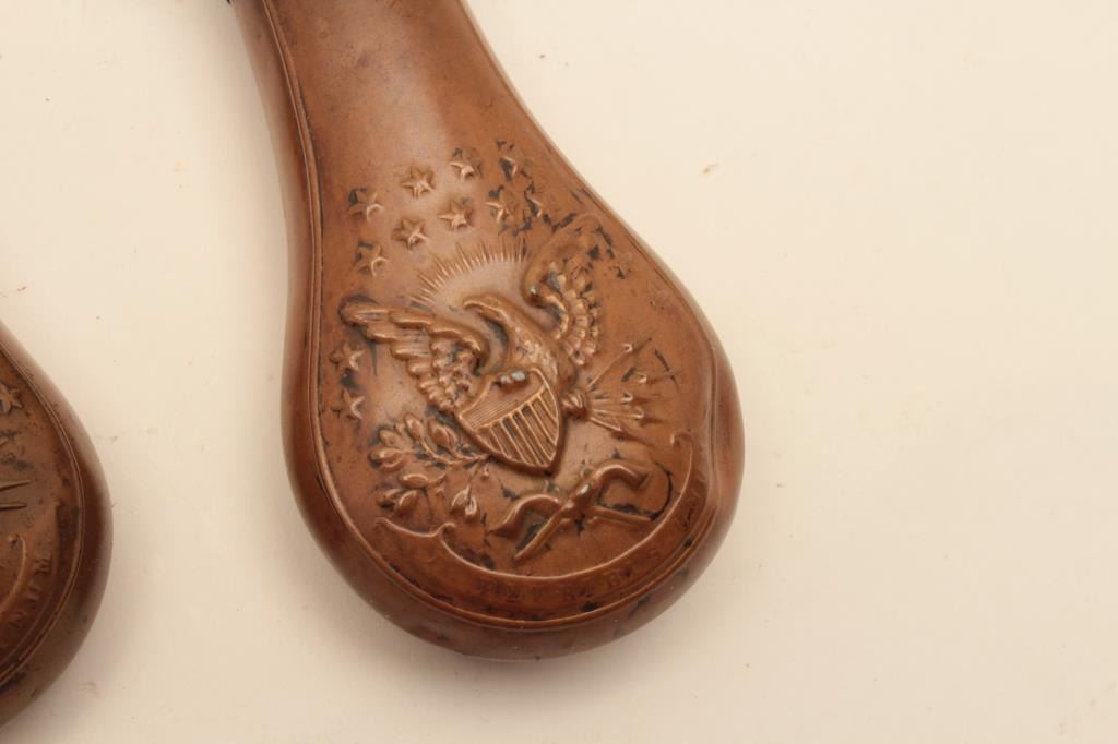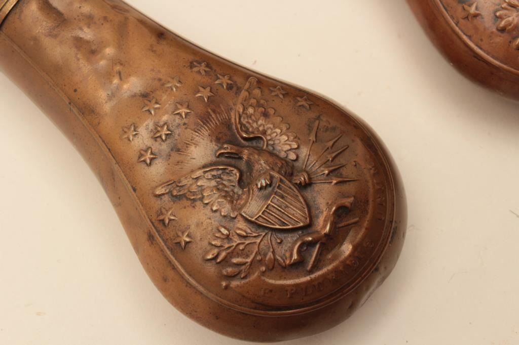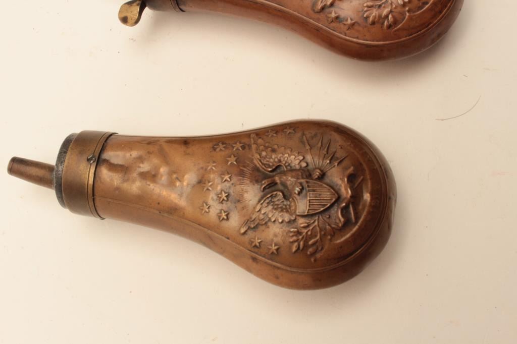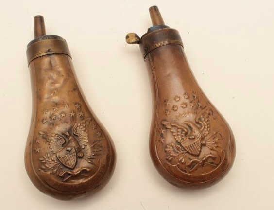 18AL-74 COLT FLASKSTwo brass powder flask for Colt Model 1849 Pocket percussion revolvers, in good only condition; one showing several old dents; one showing many old dents. Est.: $150-$300.Two brass powder flask for Colt Model 1849 Pocket percussion revolvers, in good only condition; one showing several old dents; one showing many old dents. Est.: $150-$300.