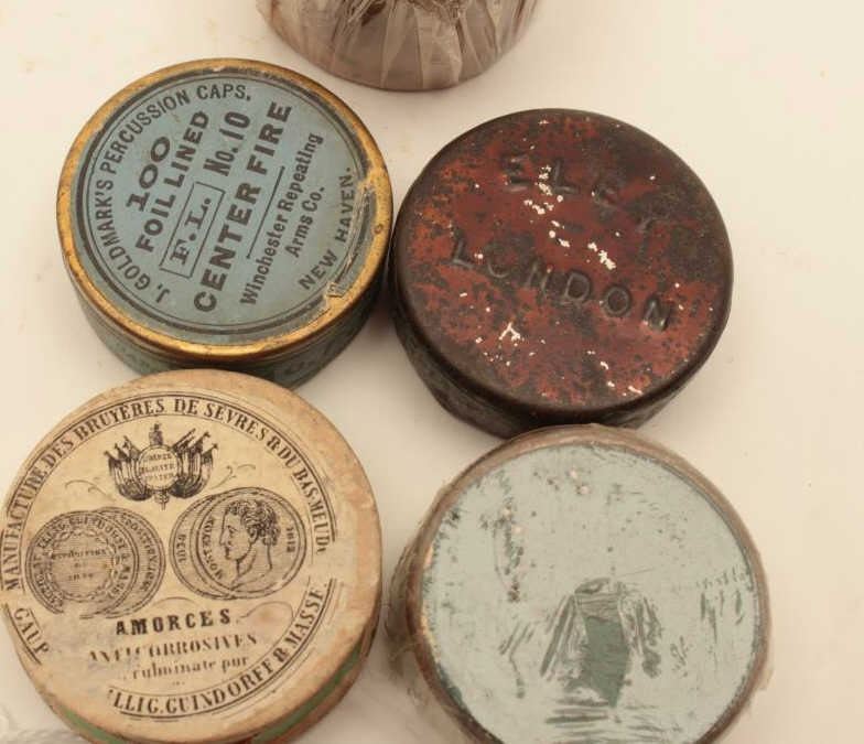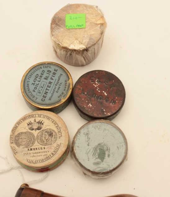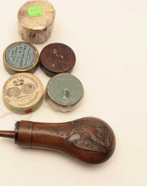 18AL-76 EAGLE FLASK & CAP TINPercussion accessories lot including a brass eagle powder flask and 5 cap tins, one being an Eley Bro. for Colt’s Pt. Belt and Pocket pistols tin. Est.: $300-$600.Percussion accessories lot including a brass eagle powder flask and 5 cap tins, one being an Eley Bro. for Colt’s Pt. Belt and Pocket pistols tin. Est.: $300-$600.