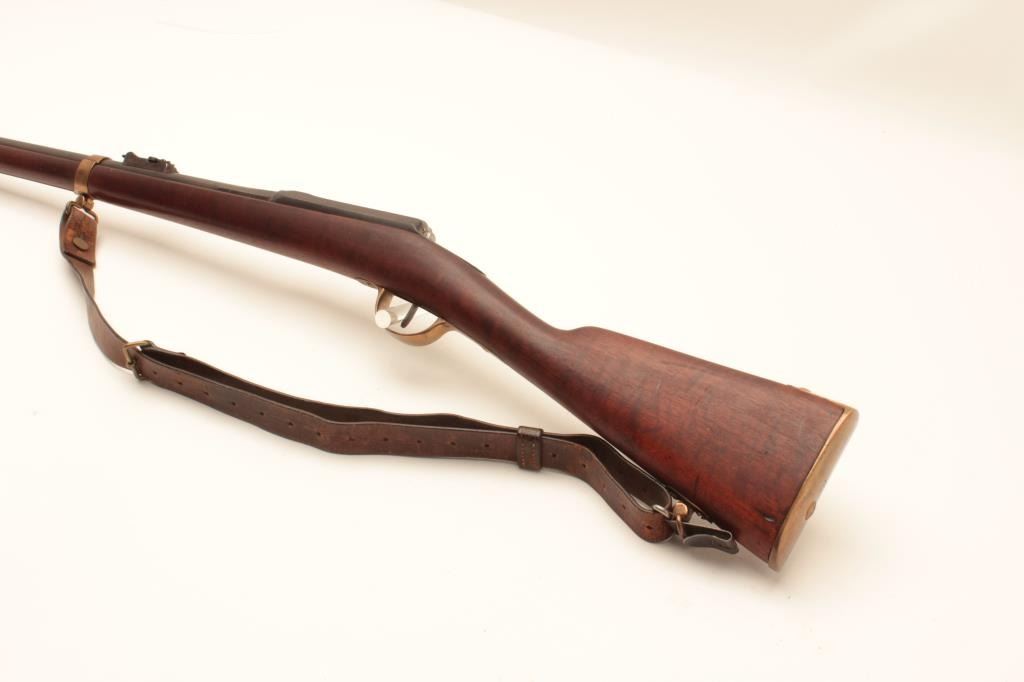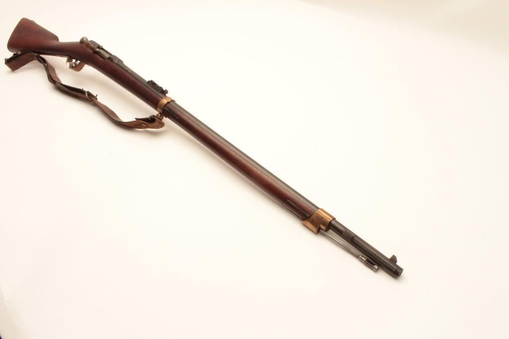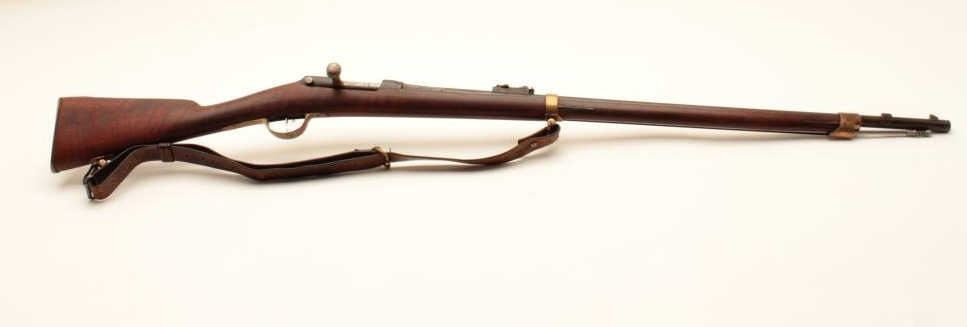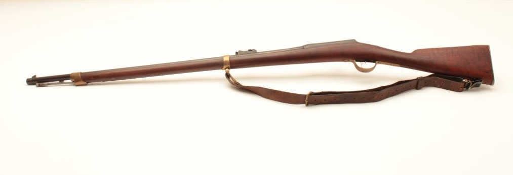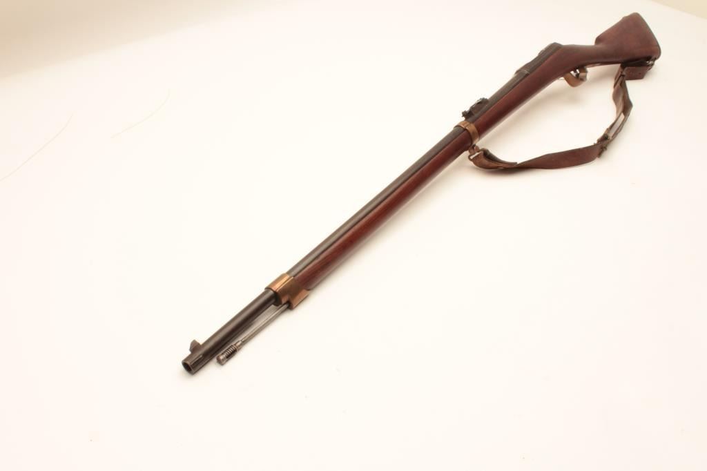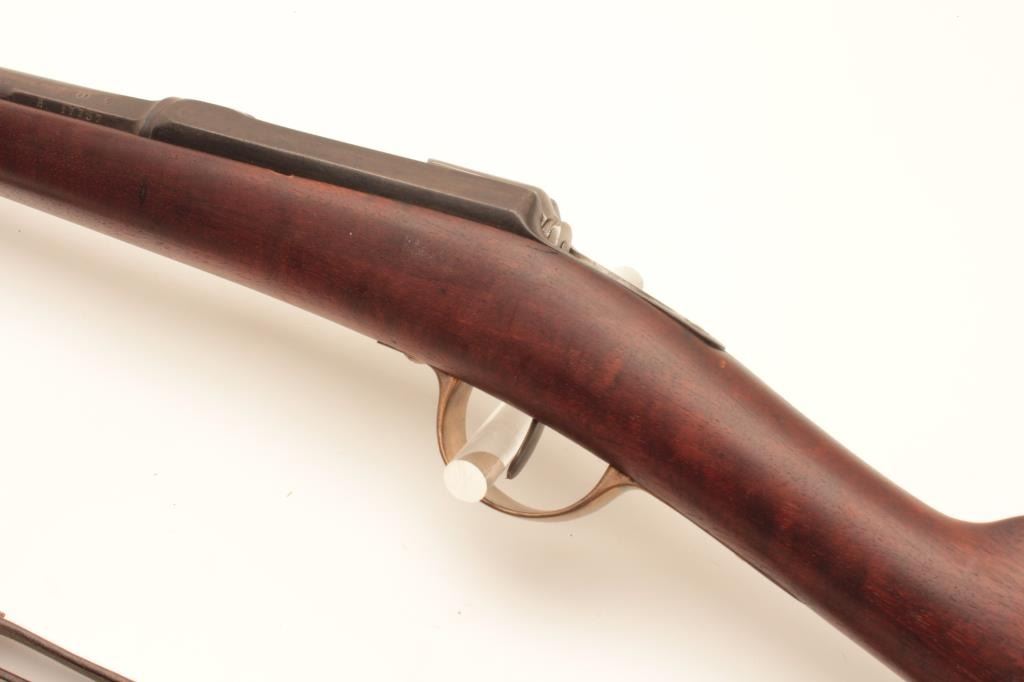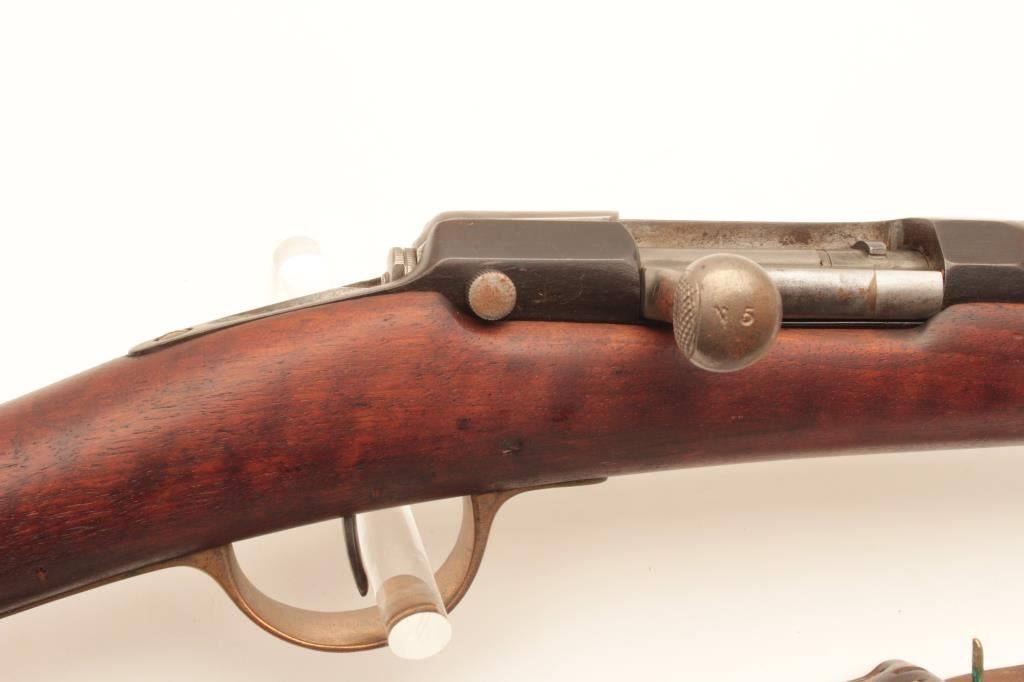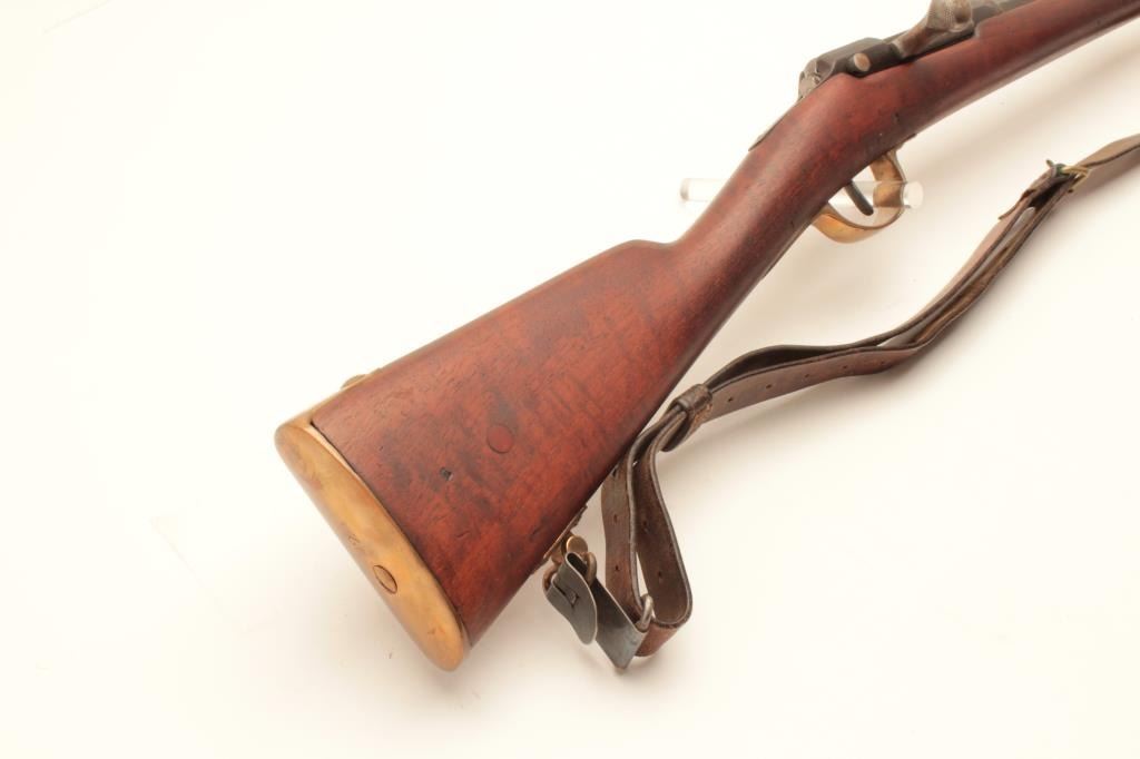 17KH-548 71 MAUSER #17757Model 71 Mauser style bolt action rifle marked Kynoch’s Patent, .43-77 caliber marked on breech, blued finish, wood stock, brass mounted, leather sling, S/N 17757, in overall good + condition with good + bore, crispaction, good markings and considerable muted blued finish remaining; good wood stock. (Antique). Est.: $350-$700.Model 71 Mauser style bolt action rifle marked Kynoch’s Patent, .43-77 caliber marked on breech, blued finish, wood stock, brass mounted, leather sling, S/N 17757, in overall good + condition with good + bore, crispaction, good markings and considerable muted blued finish remaining; good wood stock. (Antique). Est.: $350-$700.
