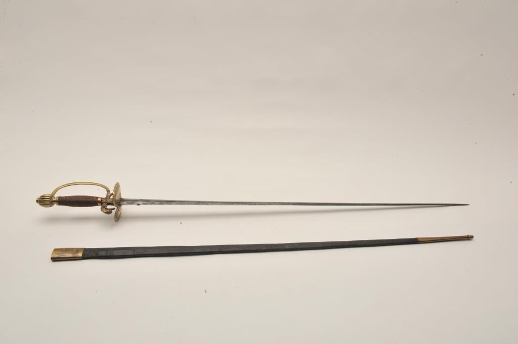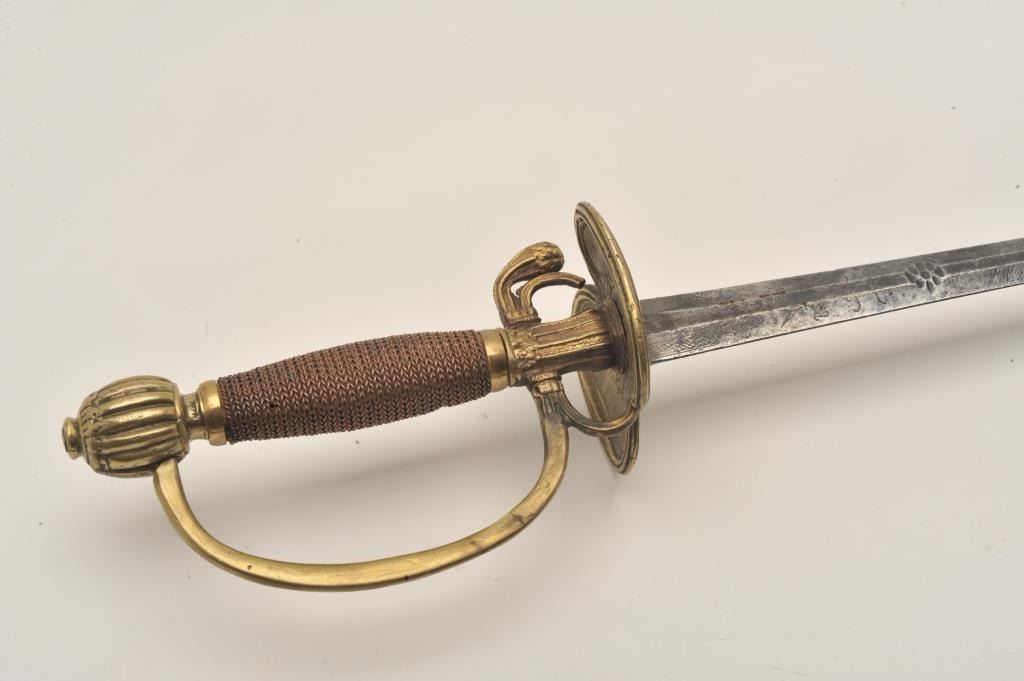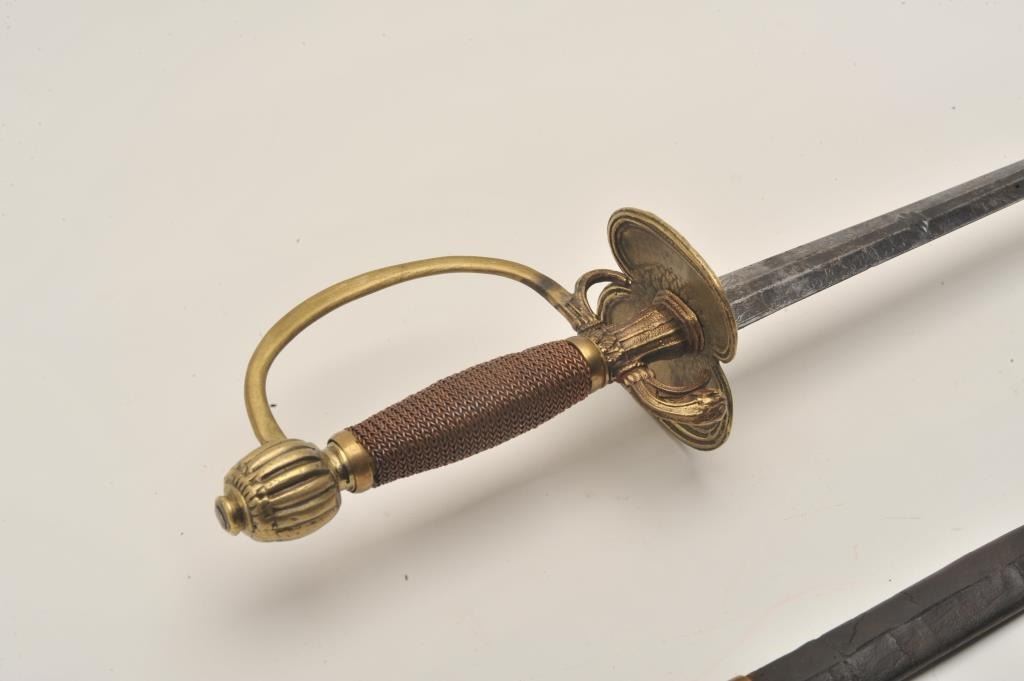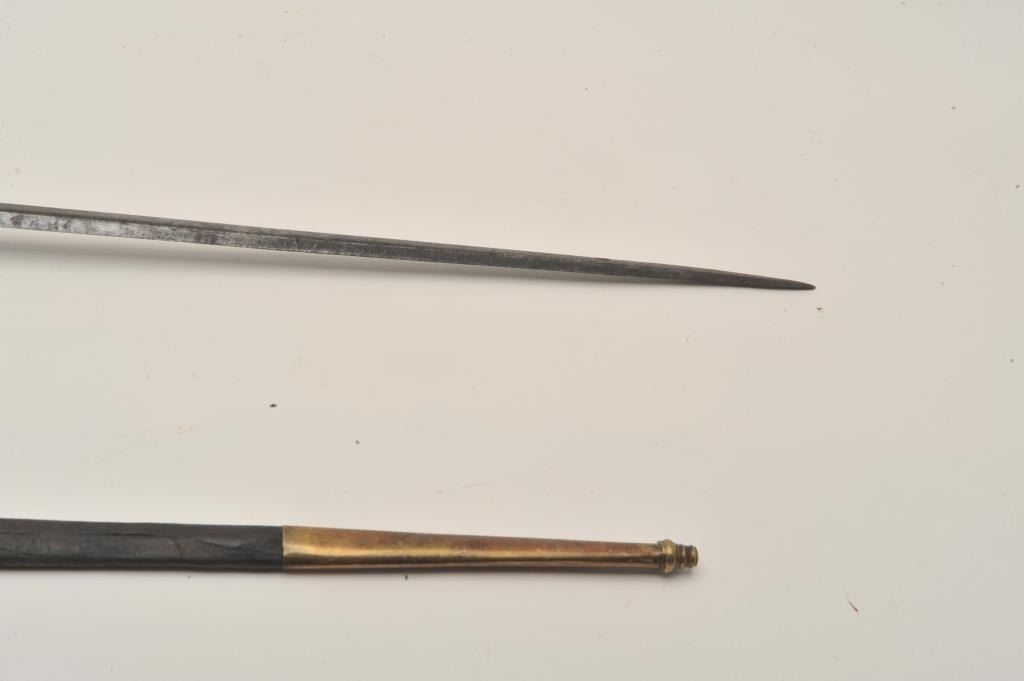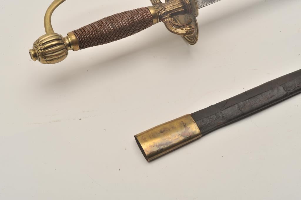 18AR-17 FRENCH SMALL SWORDFrench small sword circa 18th century with cast brass hilt showing gold gilt and copper wire wrapped grip. Good blade with light engraving of sun and stands of arms. Nicely forged and formed with raised and taperededges. Minor pitting. Good leather covered brass mounted scabbard for this sword but later. Est.: $350-$700French small sword circa 18th century with cast brass hilt showing gold gilt and copper wire wrapped grip. Good blade with light engraving of sun and stands of arms. Nicely forged and formed with raised and taperededges. Minor pitting. Good leather covered brass mounted scabbard for this sword but later. Est.: $350-$700
