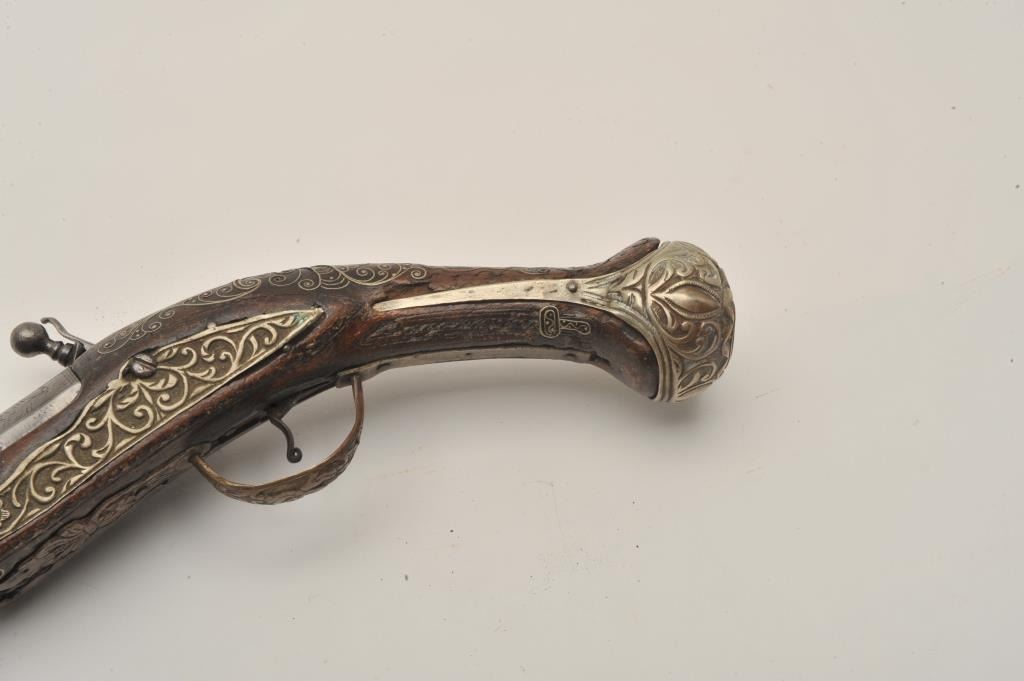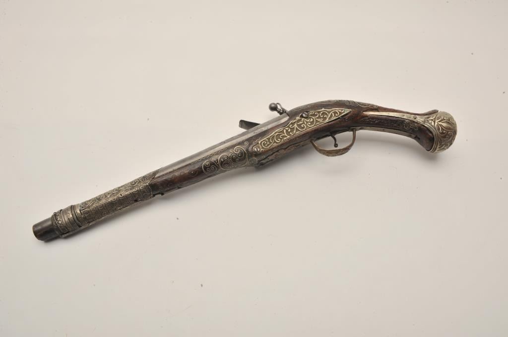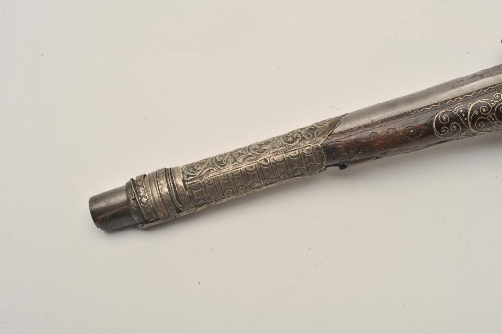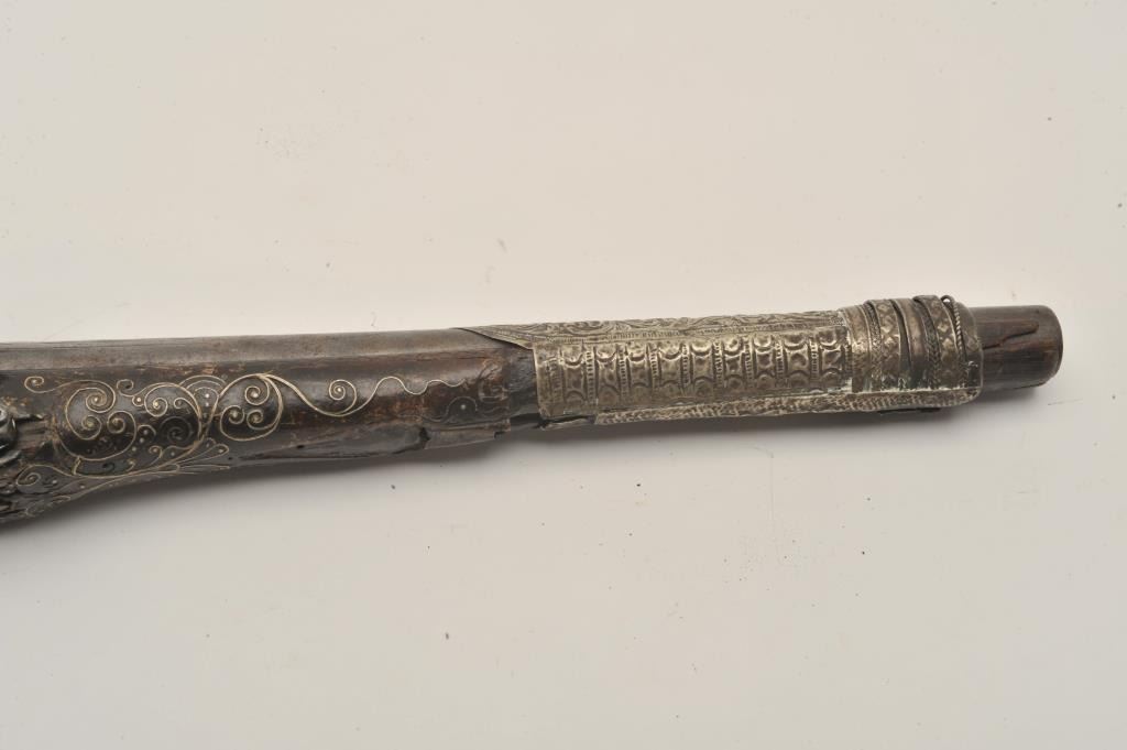 Lot 471 18AR-32 LONG FLINTLOCKEuropean made for mid-eastern trade flintlock pistol with silver mounts and b