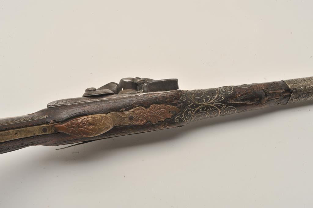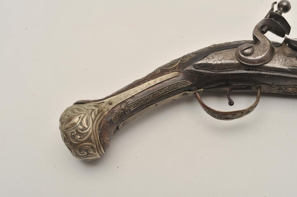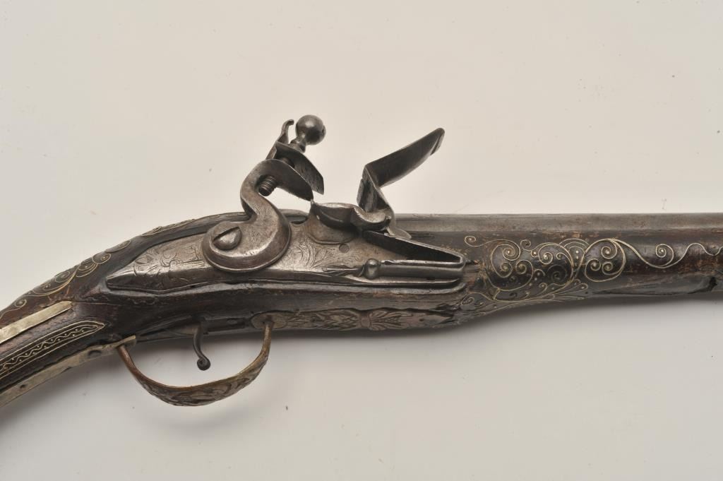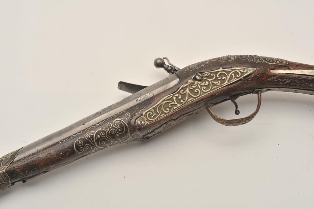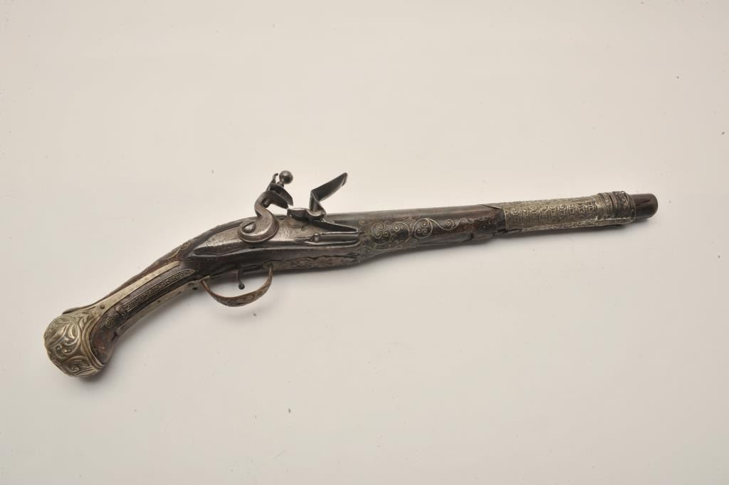 Lot 471 18AR-32 LONG FLINTLOCKEuropean made for mid-eastern trade flintlock pistol with silver mounts and b