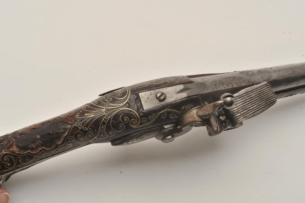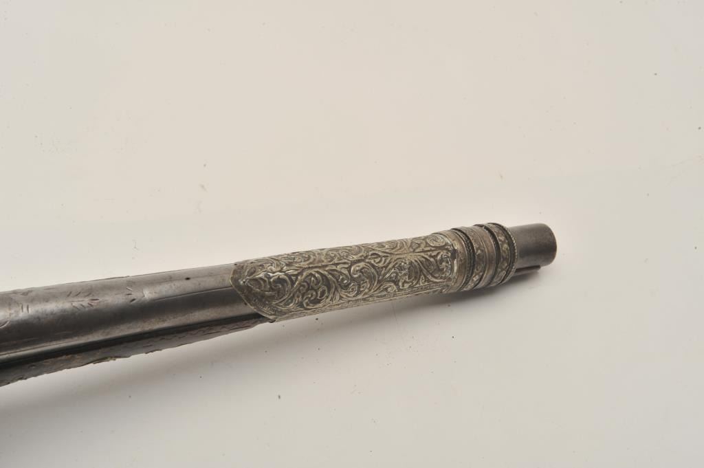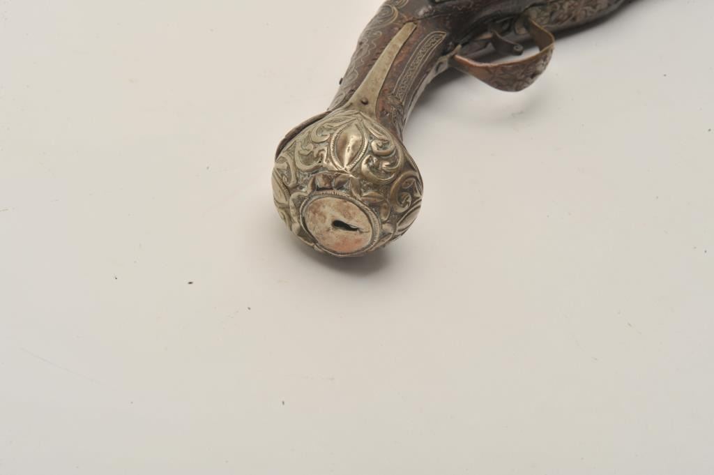 18AR-32 LONG FLINTLOCKEuropean made for mid-eastern trade flintlock pistol with silver mounts and barrel marked “1483” showing Arabic writings or date in the breach area. Almost 20” overall with a 12 ½” barrel of .60 plus caliber. Good quality18th century European lock and barrel. Mid-eastern hammered silver butt, side plate and barrel ornament. Silver wire inlays rear ramrod ferrule, and butt cap screw removed. European barrel proofs on the left side ofthe barrel. An earlier pistol of better than average quality with quality lock and barrel. (Antique) Est.: $500-$1000European made for mid-eastern trade flintlock pistol with silver mounts and barrel marked “1483” showing Arabic writings or date in the breach area. Almost 20” overall with a 12 ½” barrel of .60 plus caliber. Good quality18th century European lock and barrel. Mid-eastern hammered silver butt, side plate and barrel ornament. Silver wire inlays rear ramrod ferrule, and butt cap screw removed. European barrel proofs on the left side ofthe barrel. An earlier pistol of better than average quality with quality lock and barrel. (Antique) Est.: $500-$1000