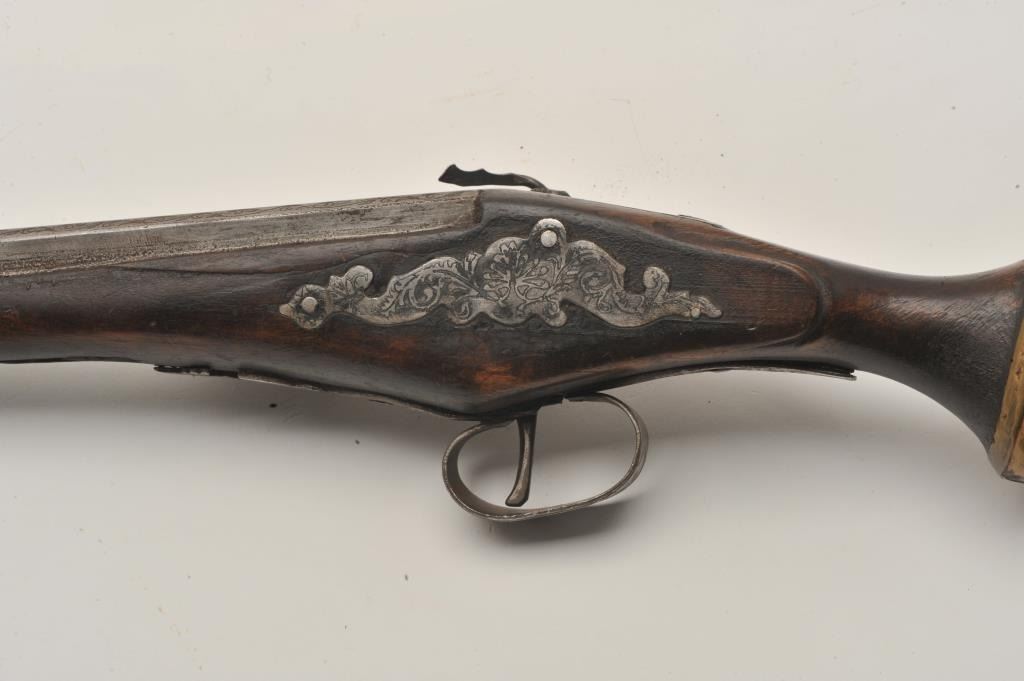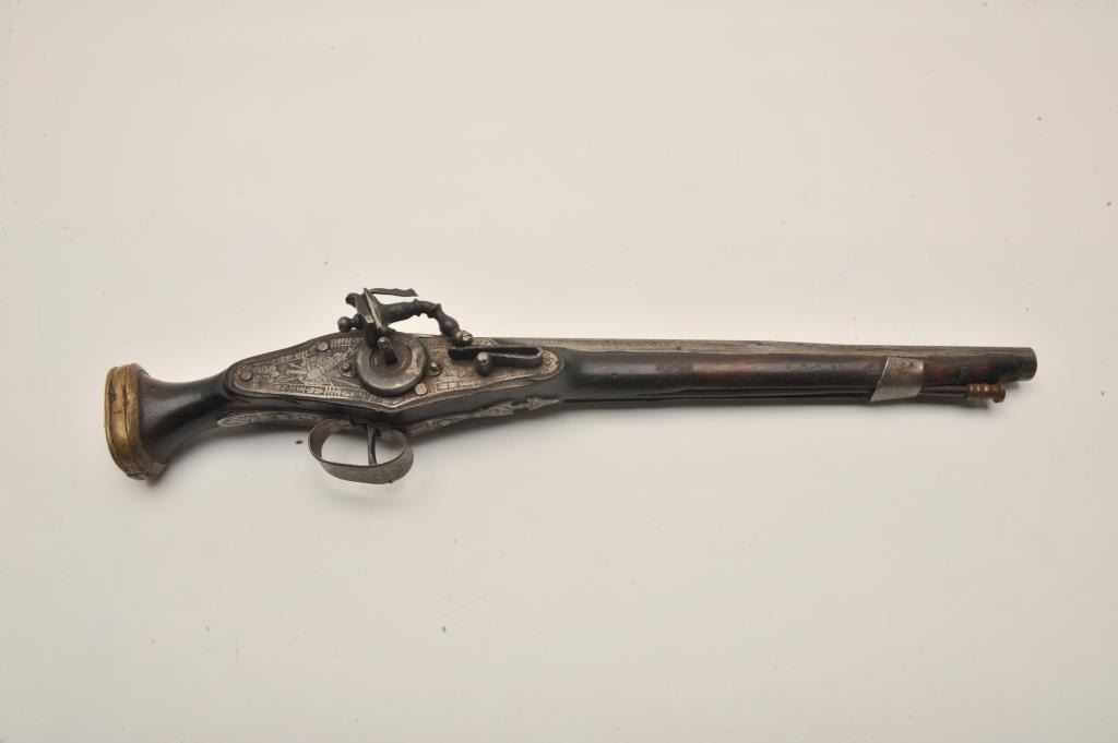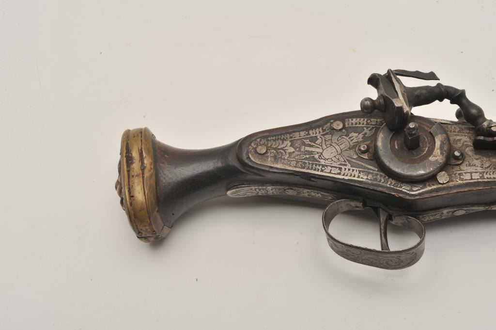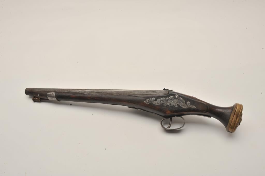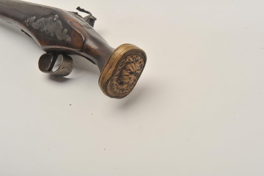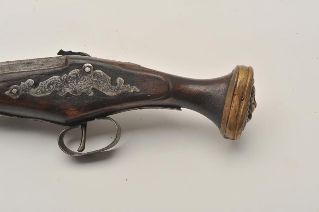 18AR-33 HANDMADE WHEELOCKEarly 20th century “Decorator” Wheelock with fancy etching and cast brass lion head butt. Measures 20” overall. Nonfunctioning but good for display. Better than a few I have seen at shows trying to be passed off for period!(Antique) Est.: $500-$1000Early 20th century “Decorator” Wheelock with fancy etching and cast brass lion head butt. Measures 20” overall. Nonfunctioning but good for display. Better than a few I have seen at shows trying to be passed off for period!(Antique) Est.: $500-$1000