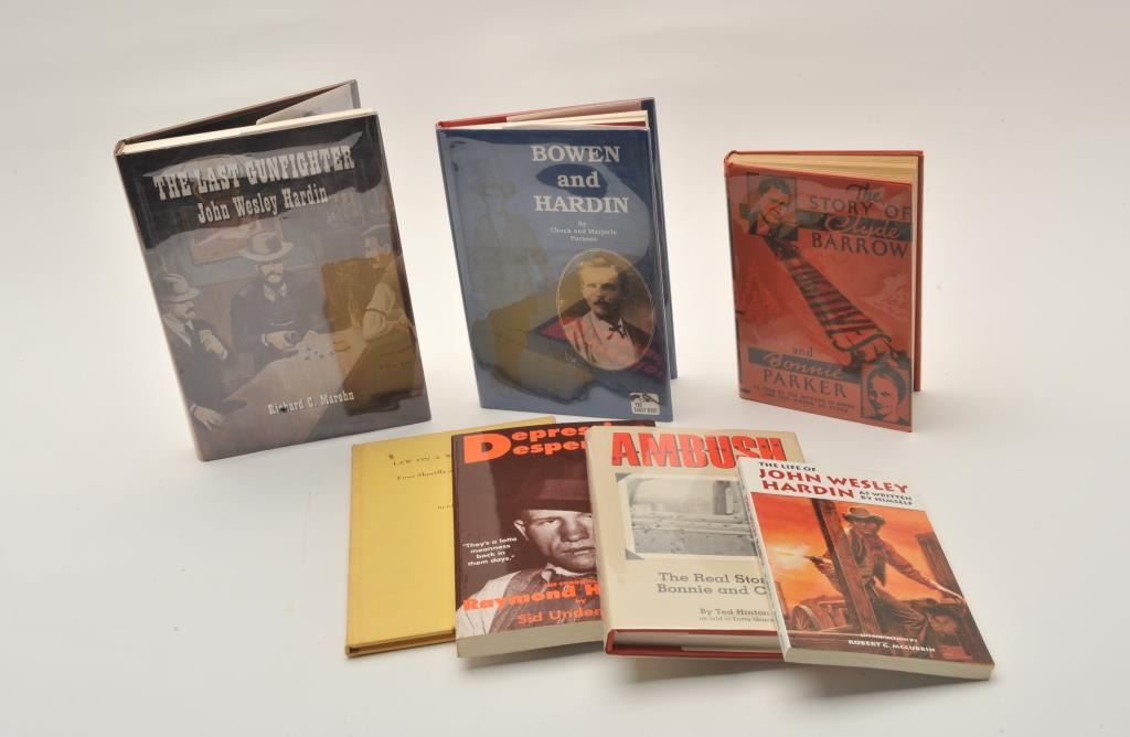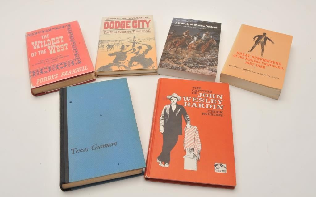 18EMY-8 LOT OF OUTLAW/LAWMAN BOOKSLot of approximately 18 reference books on outlaws and lawmen, many out-of-print, including 6 different books on John Wesley Hardin, 3 different books on Bonnie and Clyde, A Dynasty of Western Outlaws byWellman, Great Gunfighters of the Kansas Cowtowns by Miller & Snell, The Wildest of the West by Parkhill, etc. Est.: $150-$300.Lot of approximately 18 reference books on outlaws and lawmen, many out-of-print, including 6 different books on John Wesley Hardin, 3 different books on Bonnie and Clyde, A Dynasty of Western Outlaws byWellman, Great Gunfighters of the Kansas Cowtowns by Miller & Snell, The Wildest of the West by Parkhill, etc. Est.: $150-$300.