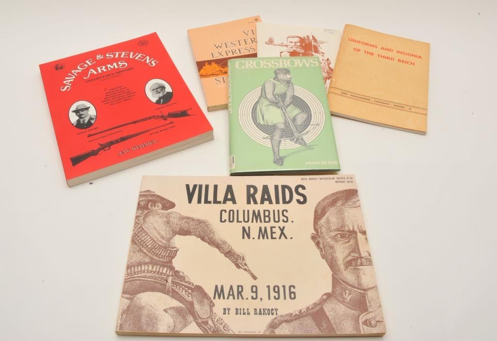 18EMY-14 BOOK LOTLot of approximately 26 reference books, many out-of-print, on the Mexican Border War, Express Companies and antique and collectible firearms including The Great Pursuit by Mason, Jr., Viva Villa by Pinchon, GuerrillaWarrior; the Early Life of John J. Pershing by Smythe, Villa Raids; Columbus, N. M. by Rakocy, Savage and Stevens Arms by Kimmel, The Rifle in America by Sharpe, Crossbows by Bilson, Nevada Express, 1857-1895, by Gamett, etc. Est.: $150-$300.Lot of approximately 26 reference books, many out-of-print, on the Mexican Border War, Express Companies and antique and collectible firearms including The Great Pursuit by Mason, Jr., Viva Villa by Pinchon, GuerrillaWarrior; the Early Life of John J. Pershing by Smythe, Villa Raids; Columbus, N. M. by Rakocy, Savage and Stevens Arms by Kimmel, The Rifle in America by Sharpe, Crossbows by Bilson, Nevada Express, 1857-1895, by Gamett, etc. Est.: $150-$300.