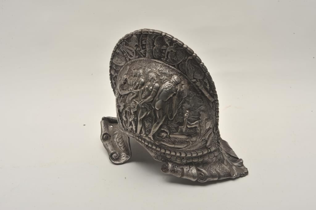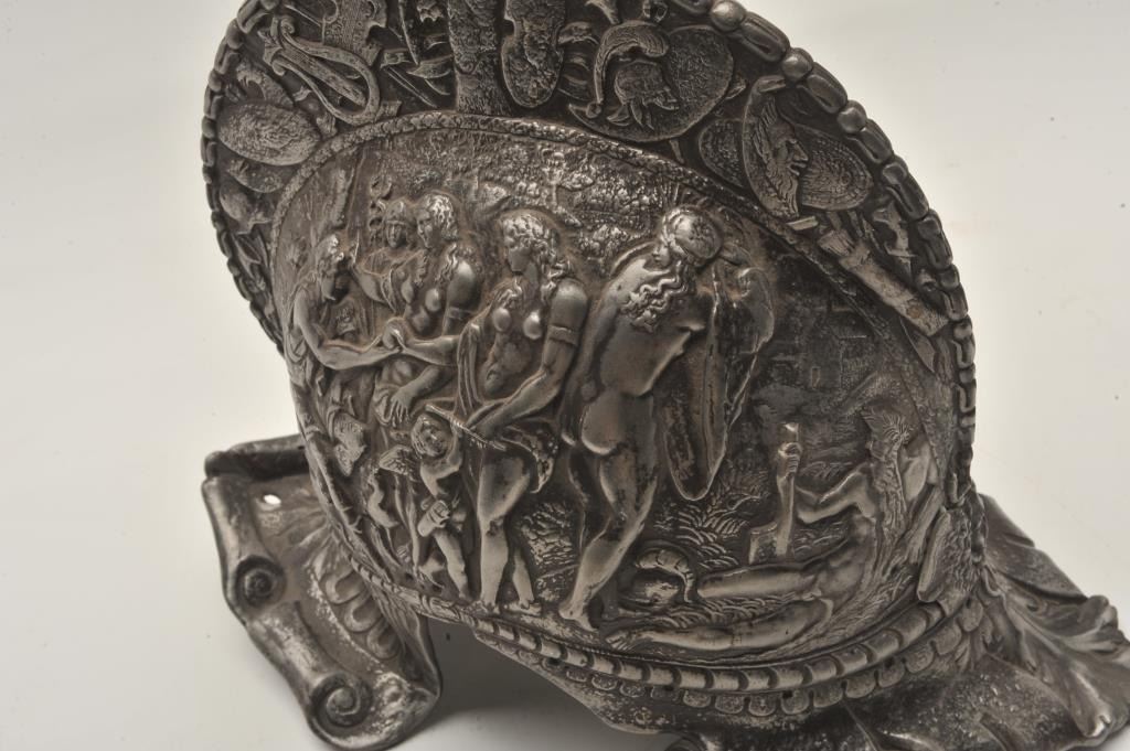 18AT-18 CAST IRON MUSEUM COPY HELMETCast iron morian from Victorian era showing nudes and ancient scenes. Masde as a display . Study pieces and a genuine antique. Est.: $500-$1000Cast iron morian from Victorian era showing nudes and ancient scenes. Masde as a display . Study pieces and a genuine antique. Est.: $500-$1000