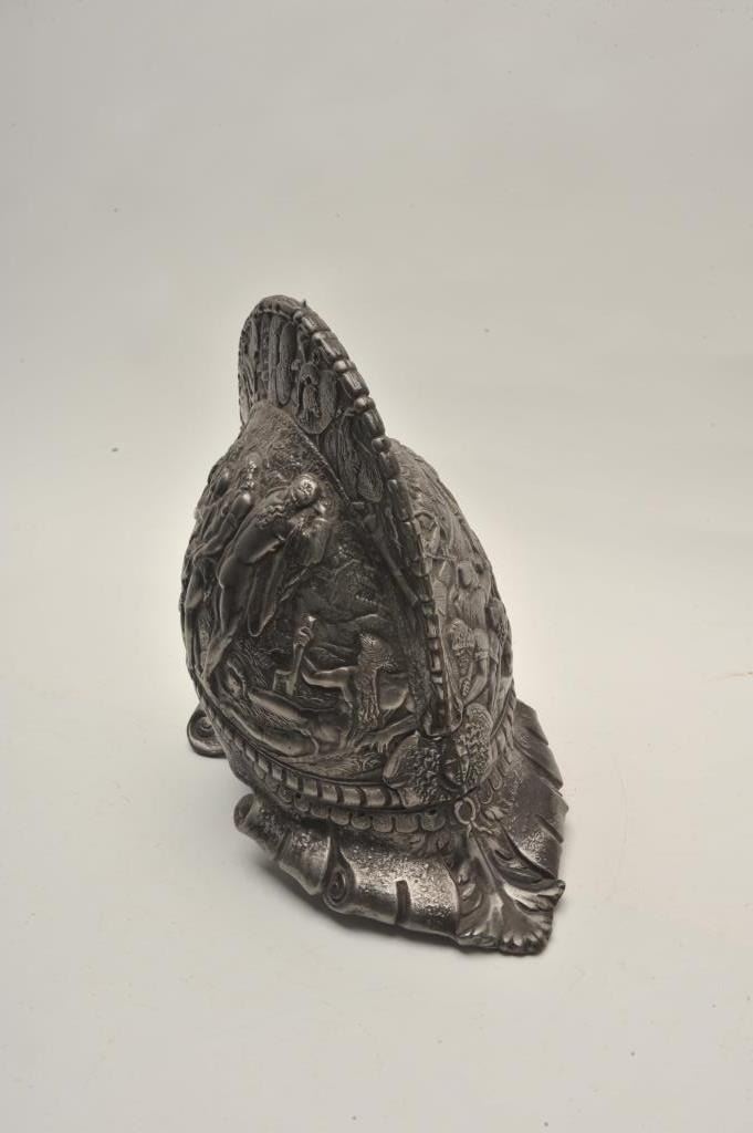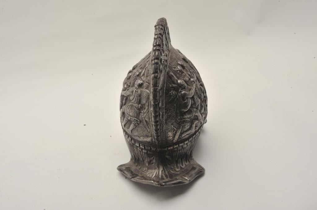Lot 484 18AT-18 CAST IRON MUSEUM COPY HELMETCast iron morian from Victorian era showing nudes and ancient s