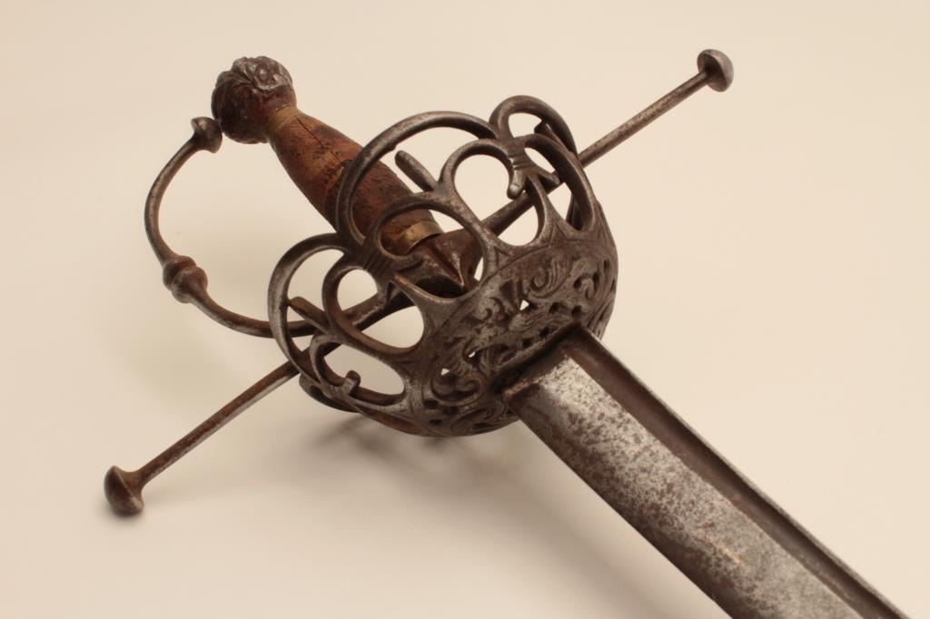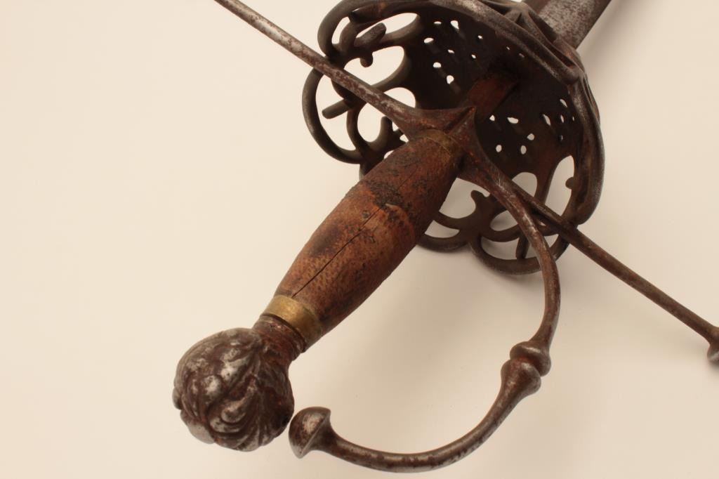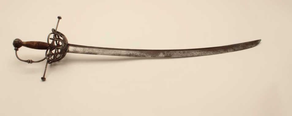 18AT-7 CUP HILT PIRATE STYLEEarly cup hilt with cutless blade probably associated parts from 17th and 18th century. Measures 34” overall with a 27” blade. Old burnt cord wrapped grip. Light to moderate pitting. Exactly what a pirate could havecarried circa 1600-1700s. Est.: $500-$1000Early cup hilt with cutless blade probably associated parts from 17th and 18th century. Measures 34” overall with a 27” blade. Old burnt cord wrapped grip. Light to moderate pitting. Exactly what a pirate could havecarried circa 1600-1700s. Est.: $500-$1000