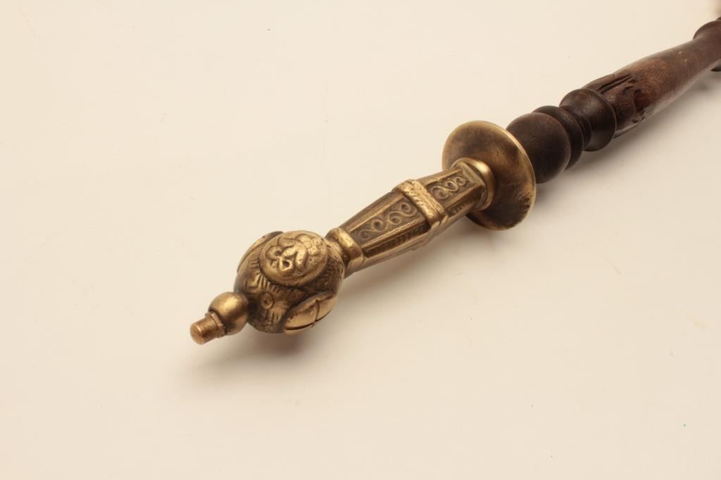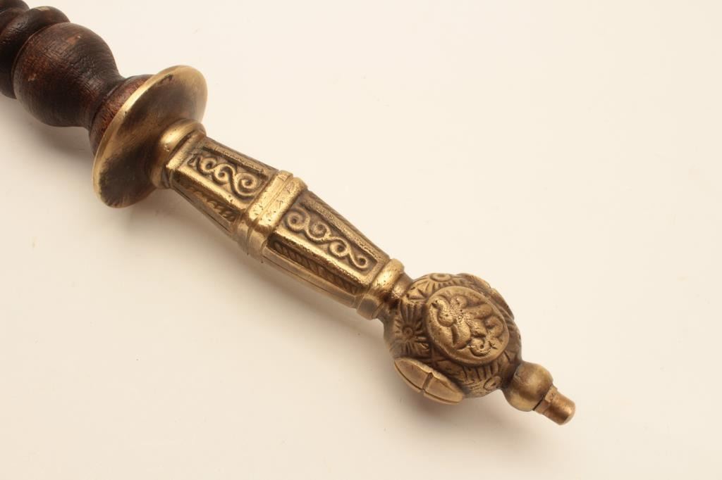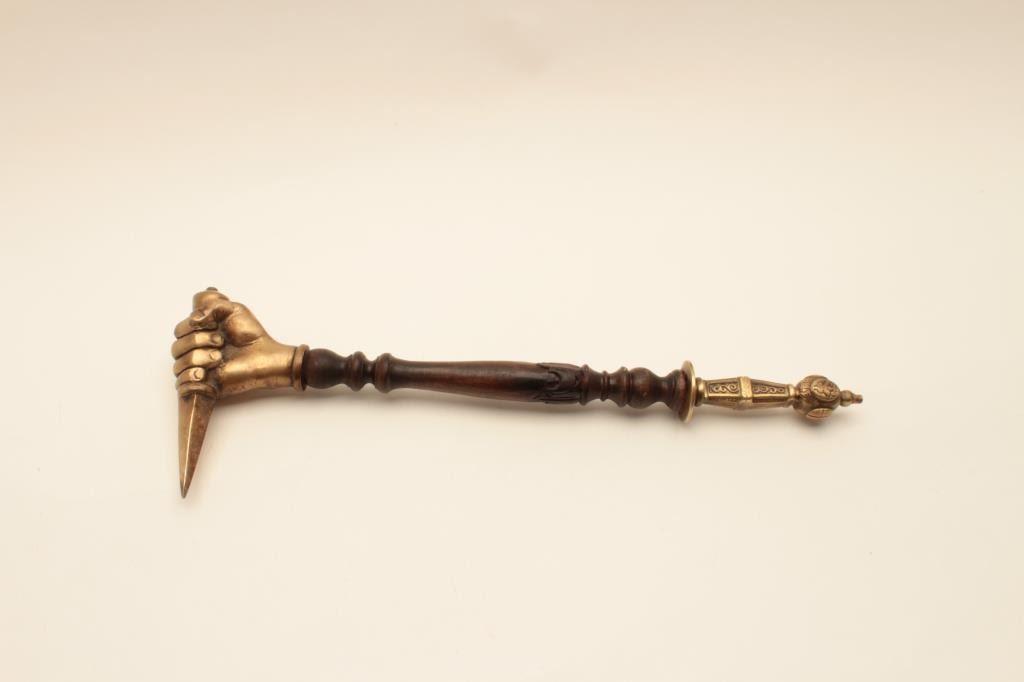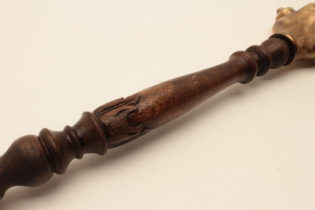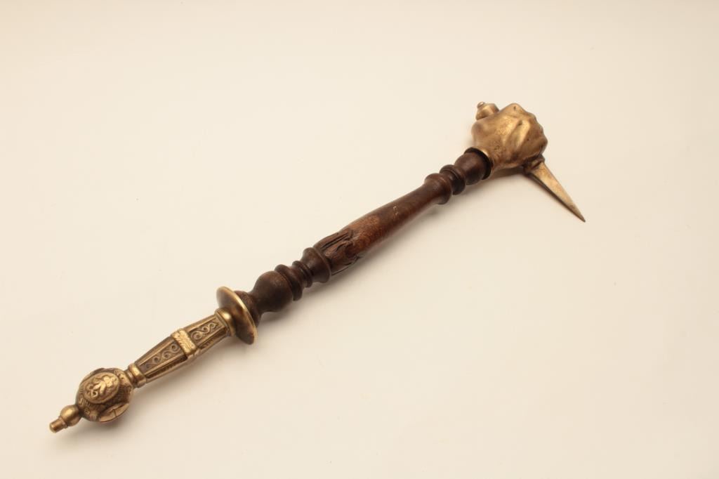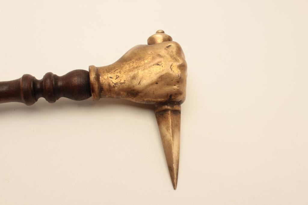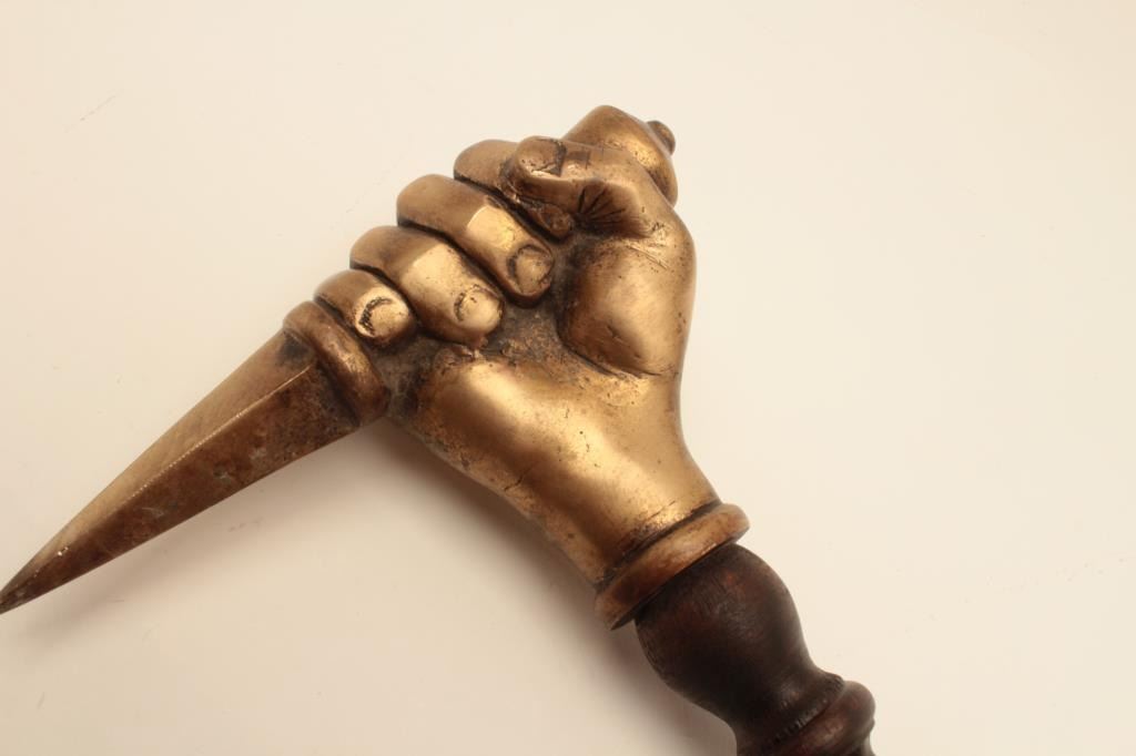 18AT-8 WAR HAMMERReproduction cast brass war hammer with clenched fist. The war hammer is approximately 22” in length with an ornate brass handle and wooden shaft. The top end is a brass cast of a clenched fist holding a4” dagger. The piece is in very good condition. Est.: $250-$500.Reproduction cast brass war hammer with clenched fist. The war hammer is approximately 22” in length with an ornate brass handle and wooden shaft. The top end is a brass cast of a clenched fist holding a4” dagger. The piece is in very good condition. Est.: $250-$500.