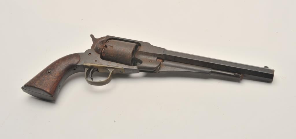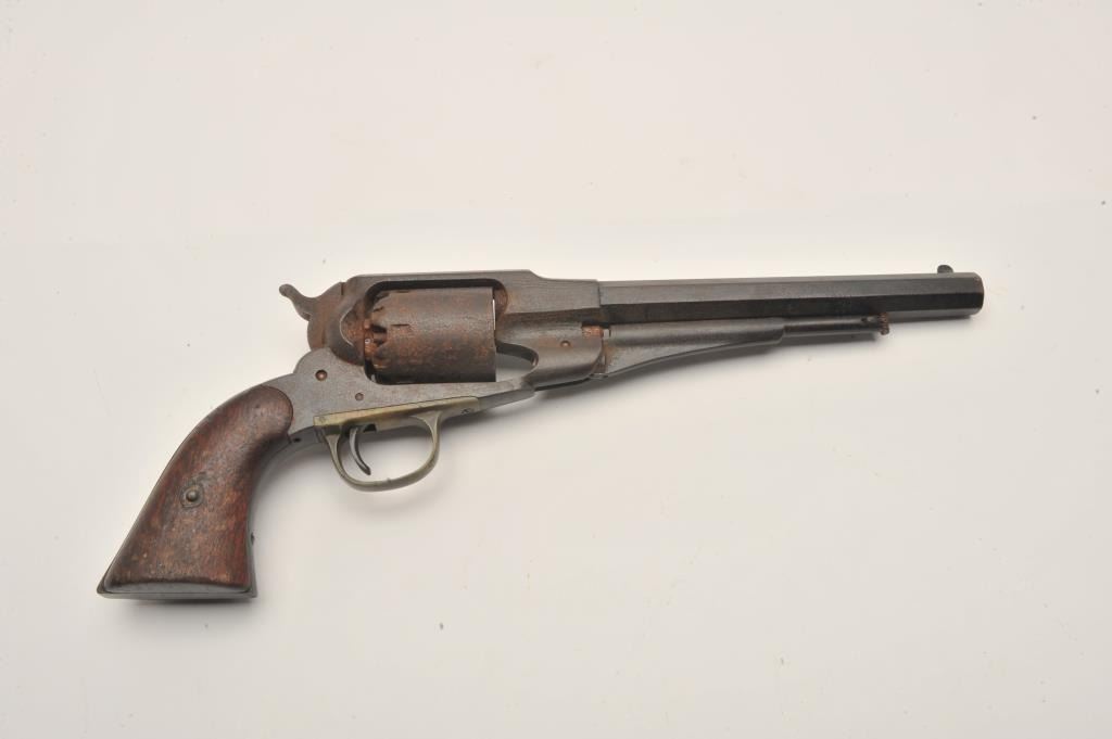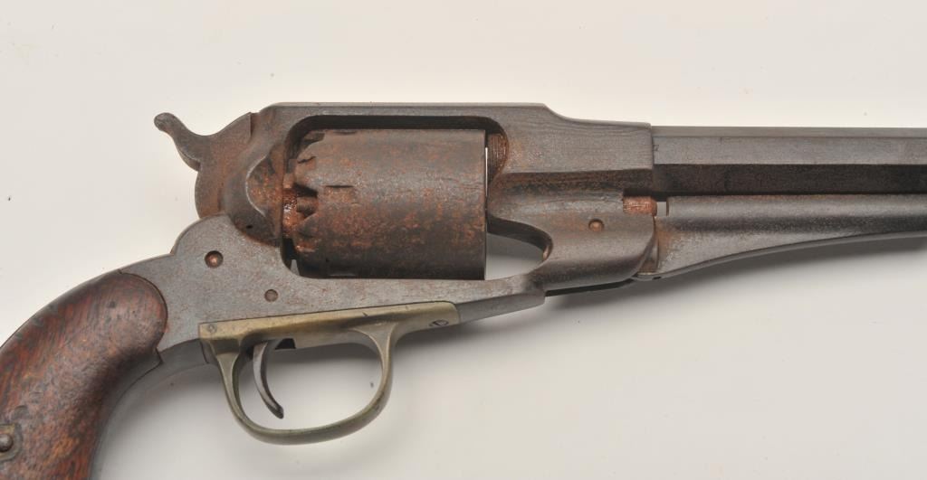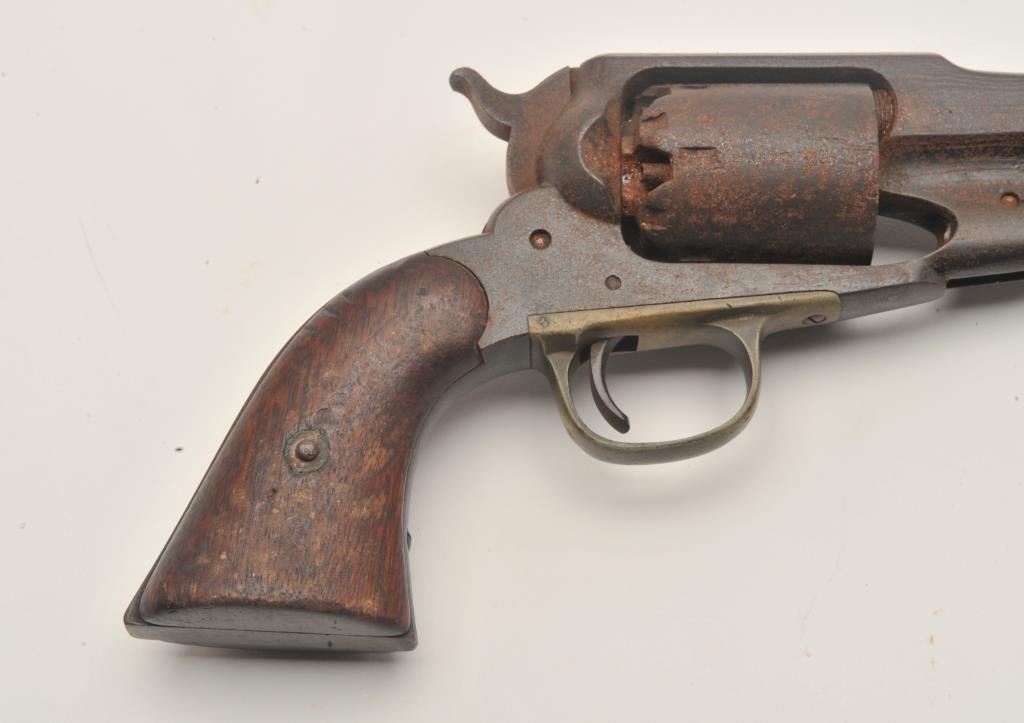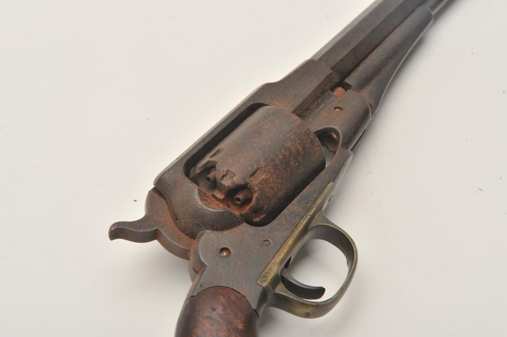 17MJ-1 REMINGTON 58Remington Model 1858 percussion revolver, .44 caliber, wood grips, S/N 49977, heavy dark patina and surface rust to metal, action not working, worn grips. (Antique). Est.: $350-$700.Remington Model 1858 percussion revolver, .44 caliber, wood grips, S/N 49977, heavy dark patina and surface rust to metal, action not working, worn grips. (Antique). Est.: $350-$700.