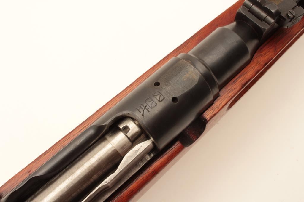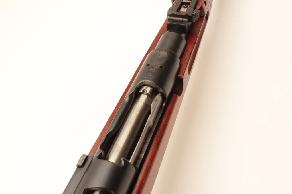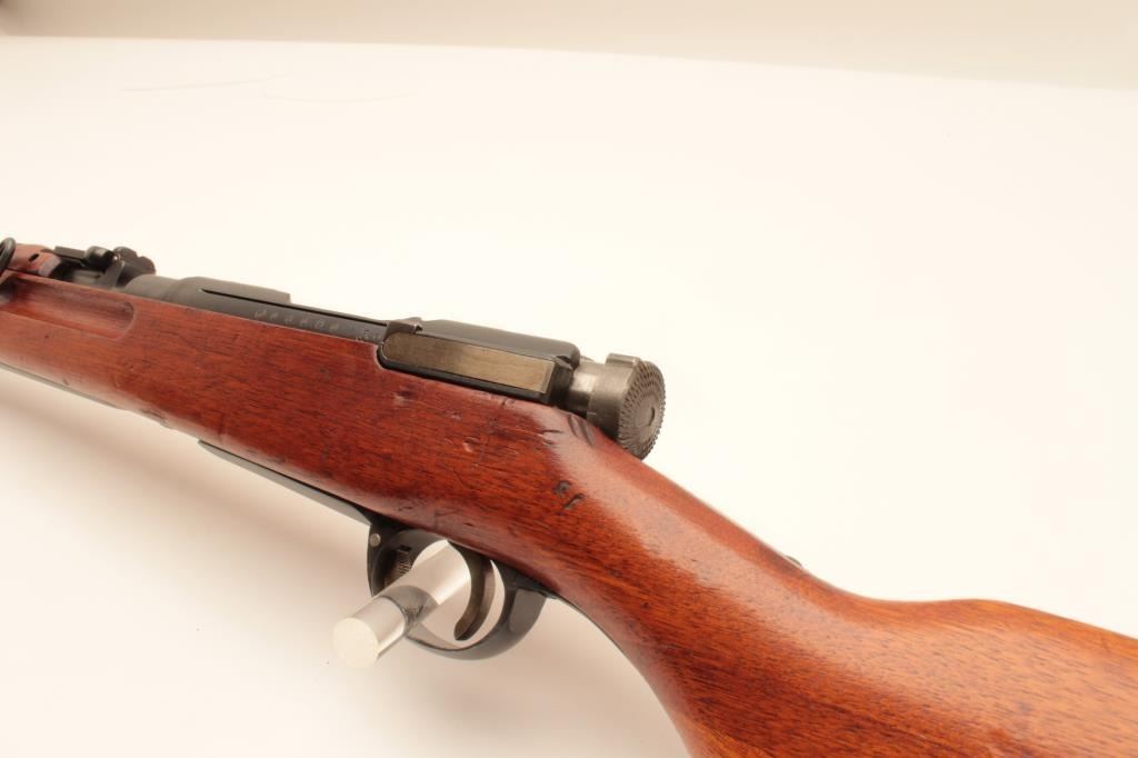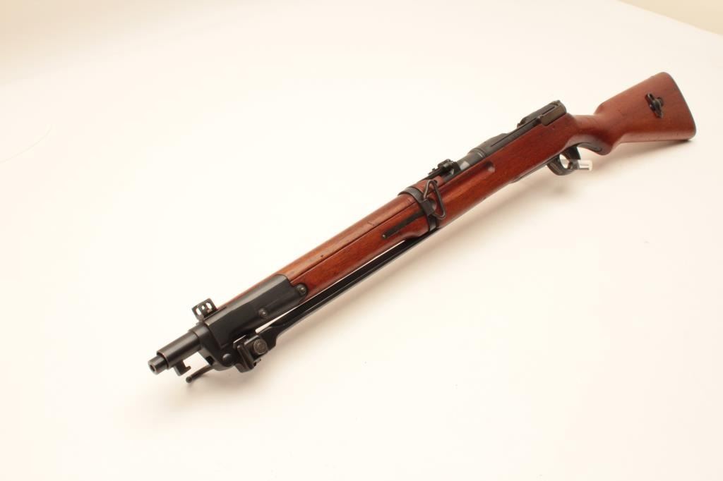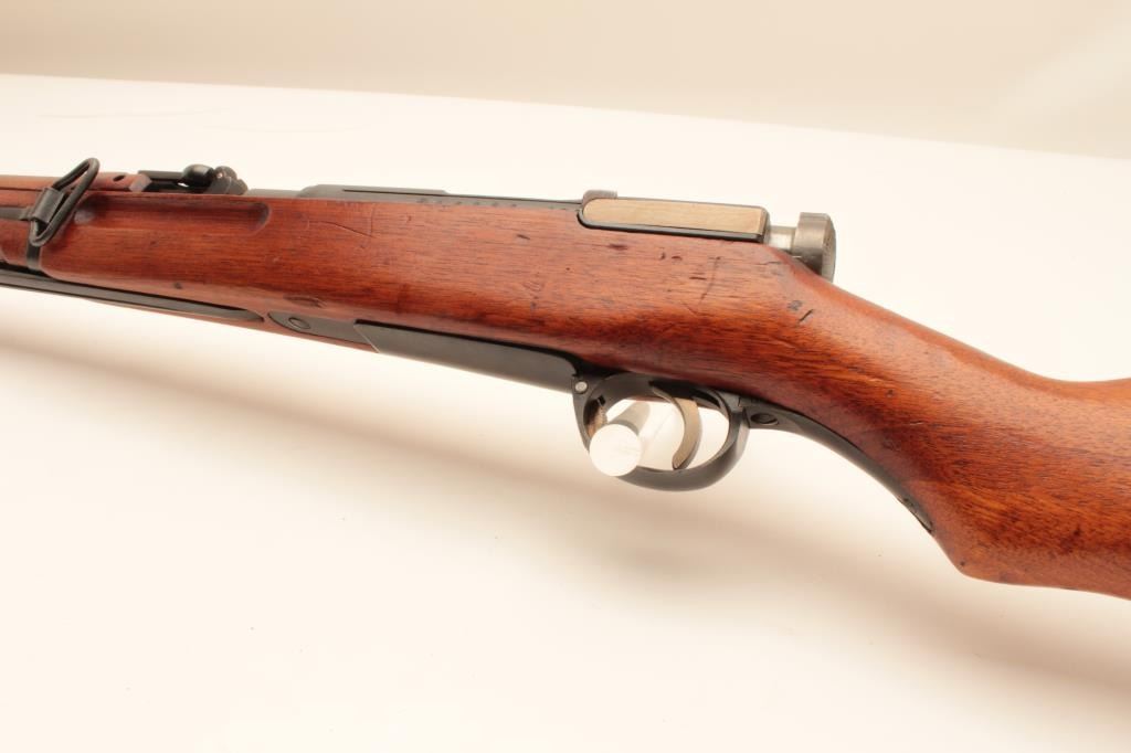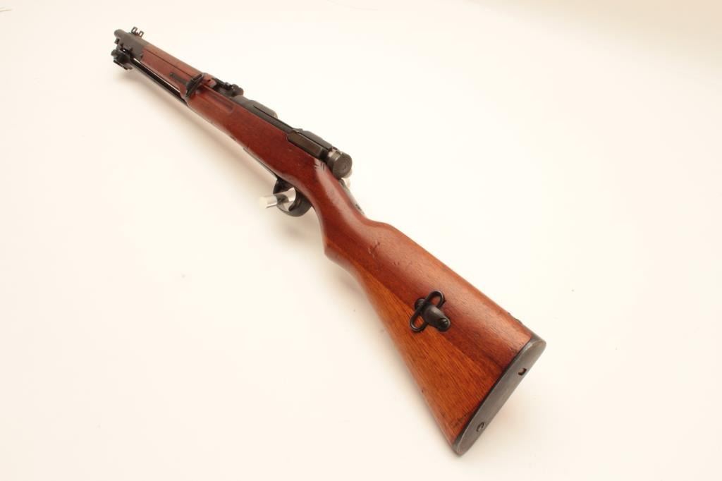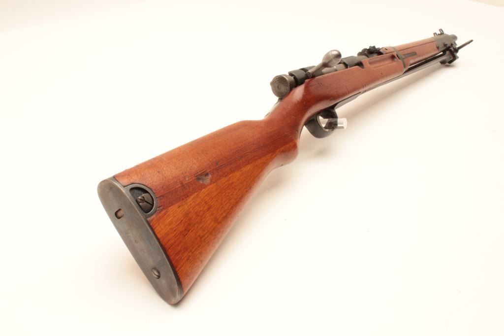 17MH-35 ARISAKA CARBINE #06090Japanese Arisaka bolt action carbine with folding bayonet, 6.5mm caliber, military finish, ground mum, Japanese characters present, wood stock, S/N 06090, in overall good to very good condition with majority ofmilitary finish, good bore, crisp action, good markings and very good wood stock. (C&R/PPT). Est.: $400-$800.Japanese Arisaka bolt action carbine with folding bayonet, 6.5mm caliber, military finish, ground mum, Japanese characters present, wood stock, S/N 06090, in overall good to very good condition with majority ofmilitary finish, good bore, crisp action, good markings and very good wood stock. (C&R/PPT). Est.: $400-$800.