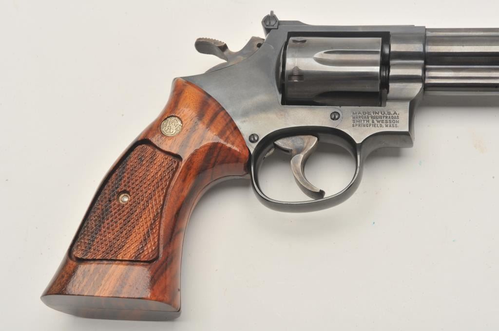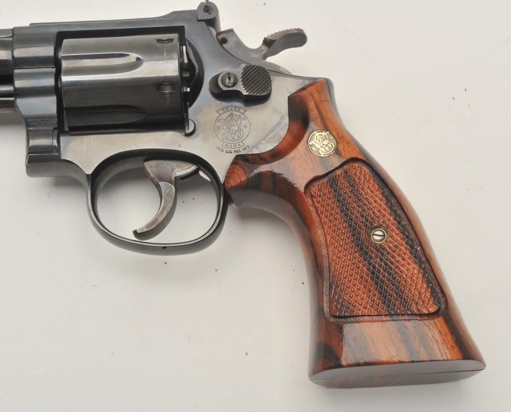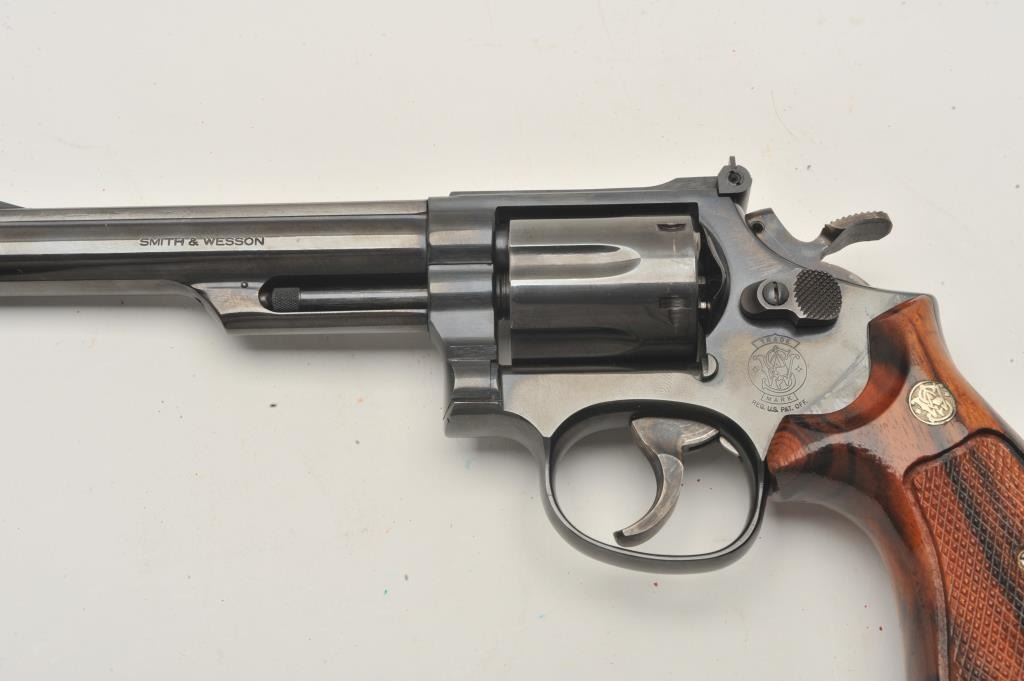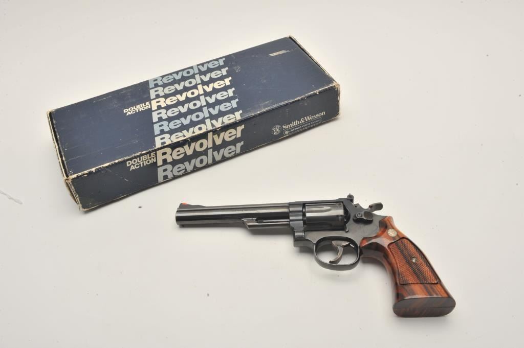 17MH-56 S&W 19-5 #168K247Smith & Wesson Model 19-5 DA revolver, .357 Magnum caliber, 6” barrel, target hammer and trigger, checkered wood medallion grips, S/N 168K247, in overall fine condition showing little handling; accompanied by factorycardboard box with end label numbered to this gun. (Modern/PPT). Est.: $350-$700.Smith & Wesson Model 19-5 DA revolver, .357 Magnum caliber, 6” barrel, target hammer and trigger, checkered wood medallion grips, S/N 168K247, in overall fine condition showing little handling; accompanied by factorycardboard box with end label numbered to this gun. (Modern/PPT). Est.: $350-$700.