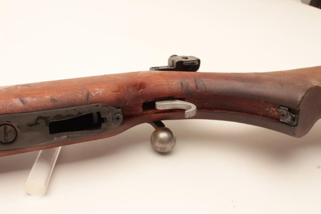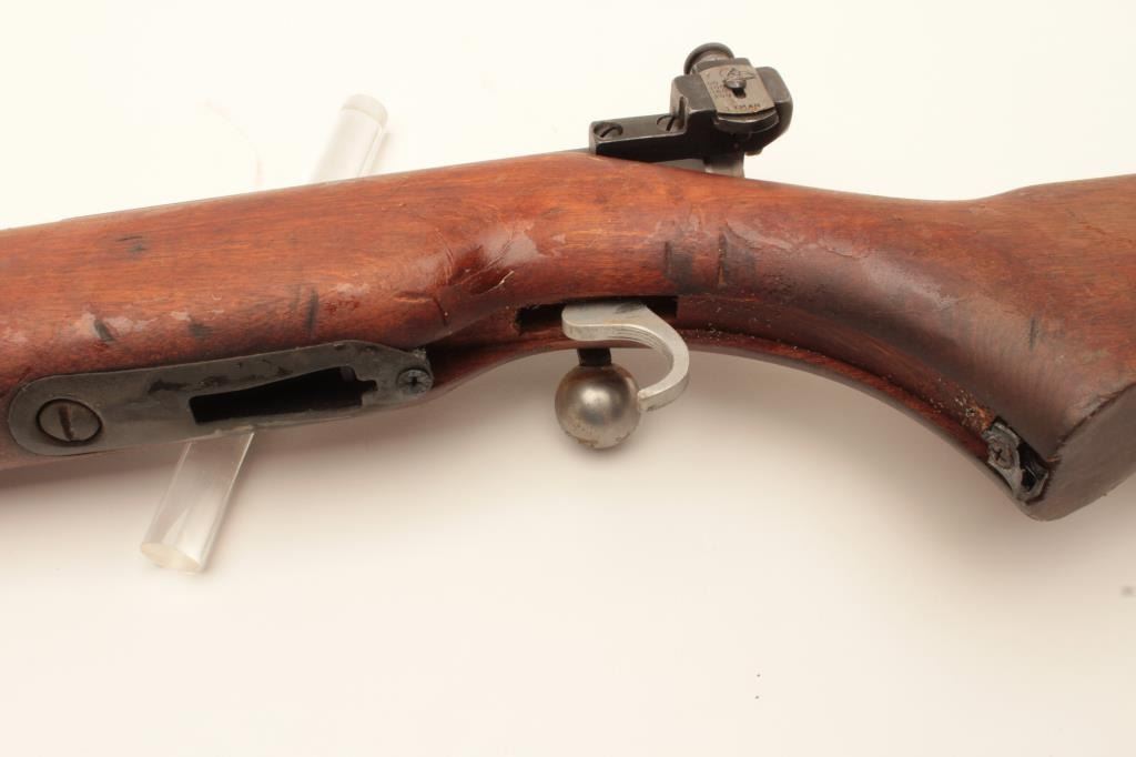 17KH-601 MOSSBERG 44Mossberg U.S. Property Model 44 bolt action rifle, .22LR caliber, parkerized finish, wood stock, missing magazine, S/N 117616; a project gun with dark bore that may clean, good action and markings, broken triggerguard that needs replacement, finish to wood stock is compromised but could be greatly improved with a careful stripping down to a basically good wood target stock. (C&R/PPT). Est.: $150-$300.Mossberg U.S. Property Model 44 bolt action rifle, .22LR caliber, parkerized finish, wood stock, missing magazine, S/N 117616; a project gun with dark bore that may clean, good action and markings, broken triggerguard that needs replacement, finish to wood stock is compromised but could be greatly improved with a careful stripping down to a basically good wood target stock. (C&R/PPT). Est.: $150-$300.