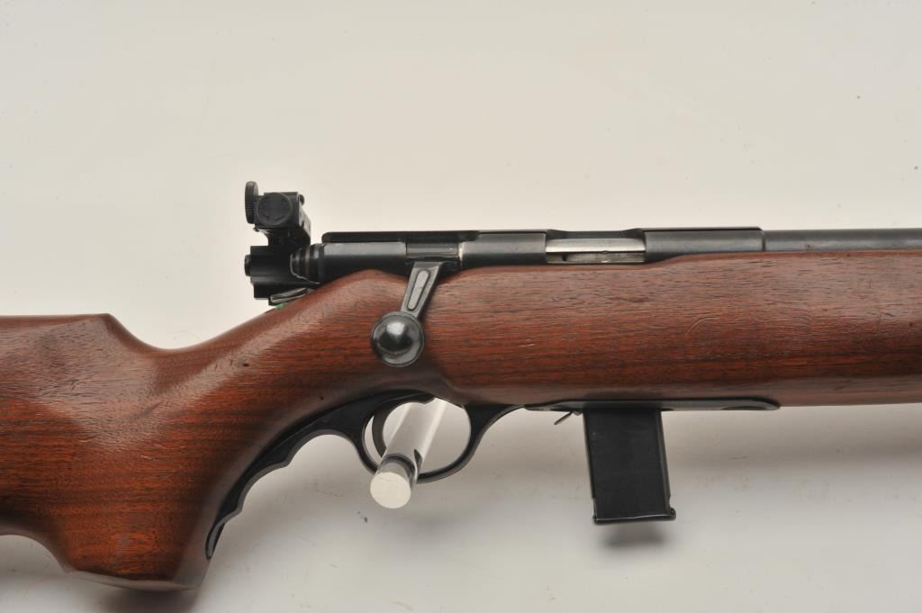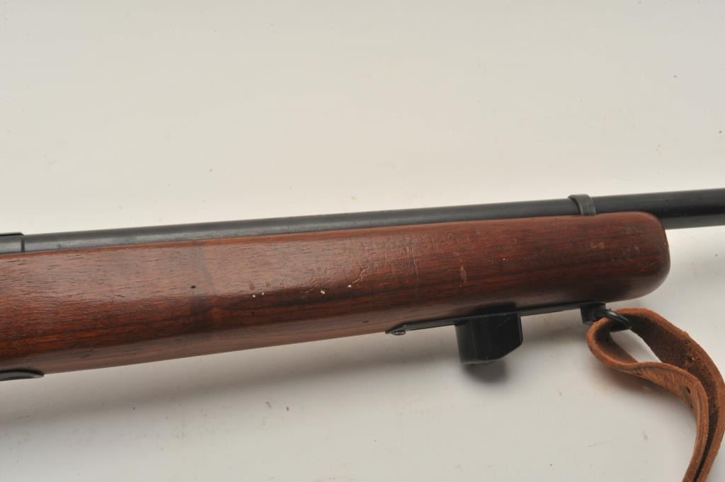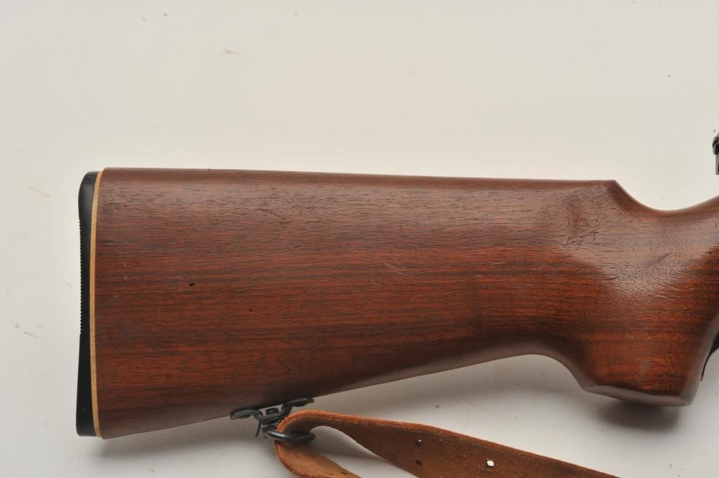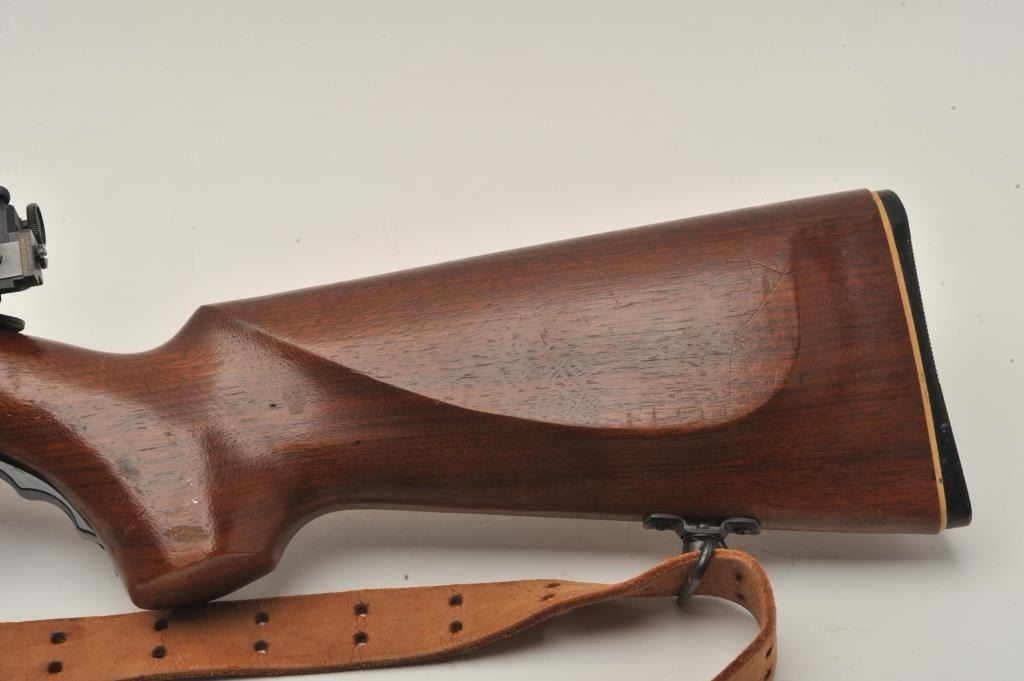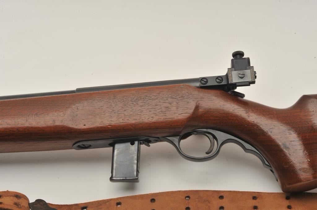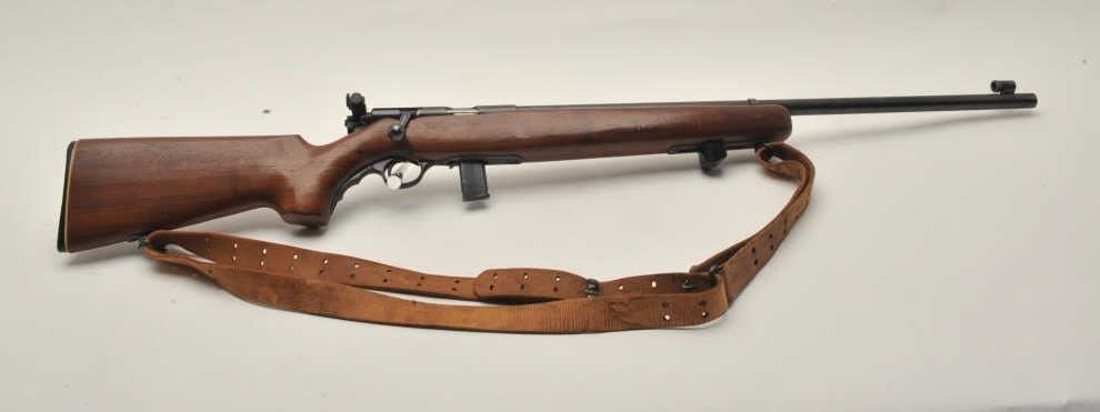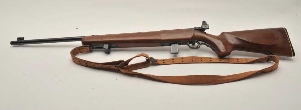 17KH-604 MOSSBERGMossberg Model 144LSA bolt action rifle, target sights, .22 short, long and LR caliber, 26” barrel, blued finish, wood stock, leather sling, no visible S/N, in overall very good + condition displayingmajority of original blued finish, crisp action and markings, very good + bore, good to very good wood stock. (C&R/PPT). Est.: $250-$500.Mossberg Model 144LSA bolt action rifle, target sights, .22 short, long and LR caliber, 26” barrel, blued finish, wood stock, leather sling, no visible S/N, in overall very good + condition displayingmajority of original blued finish, crisp action and markings, very good + bore, good to very good wood stock. (C&R/PPT). Est.: $250-$500.