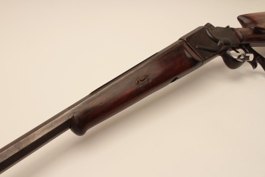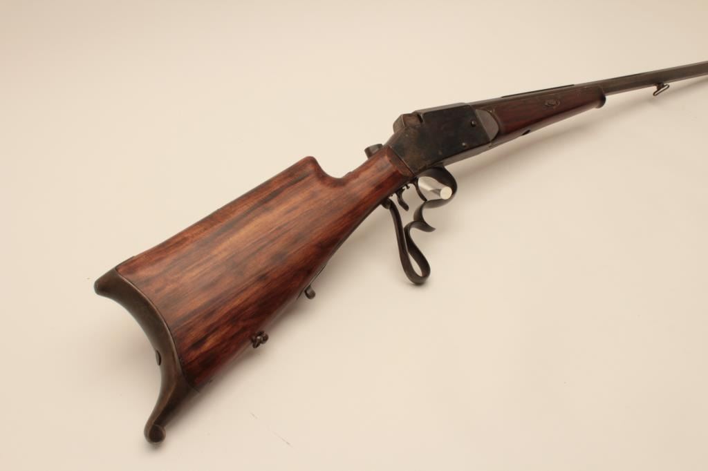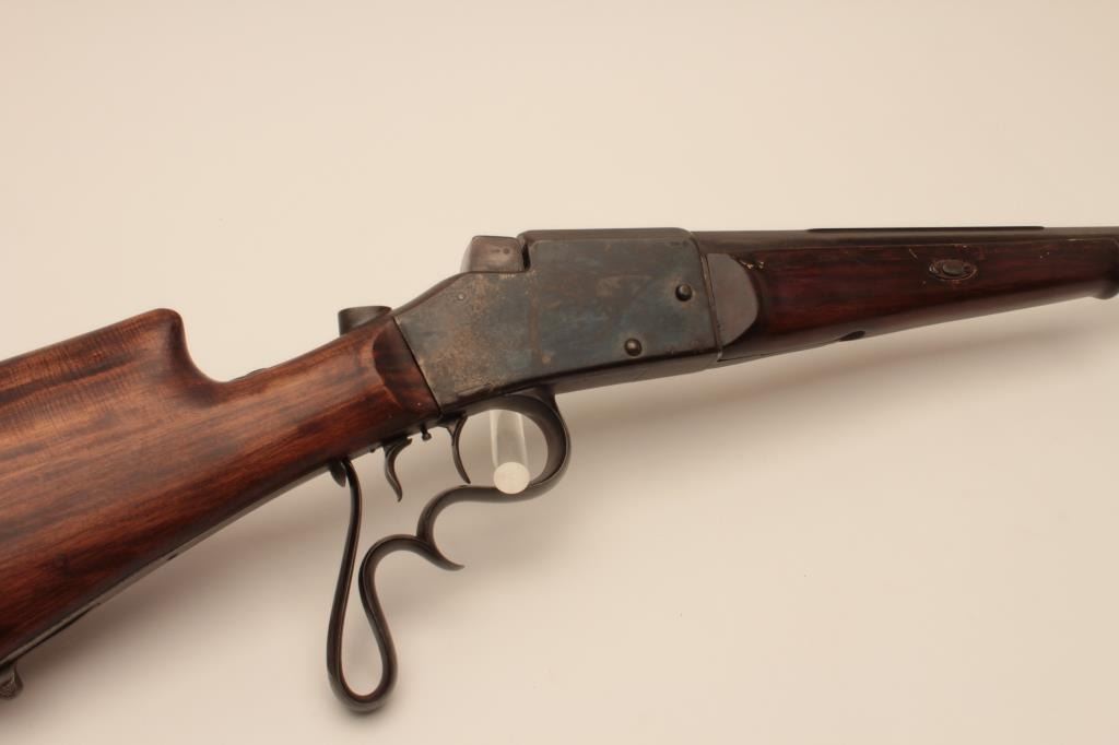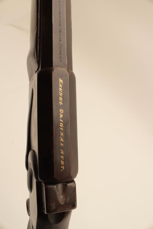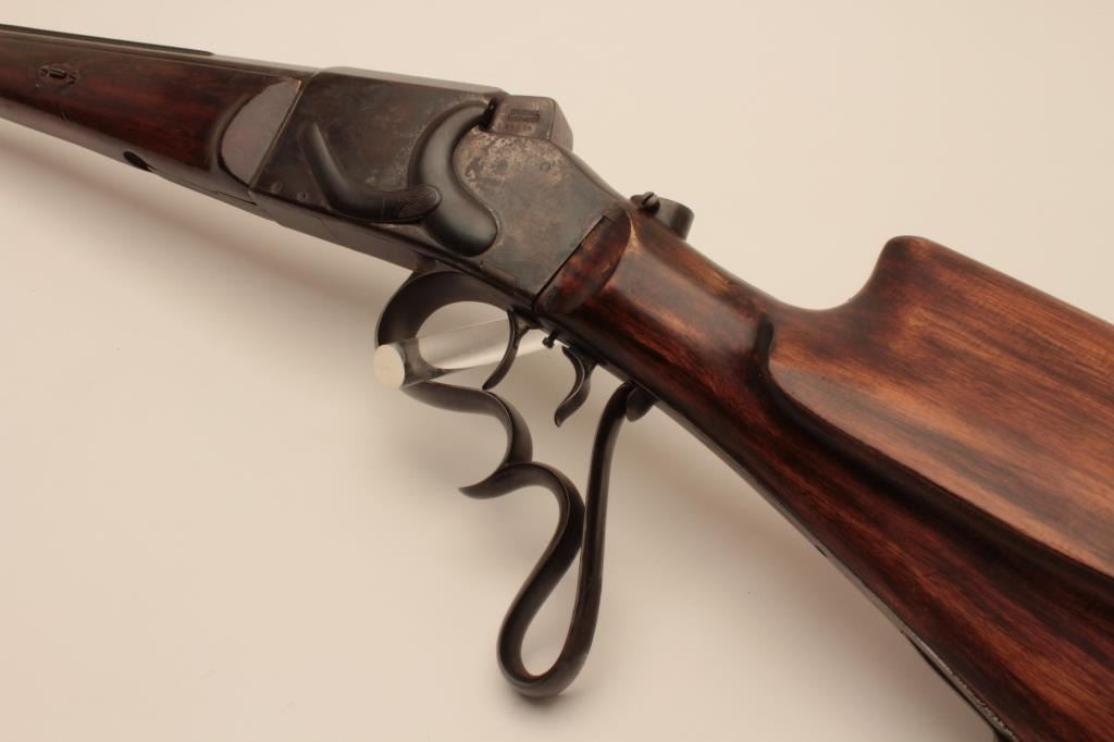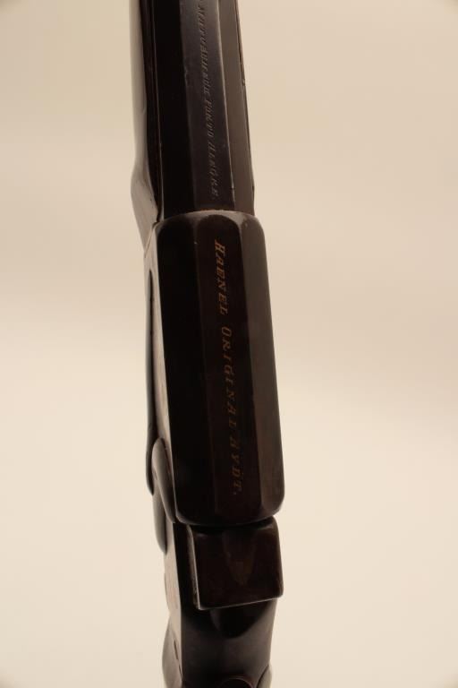 17KH-584 HAENEL SCHUTZENHaenel Schutzen target rifle, approximately .38 caliber, missing front and rear sights, dark brown patina on metal surfaces with traces of case colors on receiver, wood stocks, no visible S/N, several old repairsto forend, double set triggers (working at time of description), bore may clean to good. (Antique). Est.: $300-$600.Haenel Schutzen target rifle, approximately .38 caliber, missing front and rear sights, dark brown patina on metal surfaces with traces of case colors on receiver, wood stocks, no visible S/N, several old repairsto forend, double set triggers (working at time of description), bore may clean to good. (Antique). Est.: $300-$600.
