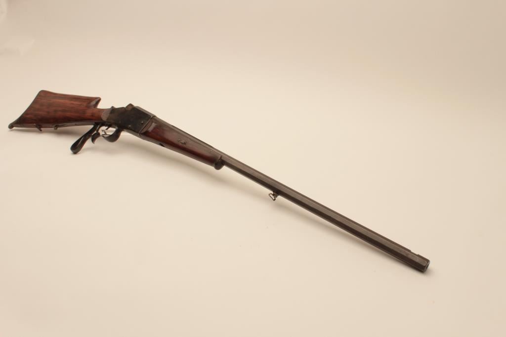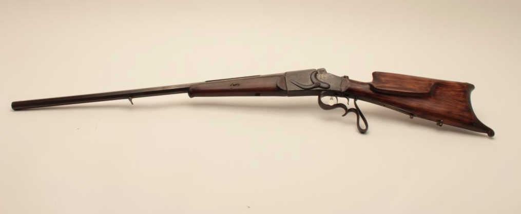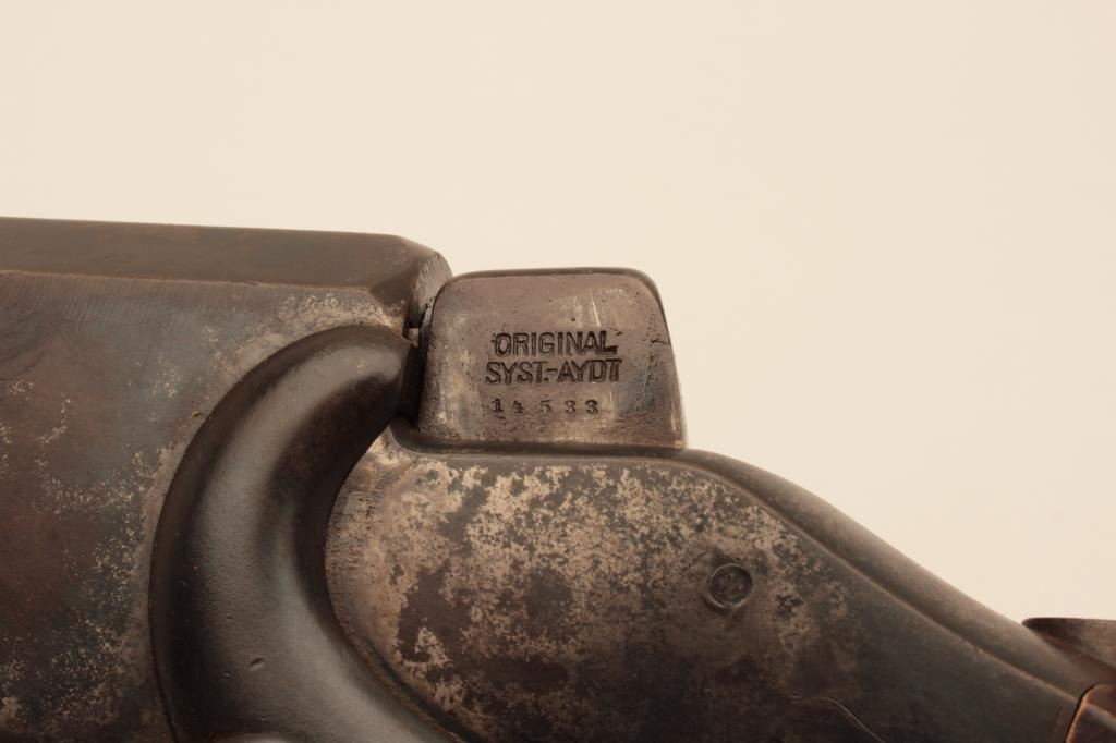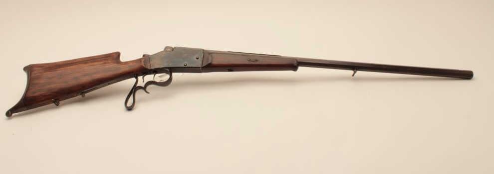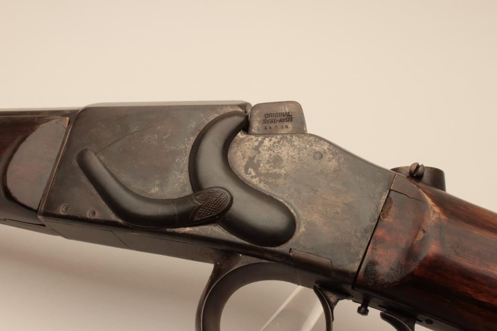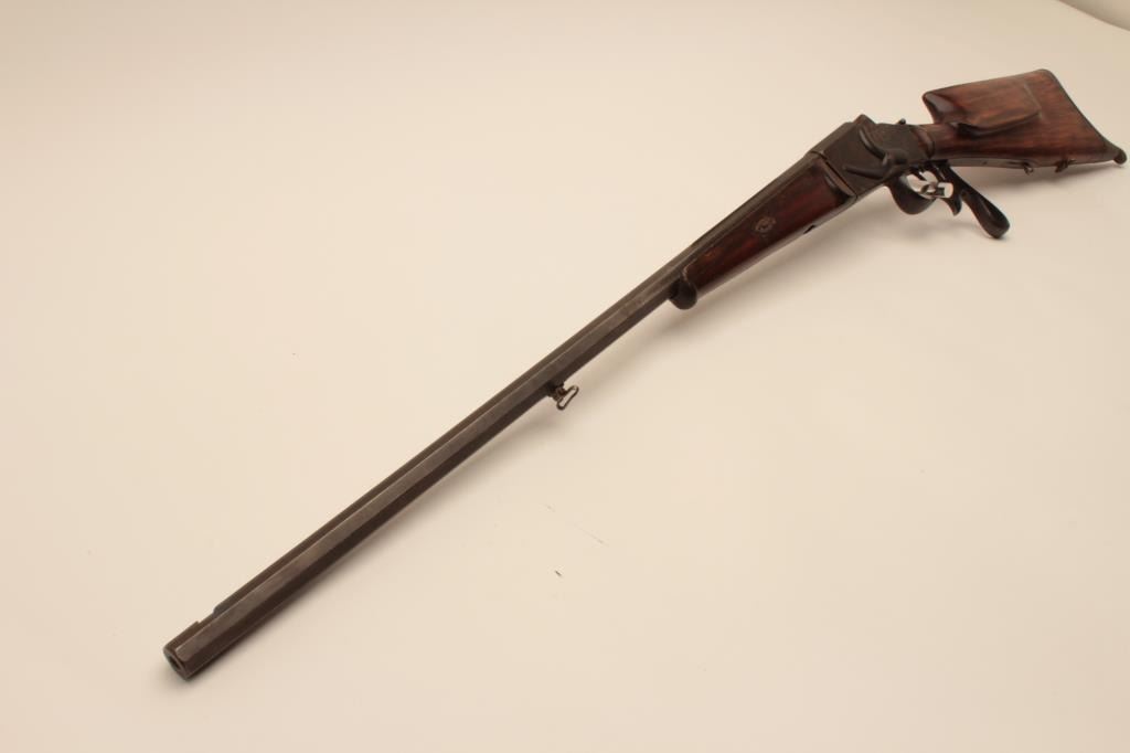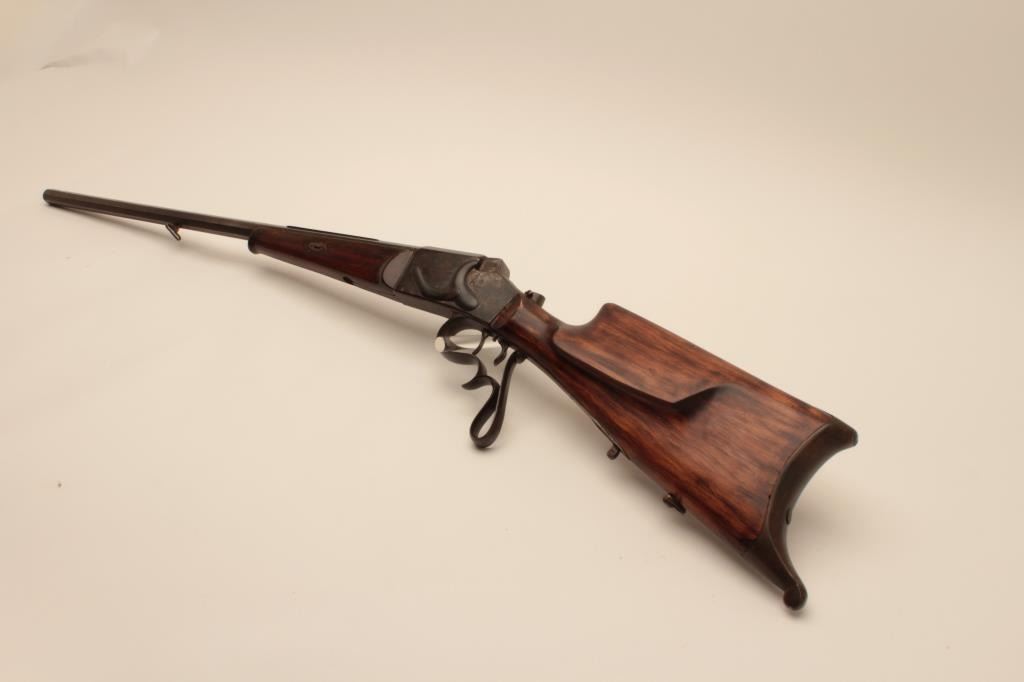 17KH-584 HAENEL SCHUTZENHaenel Schutzen target rifle, approximately .38 caliber, missing front and rear sights, dark brown patina on metal surfaces with traces of case colors on receiver, wood stocks, no visible S/N, several old repairsto forend, double set triggers (working at time of description), bore may clean to good. (Antique). Est.: $300-$600.Haenel Schutzen target rifle, approximately .38 caliber, missing front and rear sights, dark brown patina on metal surfaces with traces of case colors on receiver, wood stocks, no visible S/N, several old repairsto forend, double set triggers (working at time of description), bore may clean to good. (Antique). Est.: $300-$600.