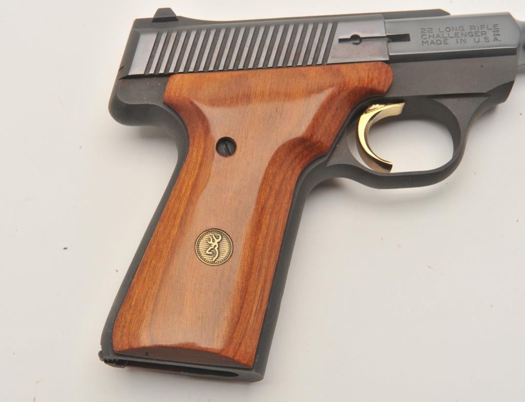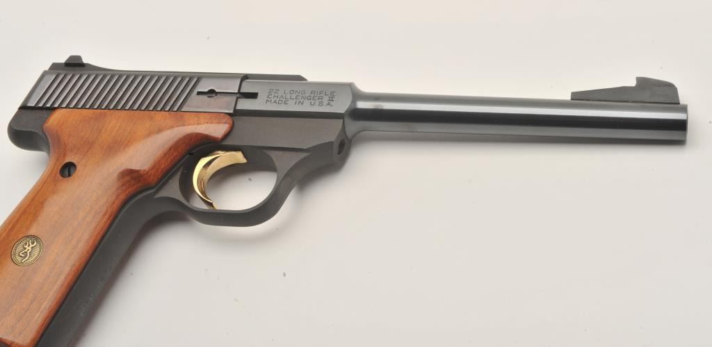 18AJ-6 CHALLENGER II #655PX09044Browning Model Challenger II semi-automatic pistol, .22LR caliber, 6.75” barrel, blued finish, smooth wood medallion grips, S/N 655PX09044, in like new condition with factory cardboard box and insert.(Modern/PPT). Est.: $275-550.Browning Model Challenger II semi-automatic pistol, .22LR caliber, 6.75” barrel, blued finish, smooth wood medallion grips, S/N 655PX09044, in like new condition with factory cardboard box and insert.(Modern/PPT). Est.: $275-550.