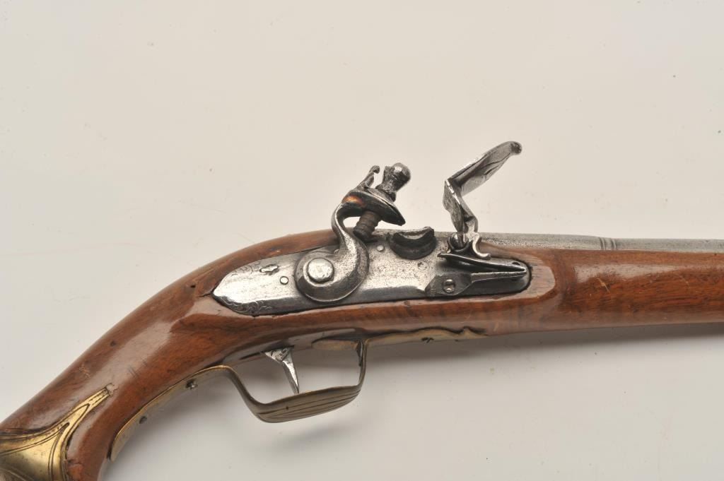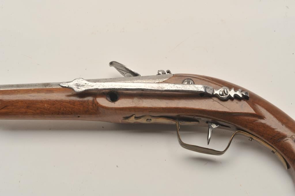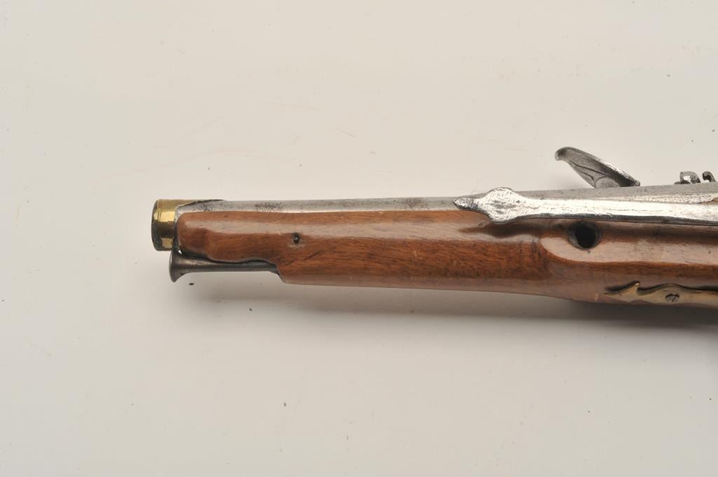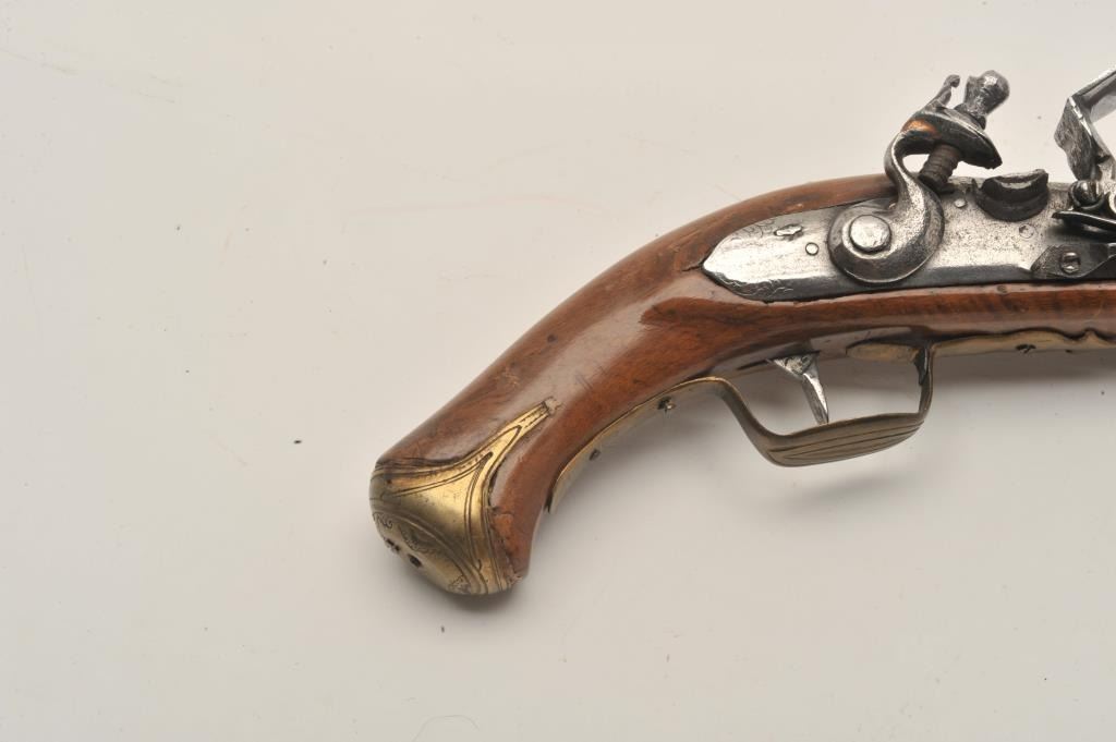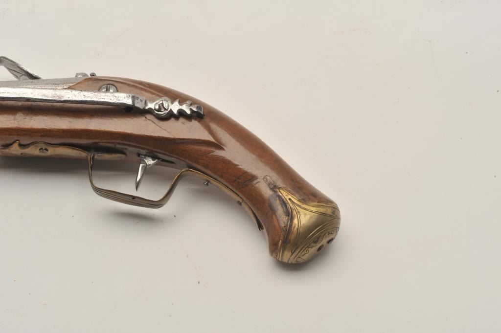 18AR-39 AUSTRIAN FLINTLOCKEuropean flintlock pistol circa early to Mid-18th century showing old restock and brass mountings. Measures 14” overall with a 8 ¼” barrel of .65 caliber smoothbore and a 6 ¼” early style belt hook. Missing cap to the brass butt and front lock plate screw. The pistol is early Italian in out opinion and was shortened and restocked in the 19th century. The metal is good but polished and stock refinished with small losses. Originalflintlock with correct small parts. (Antique) Est.: $350-$700European flintlock pistol circa early to Mid-18th century showing old restock and brass mountings. Measures 14” overall with a 8 ¼” barrel of .65 caliber smoothbore and a 6 ¼” early style belt hook. Missing cap to the brass butt and front lock plate screw. The pistol is early Italian in out opinion and was shortened and restocked in the 19th century. The metal is good but polished and stock refinished with small losses. Originalflintlock with correct small parts. (Antique) Est.: $350-$700