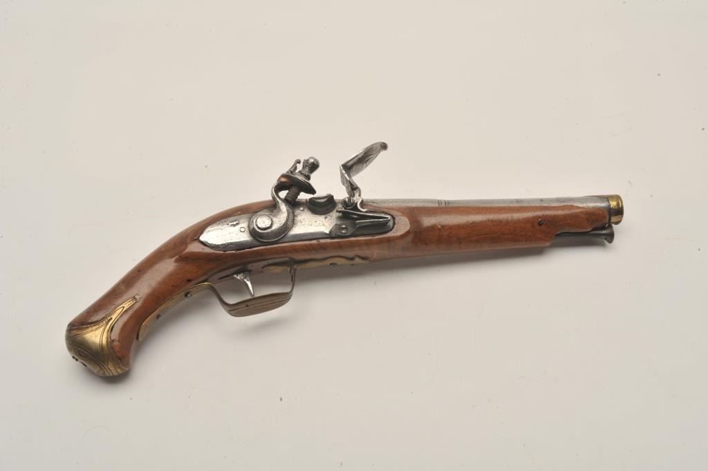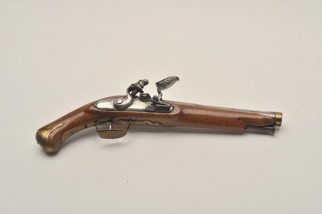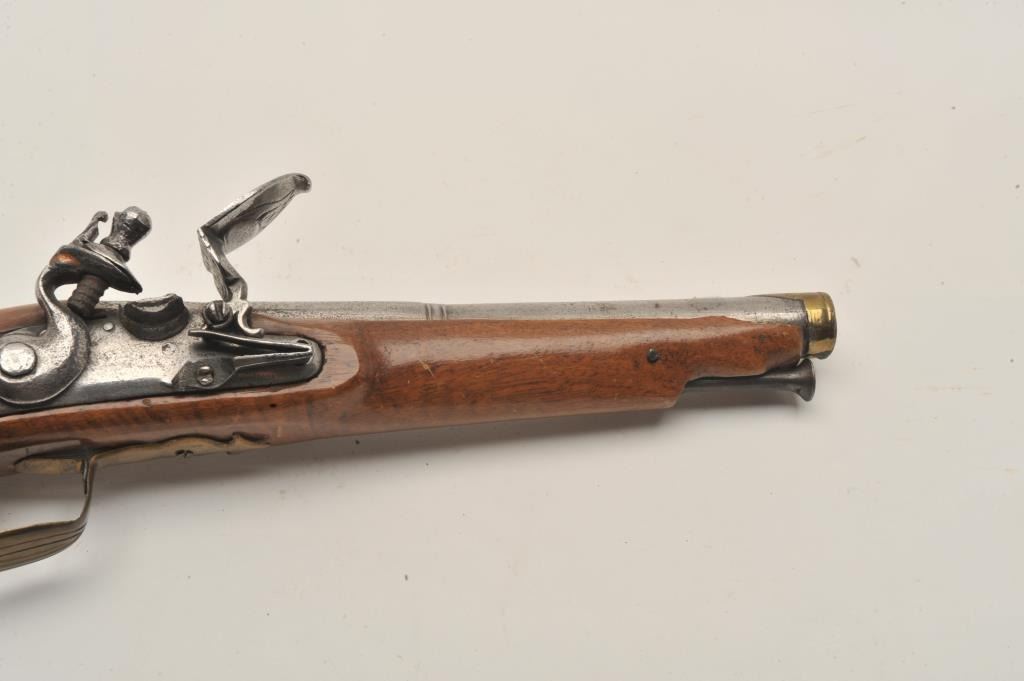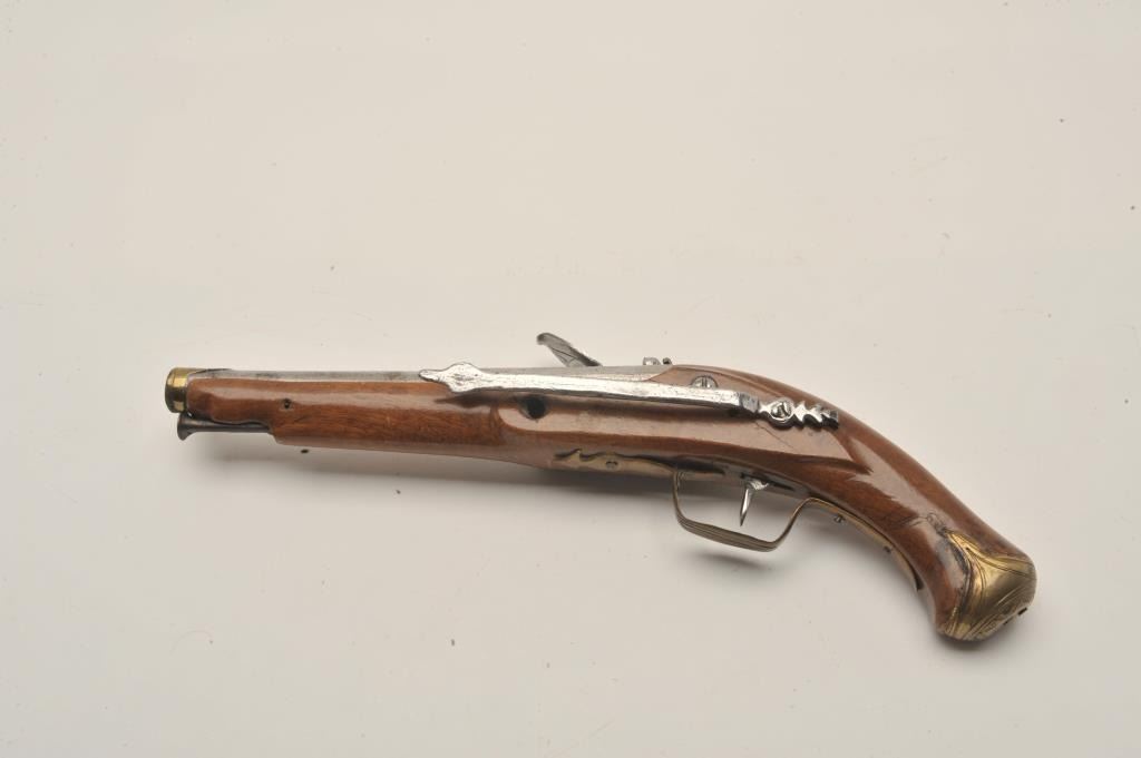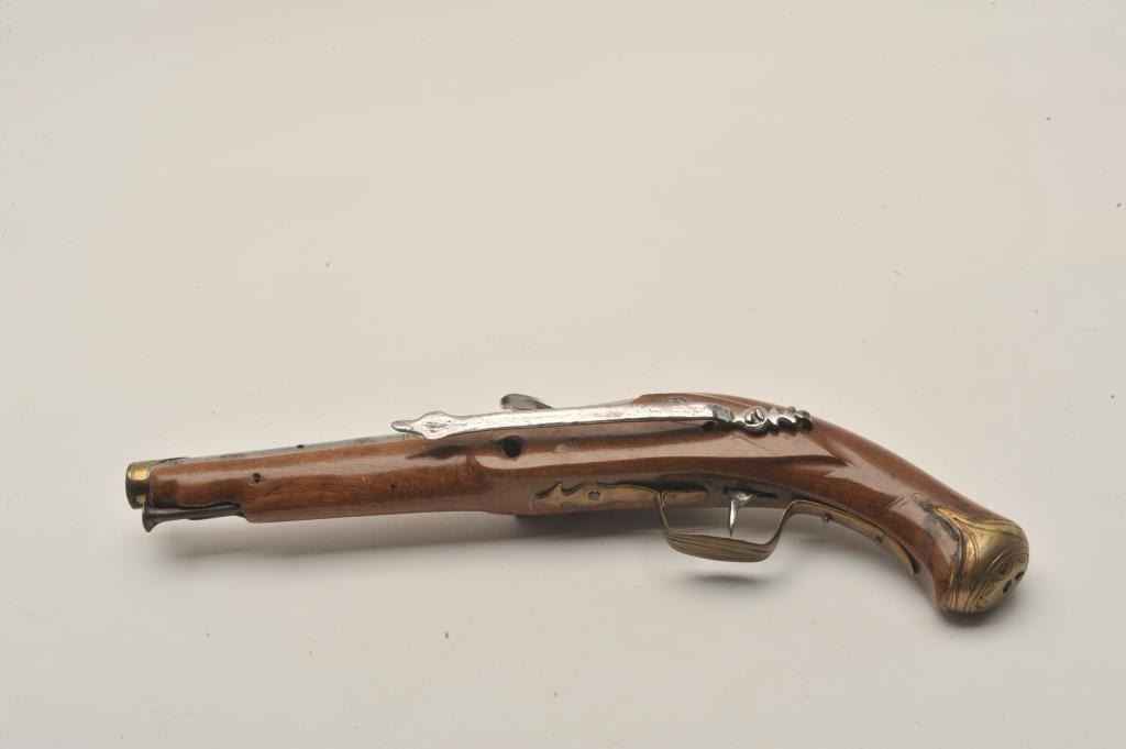 18AR-39 AUSTRIAN FLINTLOCKEuropean flintlock pistol circa early to Mid-18th century showing old restock and brass mountings. Measures 14” overall with a 8 ¼” barrel of .65 caliber smoothbore and a 6 ¼” early style belt hook. Missing cap to the brass butt and front lock plate screw. The pistol is early Italian in out opinion and was shortened and restocked in the 19th century. The metal is good but polished and stock refinished with small losses. Originalflintlock with correct small parts. (Antique) Est.: $350-$700European flintlock pistol circa early to Mid-18th century showing old restock and brass mountings. Measures 14” overall with a 8 ¼” barrel of .65 caliber smoothbore and a 6 ¼” early style belt hook. Missing cap to the brass butt and front lock plate screw. The pistol is early Italian in out opinion and was shortened and restocked in the 19th century. The metal is good but polished and stock refinished with small losses. Originalflintlock with correct small parts. (Antique) Est.: $350-$700