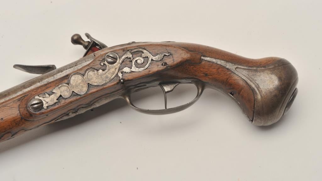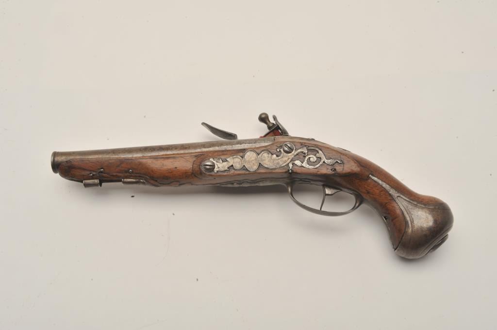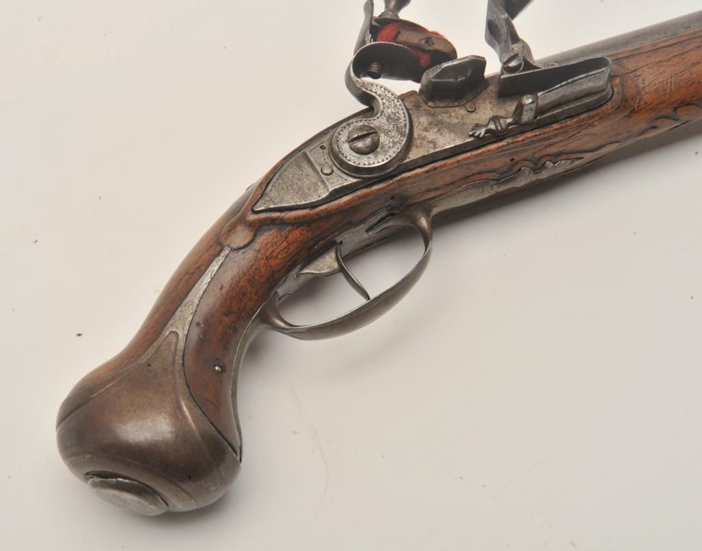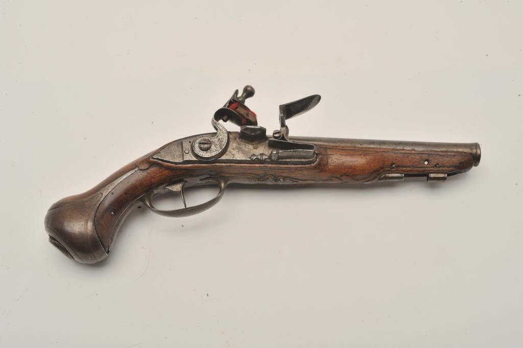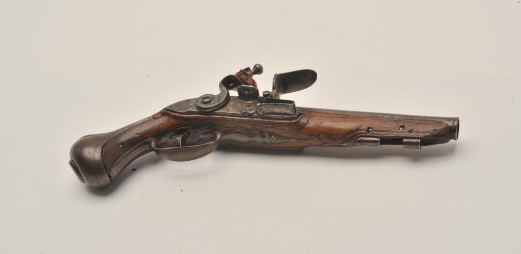 18AR-40 FRENCH FLINTLOCKFrench flintlock pistol, approximately 11” overall with a 6” barrel, wood stock, iron mounts, missing ramrod, in overall good condition with pleasing patina to metal surfaces, good wood, crisp action.(Antique). Est.: $400-$800.French flintlock pistol, approximately 11” overall with a 6” barrel, wood stock, iron mounts, missing ramrod, in overall good condition with pleasing patina to metal surfaces, good wood, crisp action.(Antique). Est.: $400-$800.