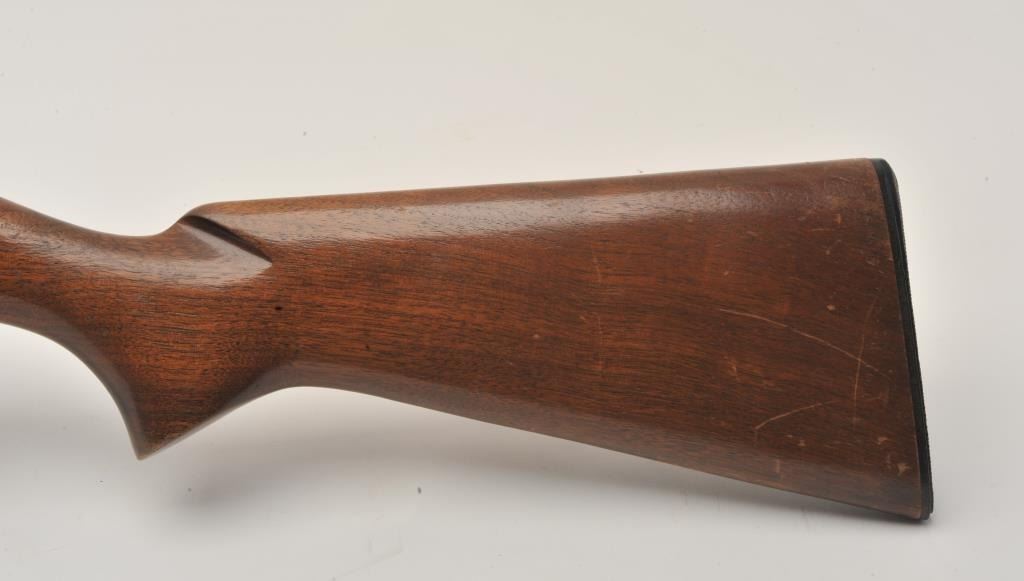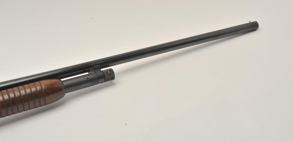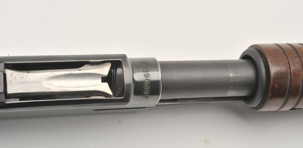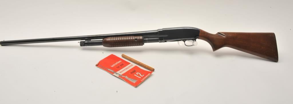 17MF-4 WINCHESTER MDL 12 #1796687Winchester Model 12 Featherweight pump shotgun, 12 gauge, Serial #1796687. The shotgun is in very good overall condition with a 30” barrel with a steel bead front sight. The barrel and receiver retain themajority of their blue finish with high point edge wear noted. The checkered wood stocks are in very good condition with small mars and some thinning of finish. The butt ends with a Winchester marked plastic butt plateproviding a 14” LOP. The bore is good, the action crisp and markings are sharp. Est.: $250-$500. (Modern).Winchester Model 12 Featherweight pump shotgun, 12 gauge, Serial #1796687. The shotgun is in very good overall condition with a 30” barrel with a steel bead front sight. The barrel and receiver retain themajority of their blue finish with high point edge wear noted. The checkered wood stocks are in very good condition with small mars and some thinning of finish. The butt ends with a Winchester marked plastic butt plateproviding a 14” LOP. The bore is good, the action crisp and markings are sharp. Est.: $250-$500. (Modern).