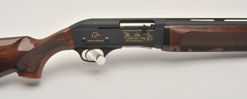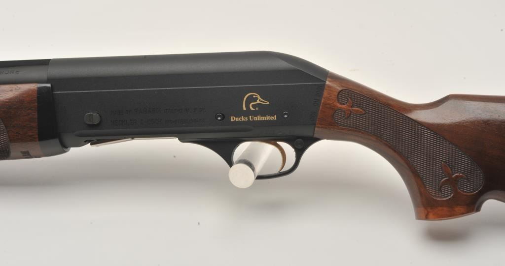 17MH-72 FAB ARM #0619DU2001Italian Fabarm semi-automatic shotgun made for H&K and Ducks Unlimited, 12 gauge, mat black finish, ventilated rib barrel, checkered wood stocks, Ducks Unlimited gold decoration to receiver, S/N 0619 DU 2001, inoverall very good to fine condition with a fine bore, majority of original finish, very good + wood stocks. (Modern/PPT). Est.: $250-$500.Italian Fabarm semi-automatic shotgun made for H&K and Ducks Unlimited, 12 gauge, mat black finish, ventilated rib barrel, checkered wood stocks, Ducks Unlimited gold decoration to receiver, S/N 0619 DU 2001, inoverall very good to fine condition with a fine bore, majority of original finish, very good + wood stocks. (Modern/PPT). Est.: $250-$500.