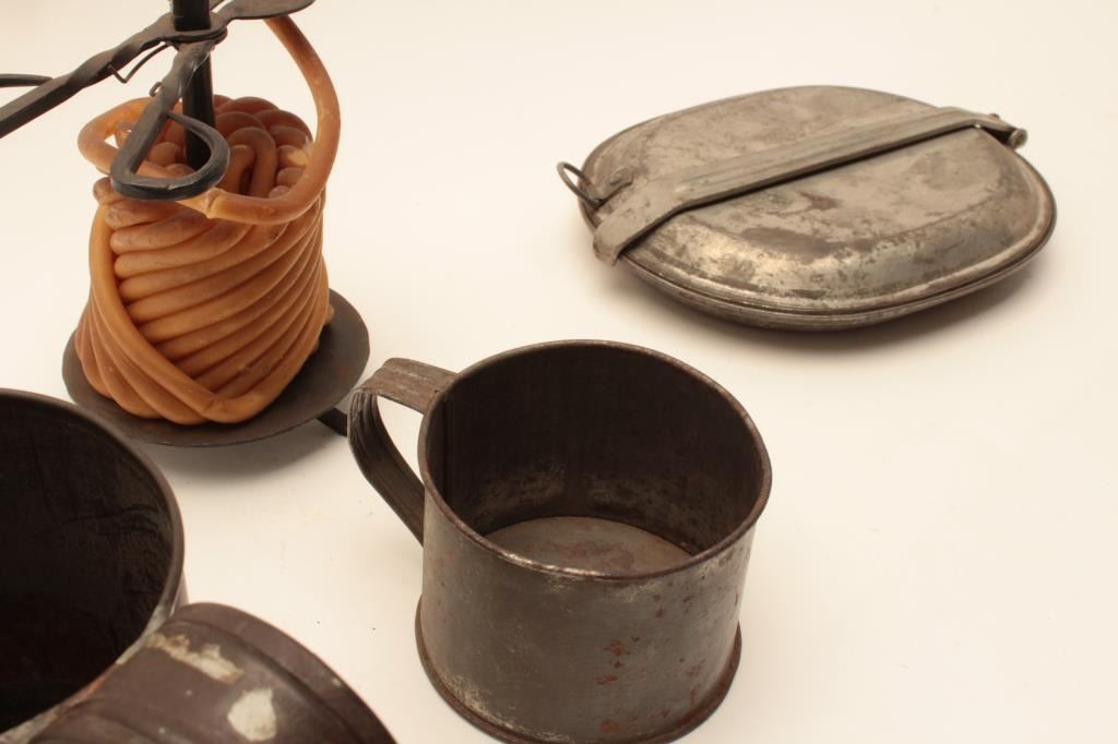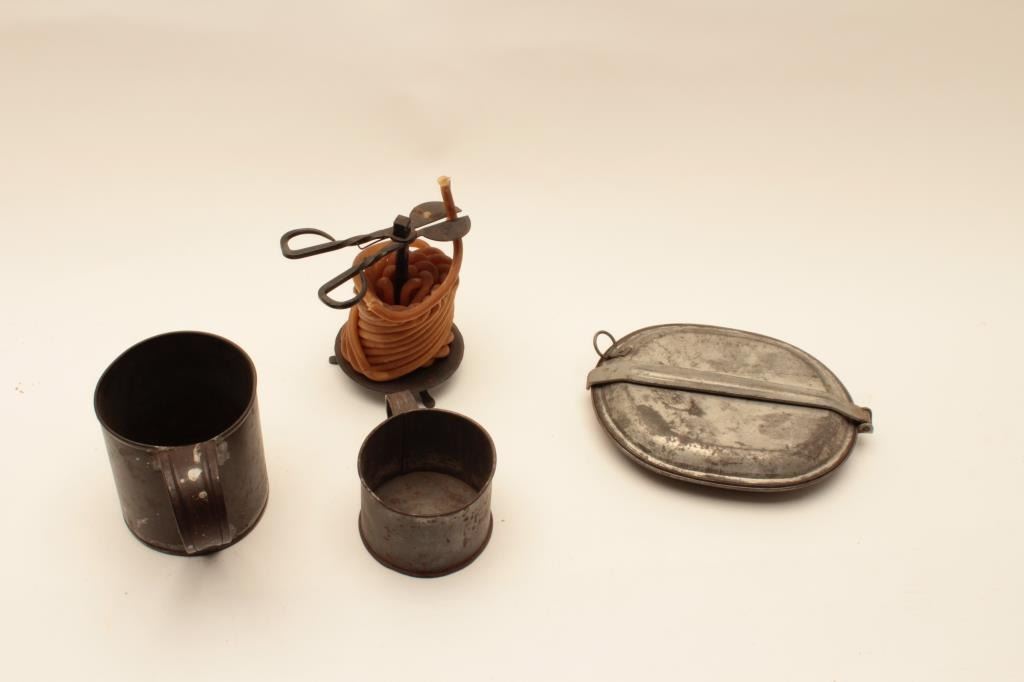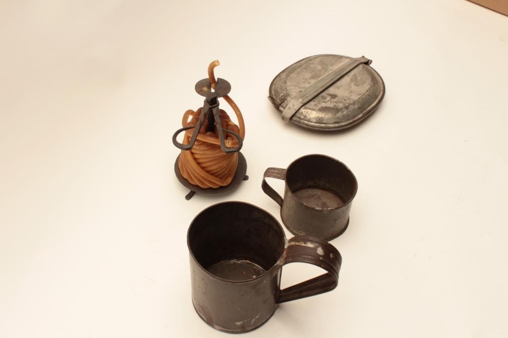 18AL-30 MISC. LOTMisc. lot including two different size tin cups, a tin mess kit and a wax “jack” with cutter, ca. mid 19th Century. Est.: $100-$200.Misc. lot including two different size tin cups, a tin mess kit and a wax “jack” with cutter, ca. mid 19th Century. Est.: $100-$200.
